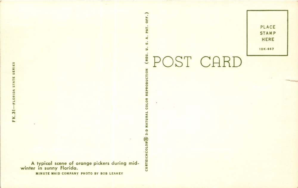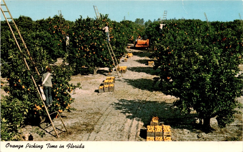 This postcard depicts a typical scene of orange pickers during mid-winter in Florida. The image captures the orange picking time in the sunny state, showcasing workers in the midst of harvesting oranges. The photo is credited to Bob Leahey and is associated with the Minute Maid Company.Florida is known for its citrus industry, particularly oranges.