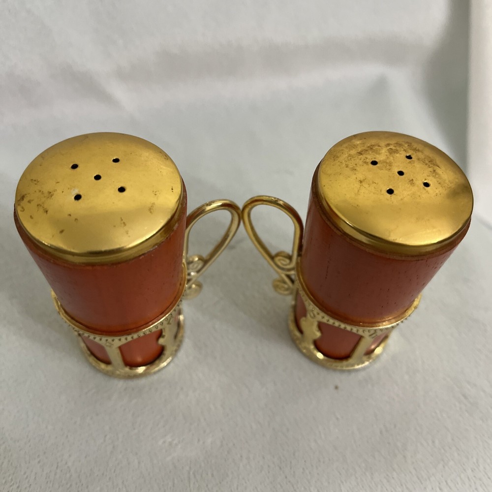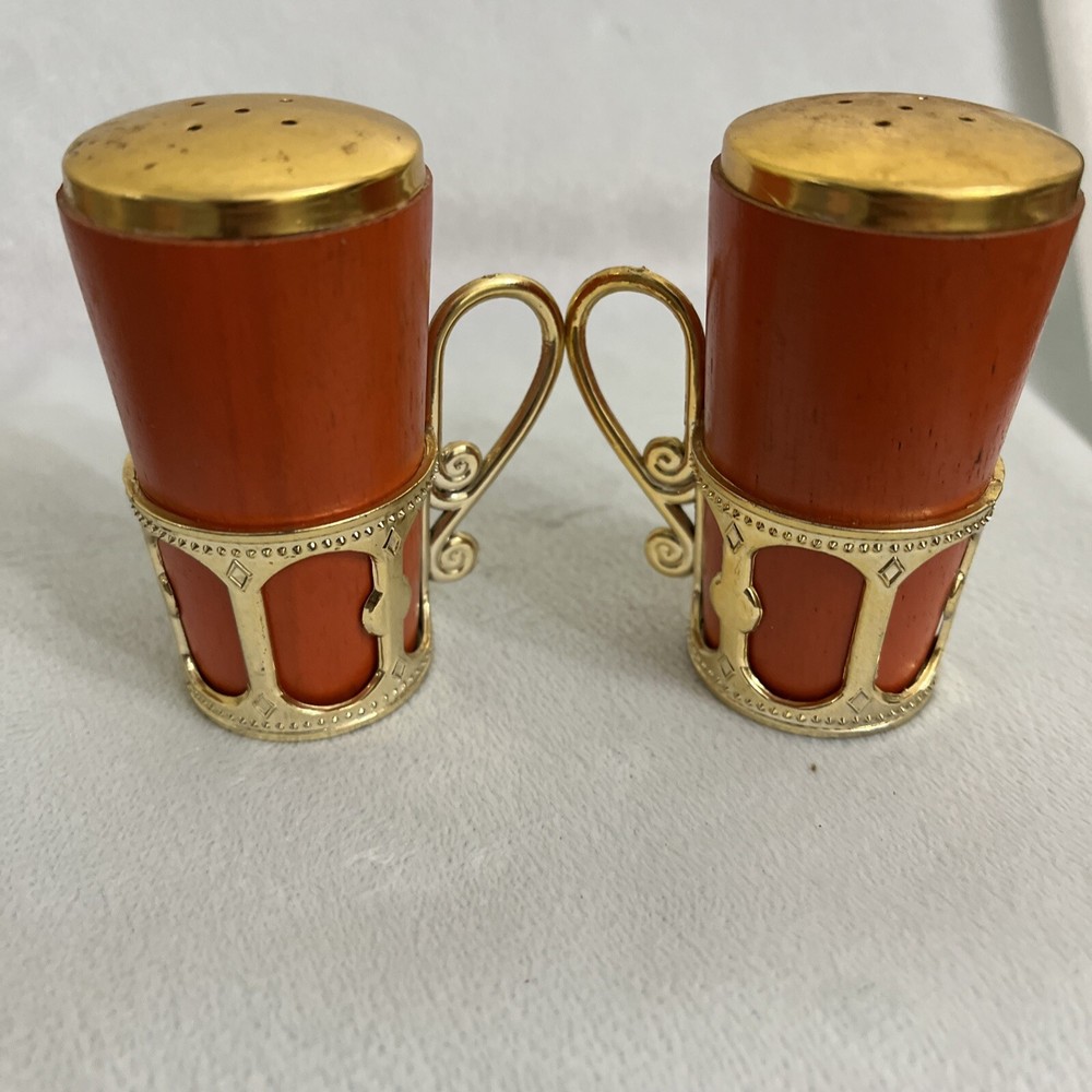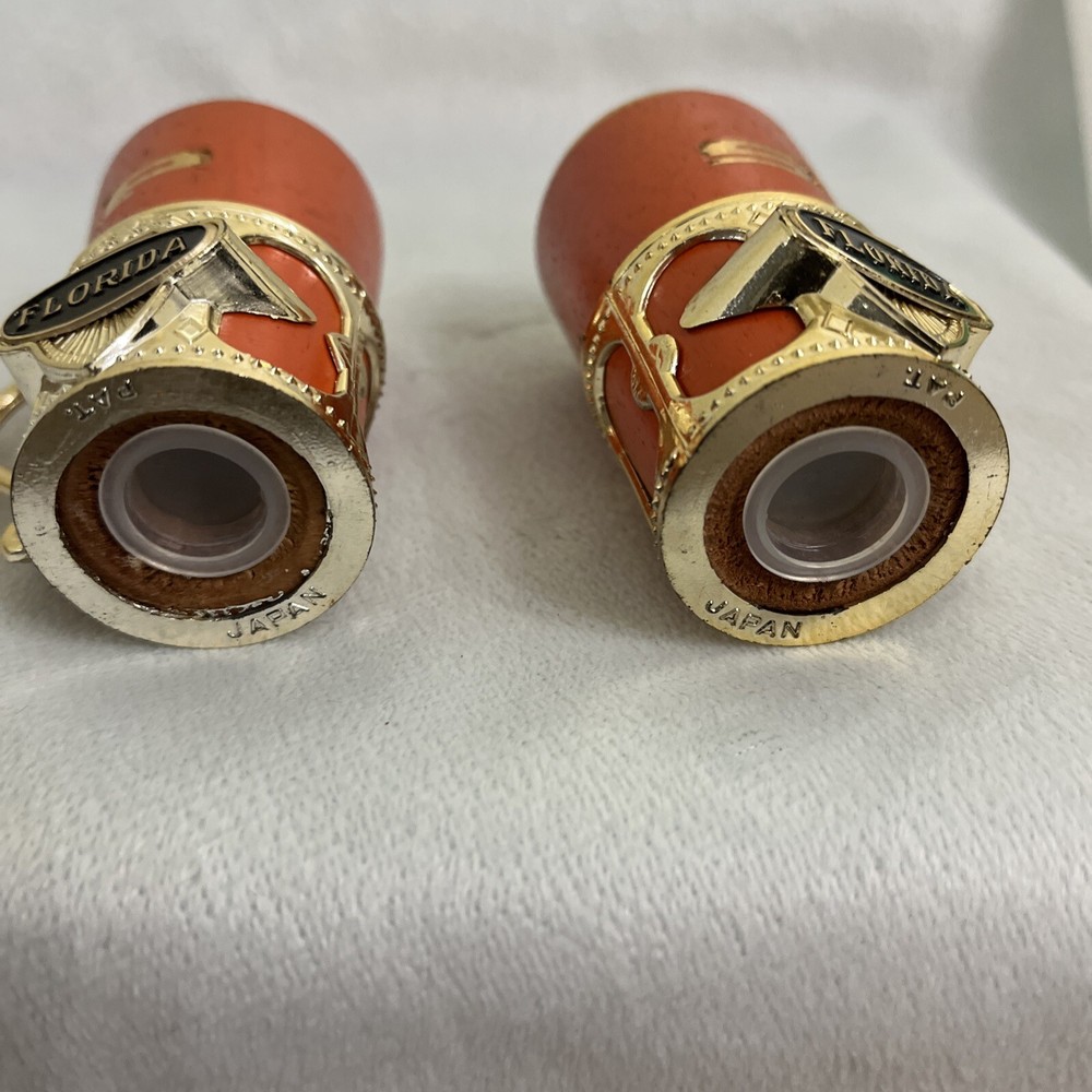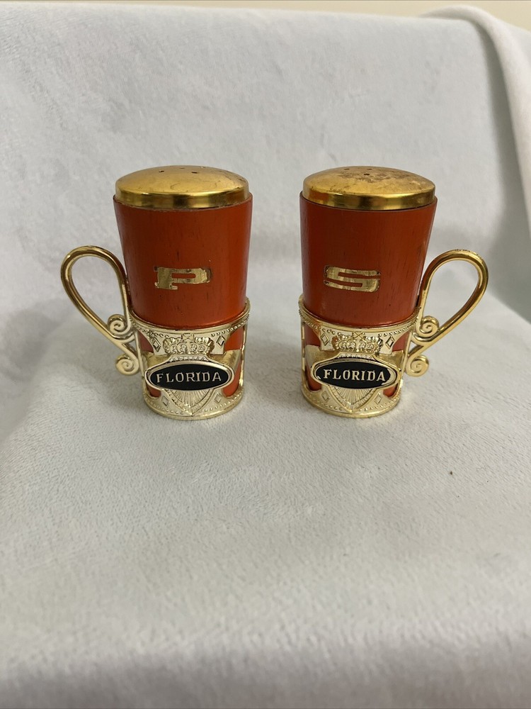 This pair of Florida Souvenir salt shakers are orange painted wood with gold foil metal holders. The holders have "Japan" stamped on the bottom, with ear handles and "Florida" in black. These have a mid-century look to them with the shape and color, as well as the lettering for "S" and "P". These are approx 2.5" tall, they are in good vintage condition as pictured. Free shipping to USA.