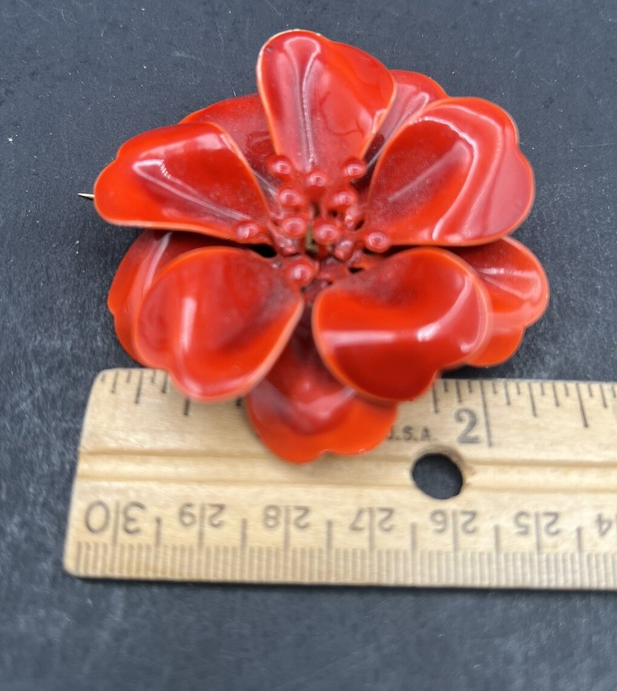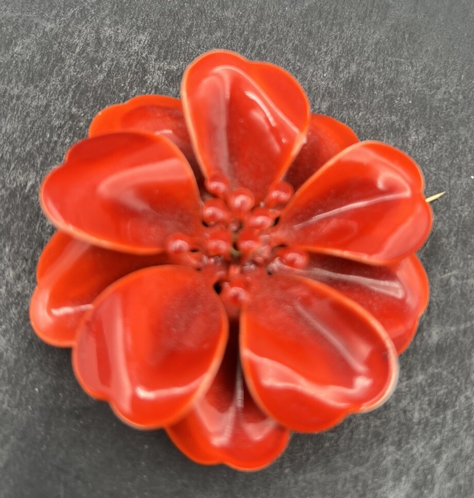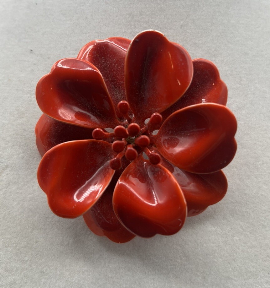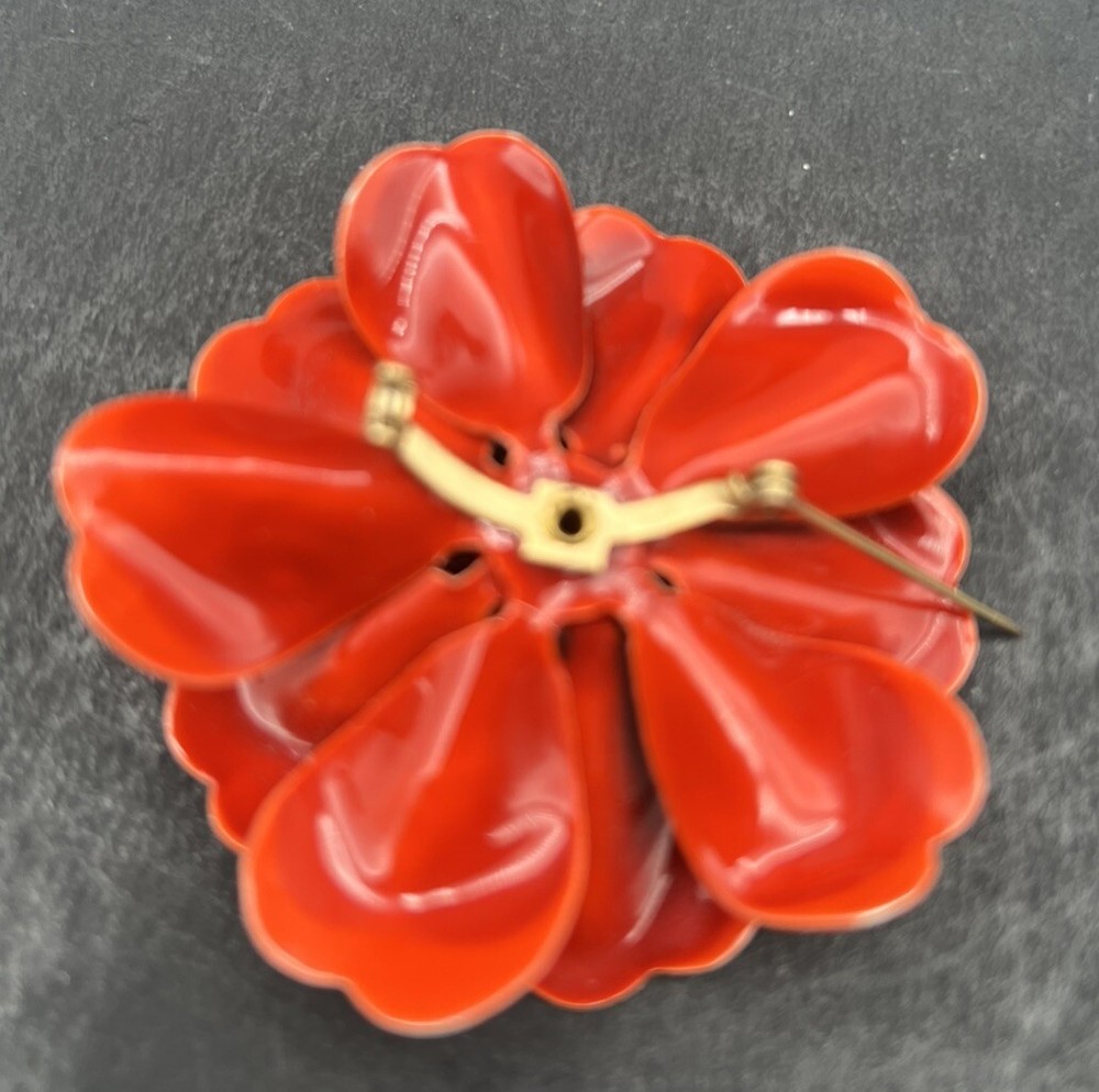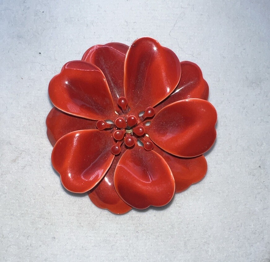 Add a touch of vintage charm to your outfit with this beautiful Flower Brooch Pin. The bright orange enamel petals are a stunning contrast to the intricate flower shape, making it a perfect statement piece. This mid-century modern style brooch is perfect