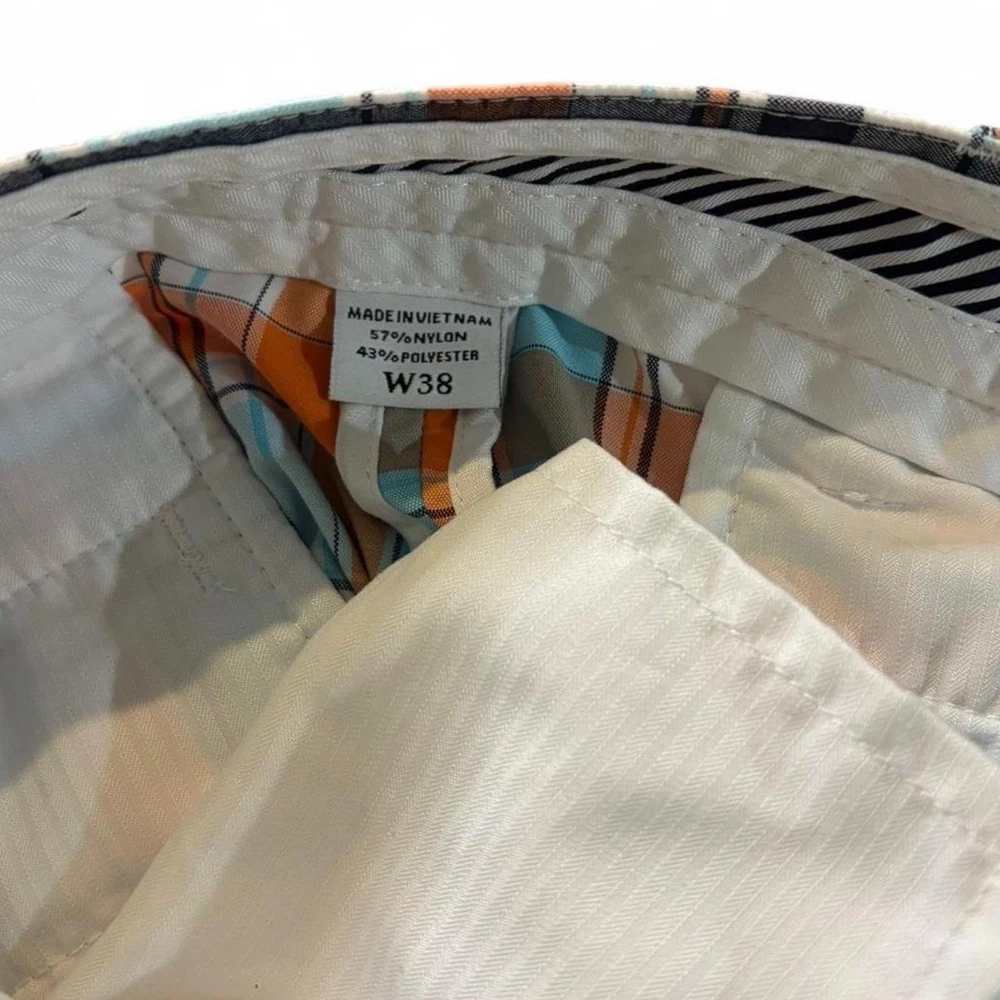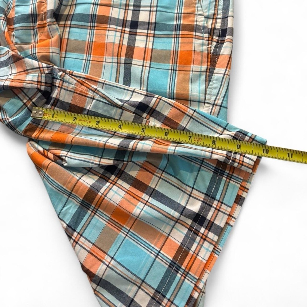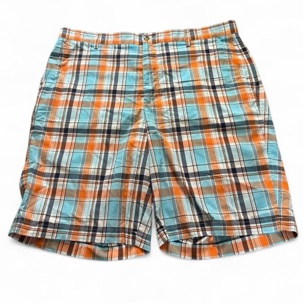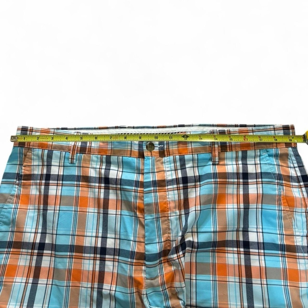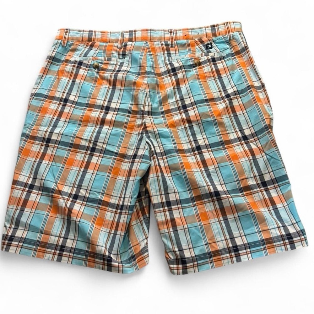 Elevate your golf wardrobe with these stylish FootJoy men's golf shorts in size 38. Designed with a mid-rise waist and a flat front, these shorts feature a vibrant orange and blue plaid pattern that is perfect for casual occasions. Whether you're hitting the course or just looking for a comfortable pair of shorts for a day out, these FootJoy shorts are a great choice. With their regular fit and chino style, they are sure to become a go-to in your wardrobe. So why wait? Add these plaid shorts to your collection today!