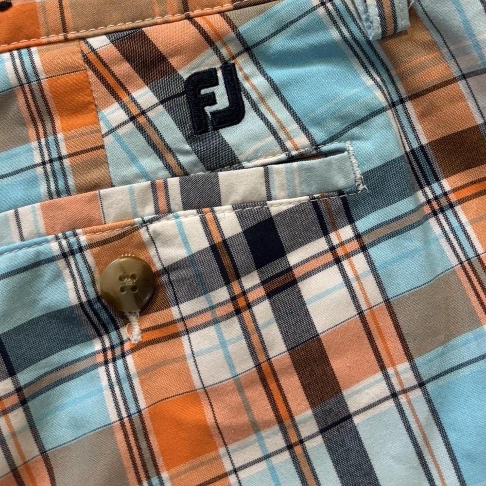 These FootJoy golf shorts are a game-changer! The orange and blue plaid adds a fun pop of color, while the mid-rise fit and flat front keep them looking sharp. Super comfortable for golfing or casual wear, with great pockets for convenience. The chino style makes them versatile, and the quality is top-notch. A must-have for any golfer’s wardrobe!