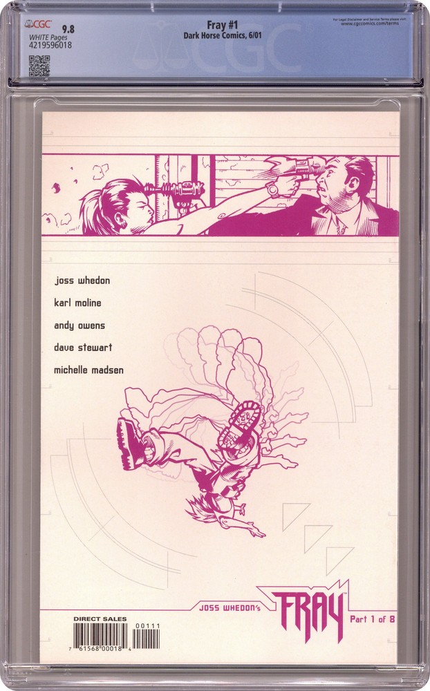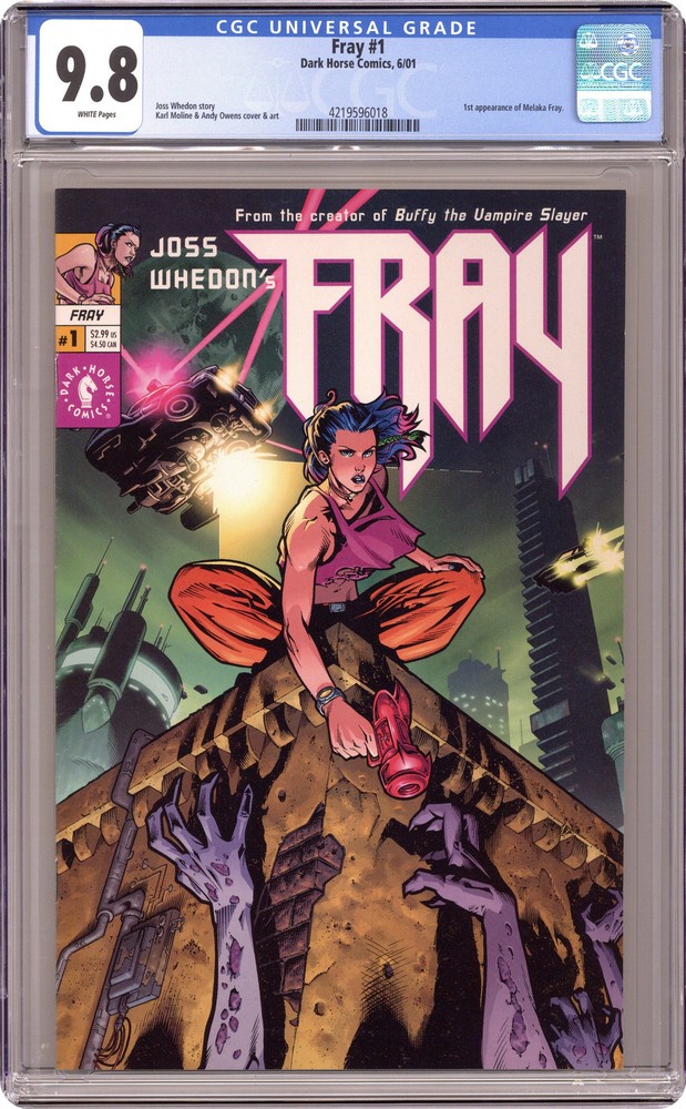 Menu Categories Featured Comics New Comics Comic Book Value Packs Key Comics & First Appearances Pre-Code Horror Comics Good Girl Art Comics Promotional Comics Comics Pre-1940 Comics 1940s Comics 1950s Comics 1960s Comics 1970s Comics 1980s Comics 1990s Comics 2000s Comics 2010-Curent Other Comics Graphic Novels, Books Fanzines Vintage Paperbacks Pulps and Digests Men's Adventure Non-comic Magazines Fray 1A MOLINE CGC 9.8 2001 4219596018 Grade CGC 9.8 Page Quality White Year 2001 Publisher Dark Horse Any CGC case may have minor imperfections including Newton rings, scuffs, standard surface wear, or minor cracks. CGC considers these defects acceptable, as do we. If there is any significant damage to the slab it will be noted in our description, and we will not list any slabbed comics with a damaged case that compromises the integrity of the grade. Description by JOSS WHEDON, KARL MOLINE, and ANDY OWENS;cover by KARL MOLINE and ANDY OWENS You've never seen a world like this, and neither has she. She's Melaka Fray, a beautiful, young girl that's about to meet her destiny, whether she wants to or not. In the future, the world is a manmade, hopeless hell. Add to that vampires, demons and other grim, supernatural threats that cower in shadows and skulk late-night streets. When the forces of darkness come calling, Fray will be transformed from street urchin of a disposable society to its only savior. And, heaven help her if she fails. Joss Whedon, the creator of Buffy the Vampire Slayer, makes his comics debut with this epic, new, eight-issue series! This is Whedon's comic writing debut, and ONLY DARK HORSE HAS HIM! Don't miss this visionary series by one of the hottest creative talents in or out of comics! FC, 32pg (1 of 8) . . . $2.99 This item is a consignment This item is a consignment, which means that the price has been set by the consignor rather than by MyComicShop. It is located at our headquarters and ships just as quickly as everything else we carry. Grading & Packing We take pride in our accurate, consistent grading. You can be confident in receiving a well-graded comic when ordering from us. We understand that condition is important to collectors. We pack your comics with professional care and high-quality packaging to insure your purchase reaches you safely. About Us We opened our first comic retail store in 1977 and operated a chain of eight comic book stores in the 80s, 90s, and 2000s before going online-only. We are the world's largest comic book seller and the biggest and most trusted comic seller on eBay with over 3.6 million comics sold. We Buy & Consign We buy tens of thousands of comics every month from collections large and small, old and new. We also accept consignments and will get your comics listed on eBay for you. Check out our website for more info. Copyright © 2025 MyComicShop & Lone Star Comics. All rights reserved.