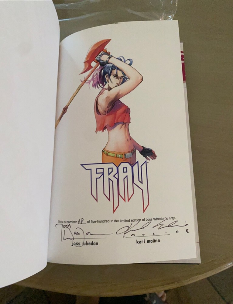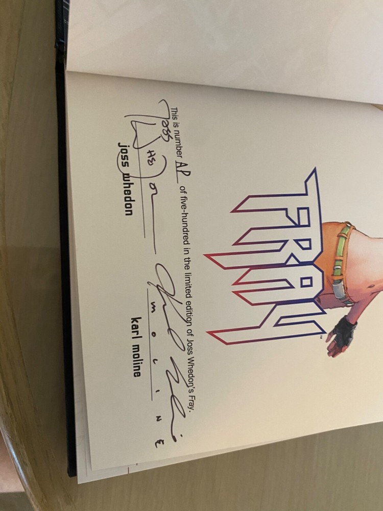 This 1st edition hard cover is signed by Joss Whedon and Karl Moline. It is a limited edition of only 500 copies, but this one is a little more rare, as it’s an Artists Proof (AP). The book is in mint condition and the only page ever turned is when I took the pictures of the autographs. Free shipping USPS priority, insured. Will ship to lower 48 states only.