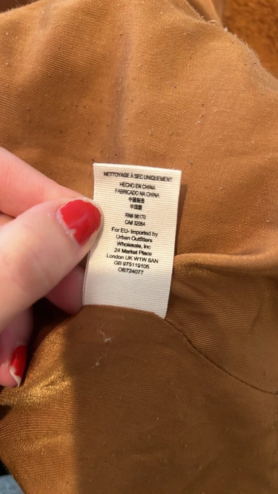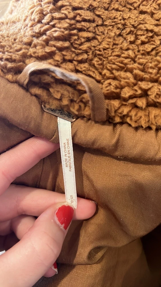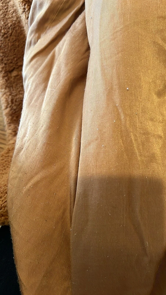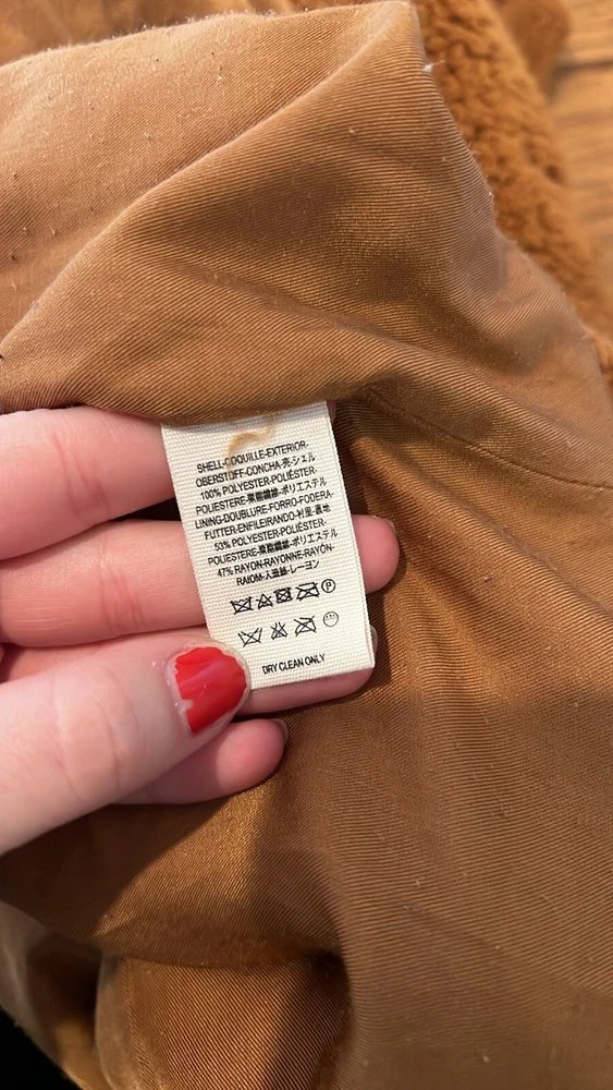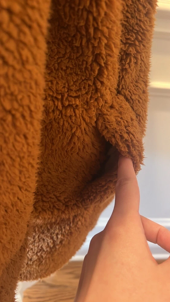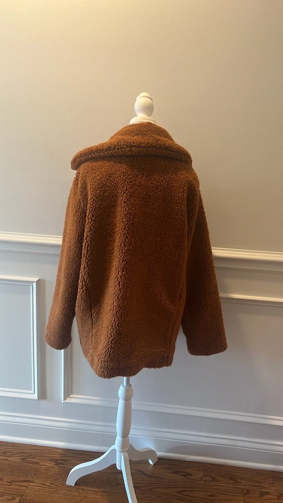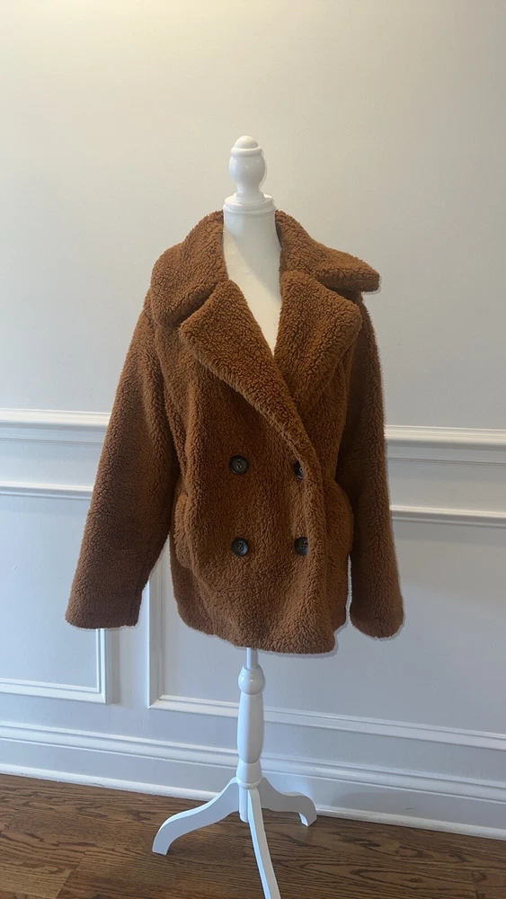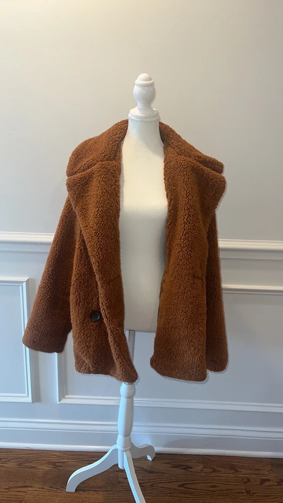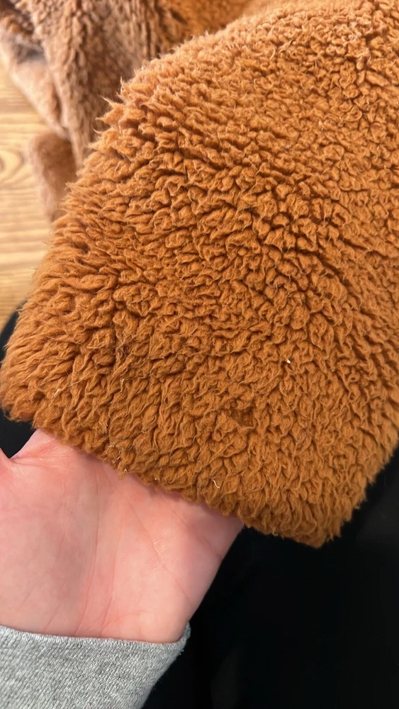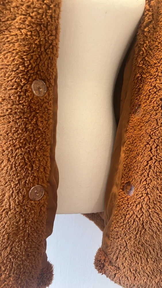 So cute and cozy! Pockets on each side. Long sleeves. Boxy fit and great for layering. Four brown exterior buttons with four clear internal buttons as well. Super soft teddy material on the exterior - has some minor patches that are more matted - like by the wrist - but BARELY and price reflects. Some piling on the interior, not noticeable when worn. Small hole on the inside of a pocket that does not impact wear. Moving to a warmer state - my loss is your gain!