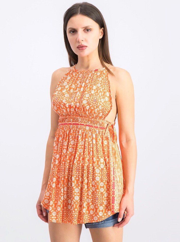 Free People Mid Summers Day Tunic Top, Orange X-Small, RRP $98 New without tags High round neckline; Sleeveless; Relaxed with Floral motif; hi-low hem and tie closures at sides lightweight and flowy; looks amazing with skinny jeans, leggings or cut off shorts so versatile;