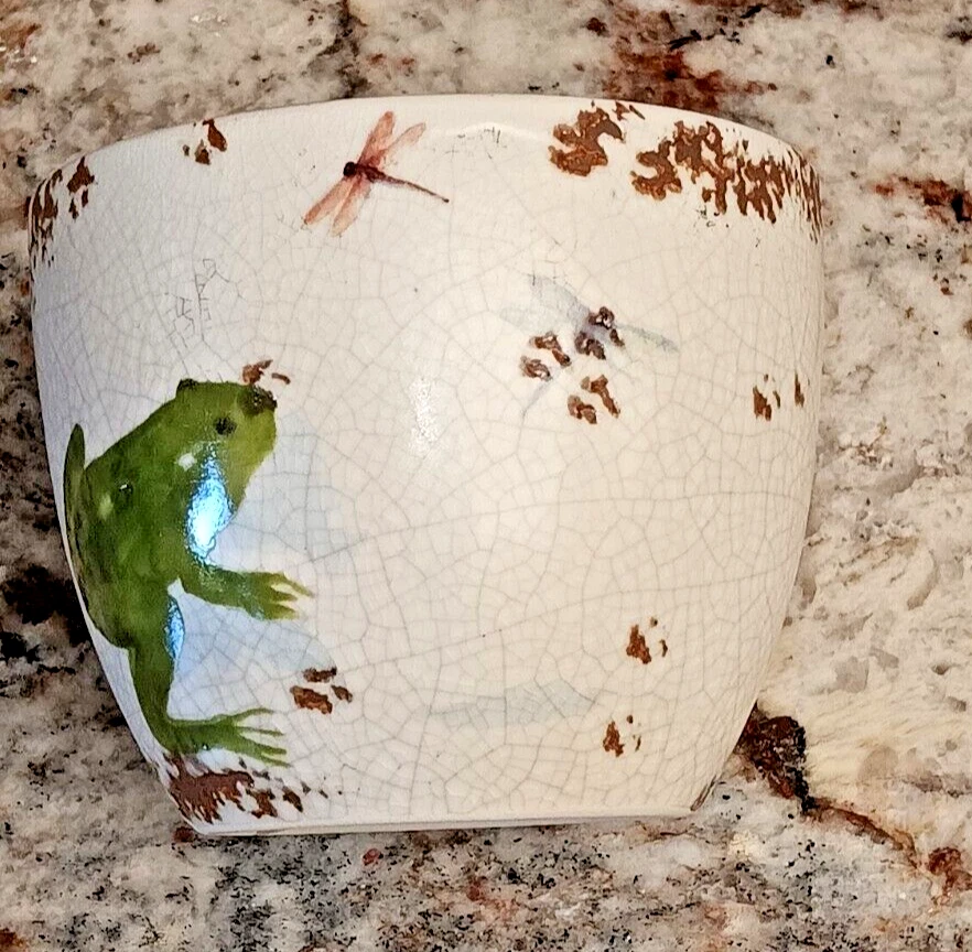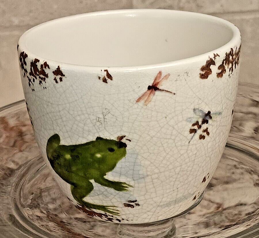 This small trinket bowl by Creative Co-Op features a delightful design of a frog catching by dragonflies. The bowl is made of ceramic, which ensures both durability and a smooth, matt finish. Perfect for storing small trinkets or jewelry, this piece is a must-have for collectors of frog figurines and fans of amphibians and reptiles. Whether you're an avid collector or simply looking for a charming addition to your home decor, this trinket bowl is sure to delight. Its sturdy construction and unique design make it a perfect gift for anyone who loves frogs or dragonflies. Add it to your collection today! The bowl is small, only 3 inches across and 3 inches tall.