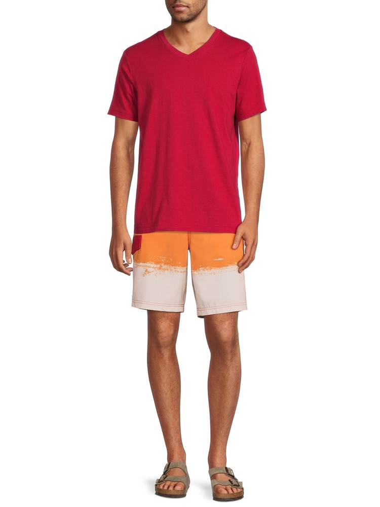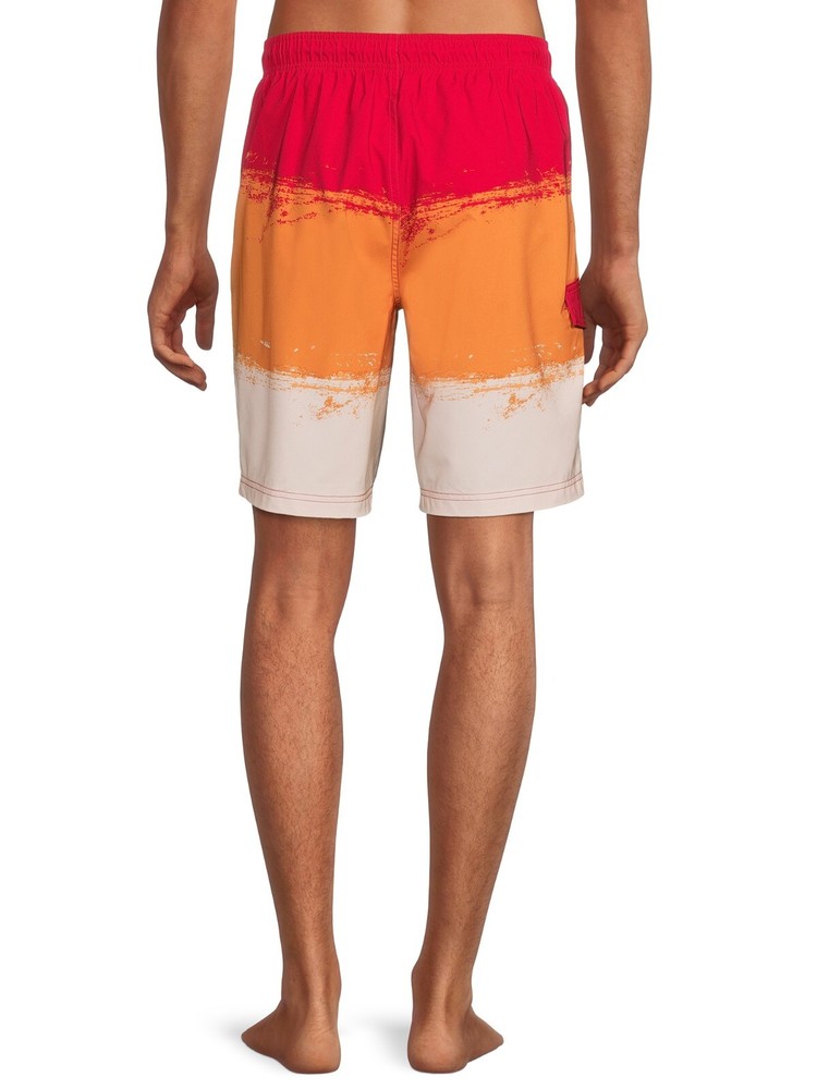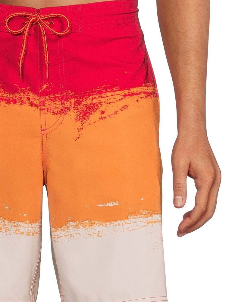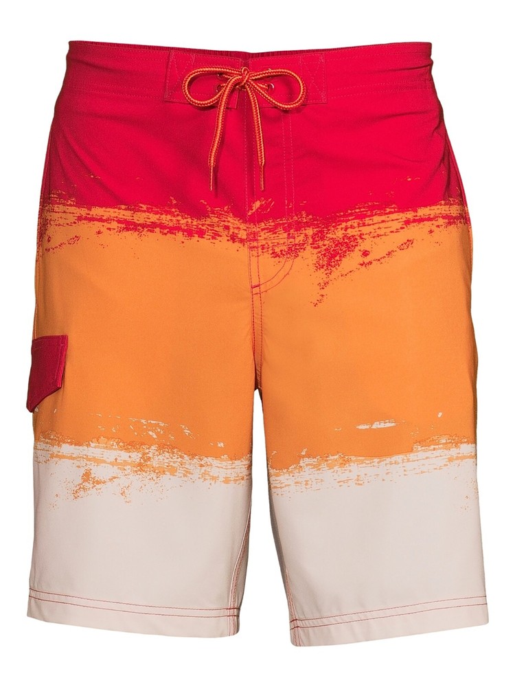 The George Board Shorts for men in size L are a vibrant red-orange color with a striped pattern, perfect for beach days or water activities like water polo. Made from a blended fabric of polyester and spandex, these mid-rise board shorts feature a drawstring waist for a customized fit and stretch material for comfort and flexibility. Machine washable for easy care, these modern and stylish shorts are ideal for men looking for a fashionable yet functional swim bottom.