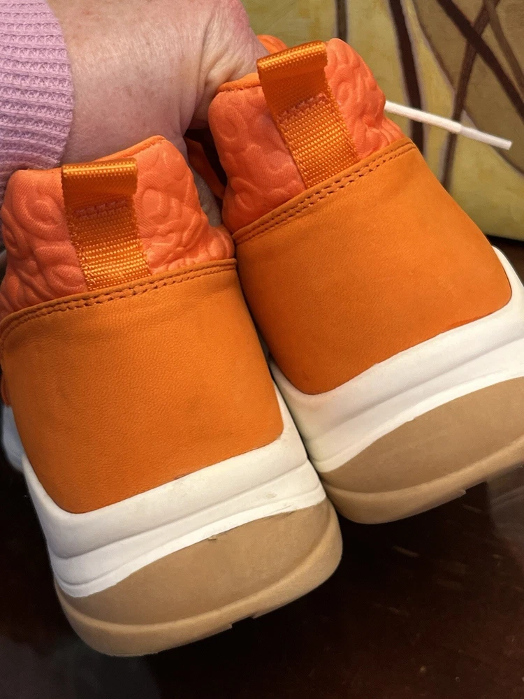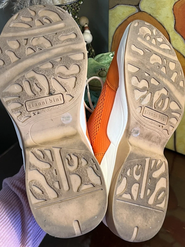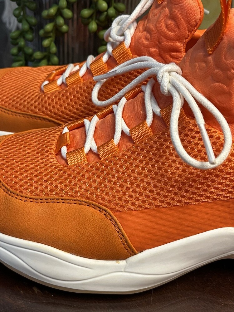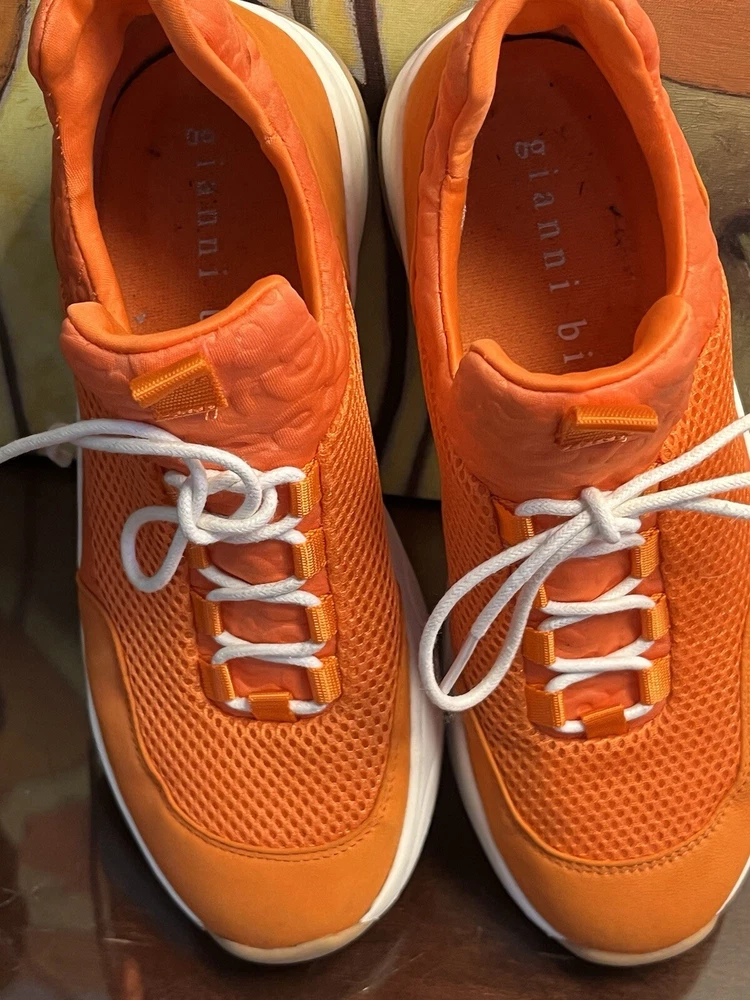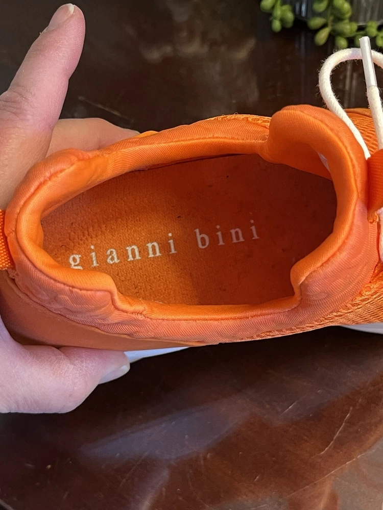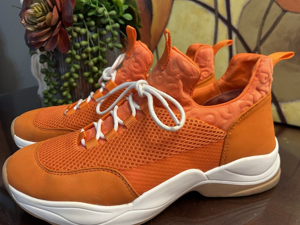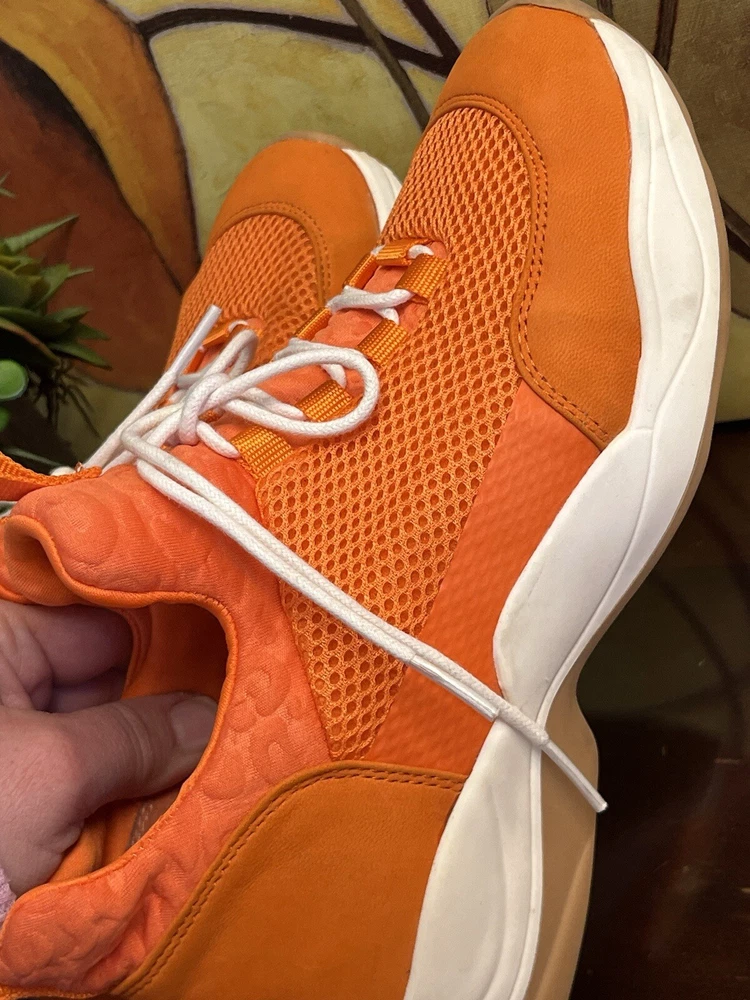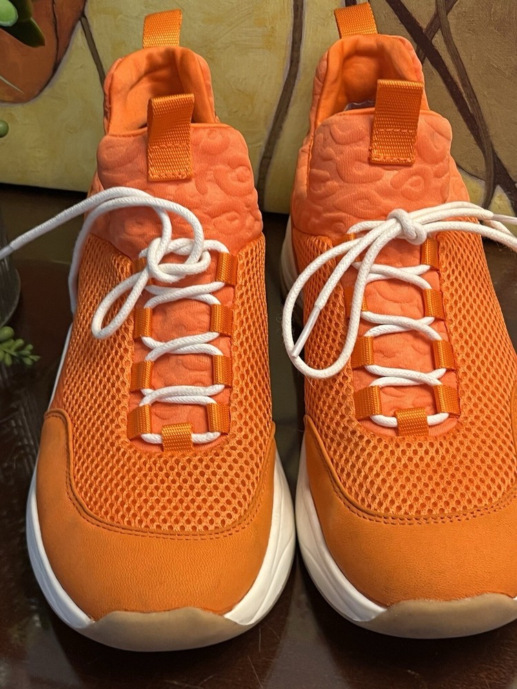 The Gianni Bini Women's Rizwell Lace-Up Sneakers in beautiful orange are stylish athletic shoes perfect for women in size 7.5. Featuring a mid-top shaft style with a slip-on closure, these sneakers are designed for comfort with a suede upper and fabric lining. The lace accents add a trendy touch to the solid orange color, making them a versatile choice for activities like walking, cycling, basketball, hiking, and running during the summer and fall seasons.