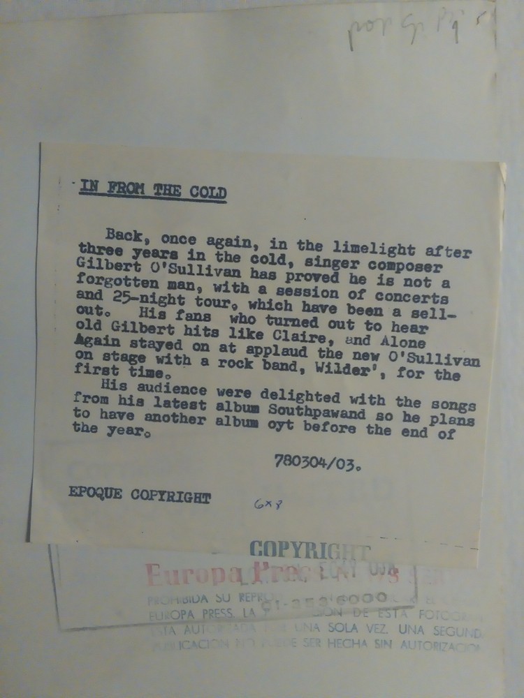 Vintage Original Photo Gilbert O'Sullivan 6"x 8" in. These photos have belonged to different archives off newspapers or magazines, so may have stamps, marks or notes on the back . About Shipping Shipping cost to USA $8.00 Shipping cost to rest of the world $10.00 The shipping time is around from 2 to 3 weeks. Other information if you need more pictures (details) feel free to ask. if you are unsatisfied for any reason PLEASE CONTACT ME BEFORE LEAVING ANY FEEDBACK.......PAYPAL ONLY.....PLEASE DO NOT BUY IF YOU CANNOT SENT PAYMENT WITHIN 7 DAYTIME PERIOD...THANK YOU IMPORTANT!!!::: - Cross-border buyers are responsible for any customs duties, taxes, etc. imposed by the buyer's home country. - Declared value of the shipment will be the same as the record price, unless buyer prefer not to. In case of damage or loss only refund the declared price. IMPORTANT!!! IF YOU BUY MORE THAN $100.00 FROM MY STORE AT ONCE, YOU CAN MAKE A CHOICE OF ANY ITEM UP TO $20.00 FOR FREE