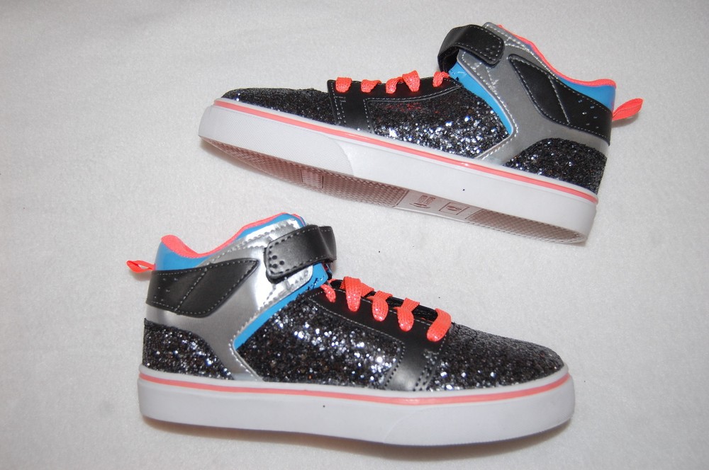 Standard USA Size: Girl's 12 Brand: OP Description: Girls athletic shoes. Black and silver glitter, mid-rise high tops with neon orange laces, and orange and blue trim / accents. Lace up front with hook and loop strap at top. Material: synthetic and man made materials One photo is used to represent all available sizes.