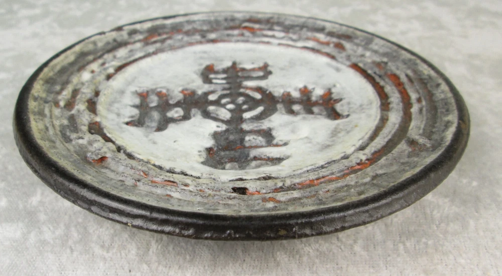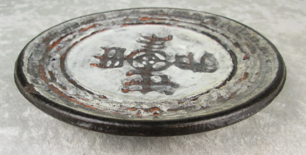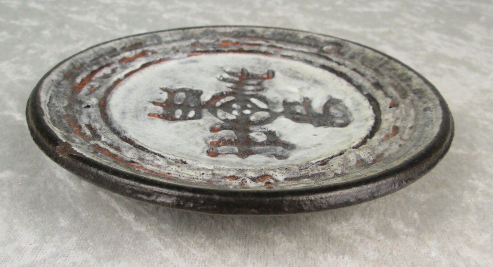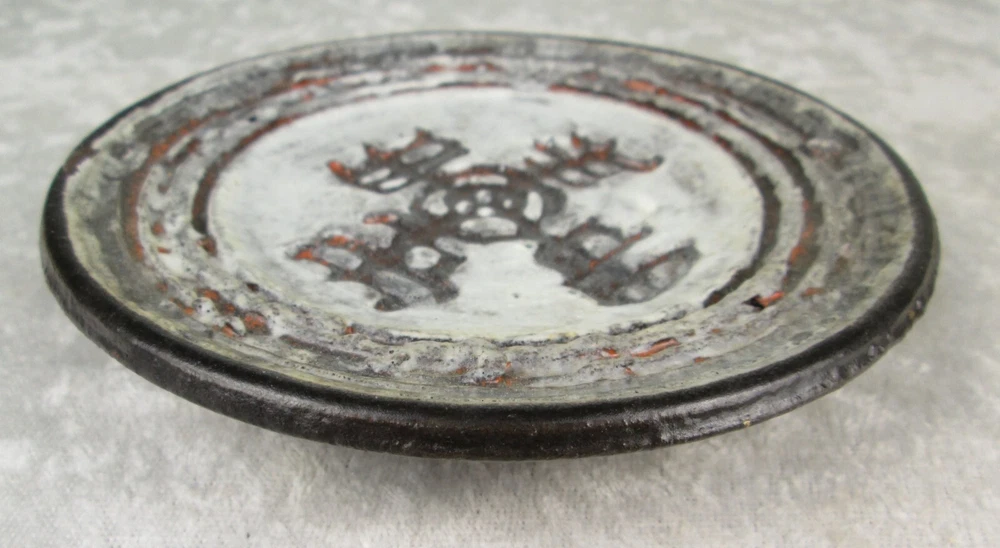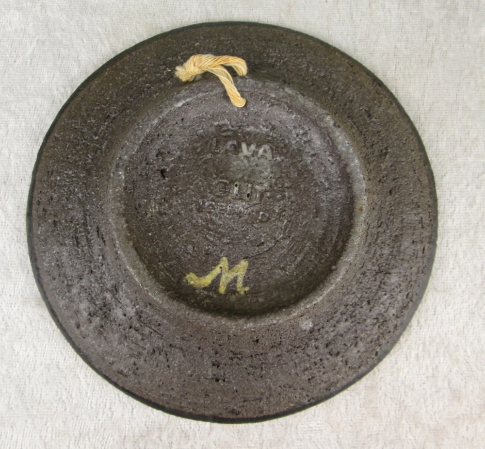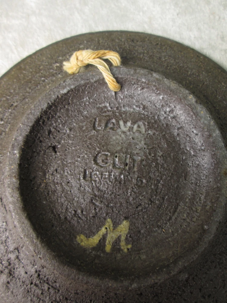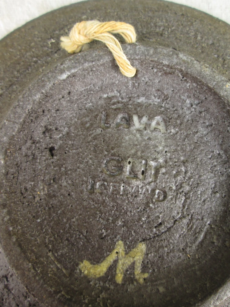 Vintage Glit Lava Pottery of Iceland Brutalist Mid Century Modern Dish / Wall Hanging Art . The dish is brown with a geometric design in the center and white and orange glaze. The back has an impressed mark that reads "Lava Glit Iceland" and a hand marked "M". The piece measures approximately 5 inches in diameter and 1 inch tall. The dish has some edge chips. (See photos) Shipping includes packing and insurance covering amount of item cost, in the U.S., via USPS Ground Advantage. We make every effort to ship as quickly as possible once payment is received; 5 business days is the maximum handling