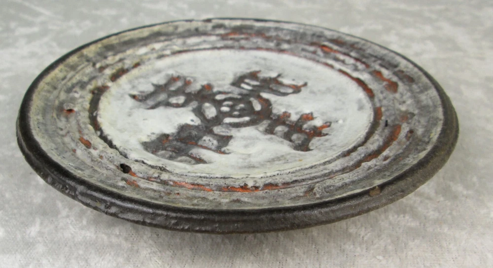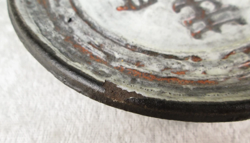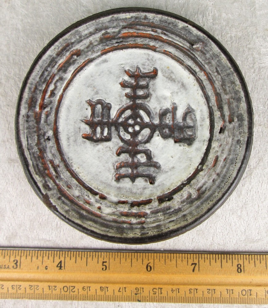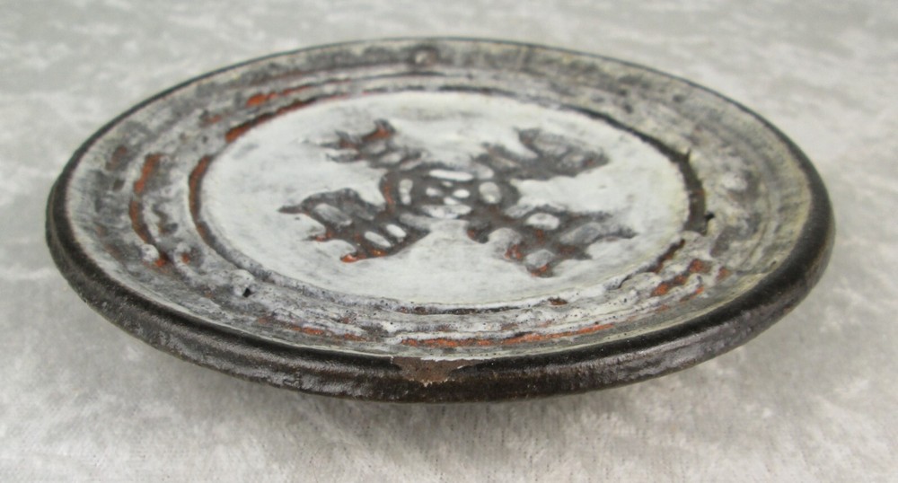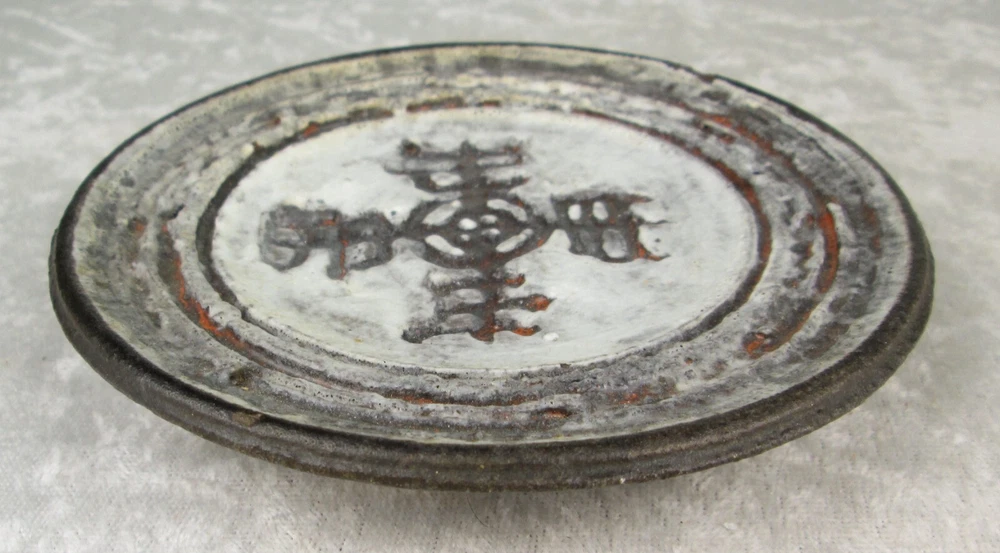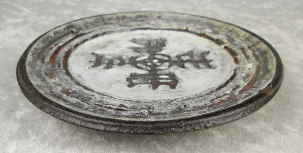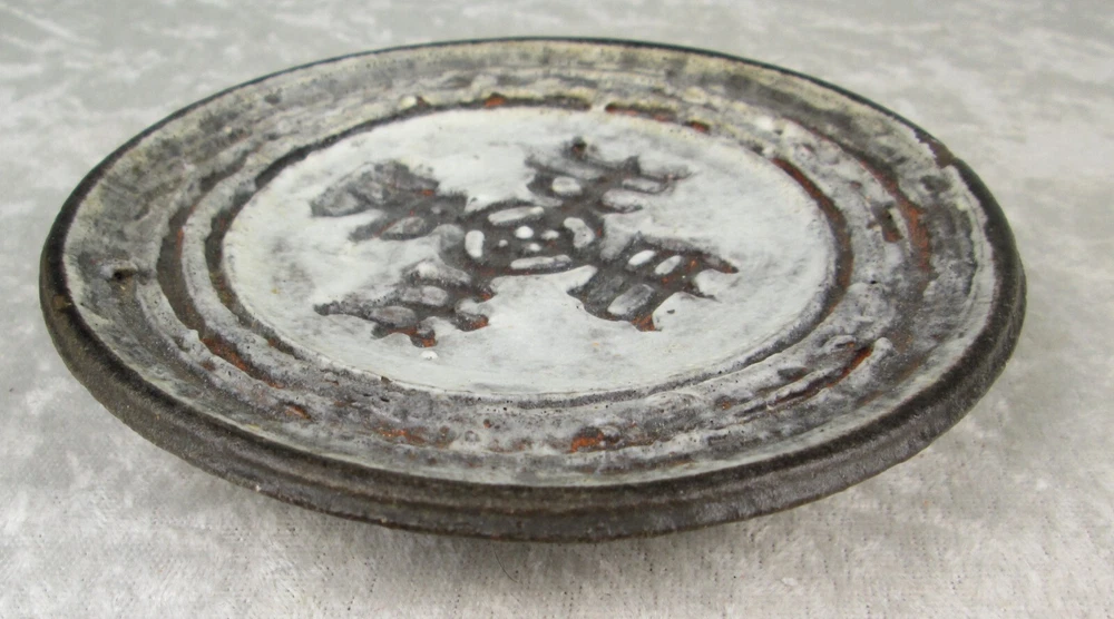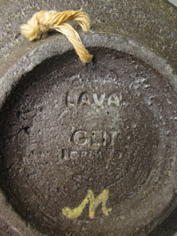 Vintage Glit Lava Pottery of Iceland Brutalist Mid Century Modern Dish / Wall Hanging Art . The dish is brown with a geometric design in the center and white and orange glaze. The back has an impressed mark that reads "Lava Glit Iceland" and a hand marked "M". The piece measures approximately 5 inches in diameter and 1 inch tall. The dish has some edge chips. (See photos) Shipping includes packing and insurance covering amount of item cost, in the U.S., via USPS Ground Advantage. We make every effort to ship as quickly as possible once payment is received; 5 business days is the maximum handling