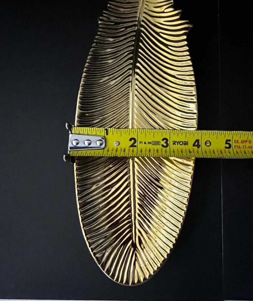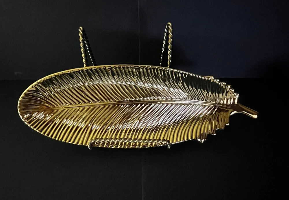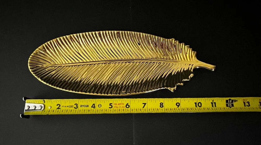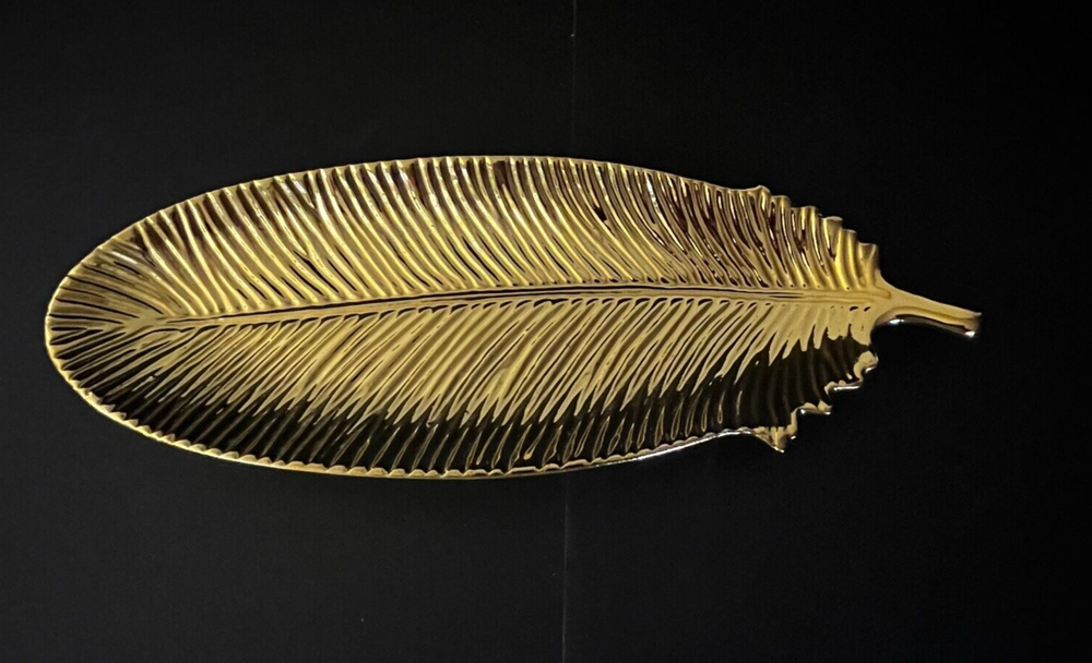 Gold Ceramic Feather Jewelry Holder Dish Trinket Tray Creative Co-op Home Decor Storage Organizer. Excellent Pre-owned condition. Please note that this item may show signs of usage. Items come from a smoke free home. No Crack, chips, stains, odors, discolorations or repairs. Very clean. Please use the zoom feature to determine condition. Check all pictures and measurements carefully for detailed viewing as they are part of the description. I invite you to always check my new listings and feedbacks to buy with confidence. Smoke free home. Thank you, have a wonderful day!! W1 - 36