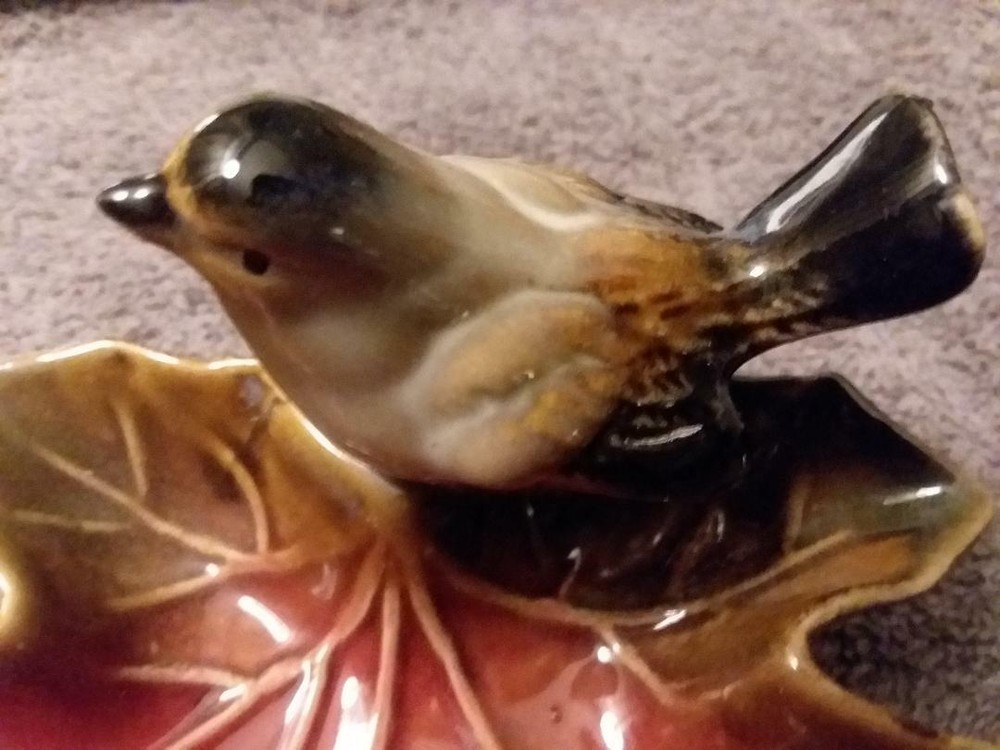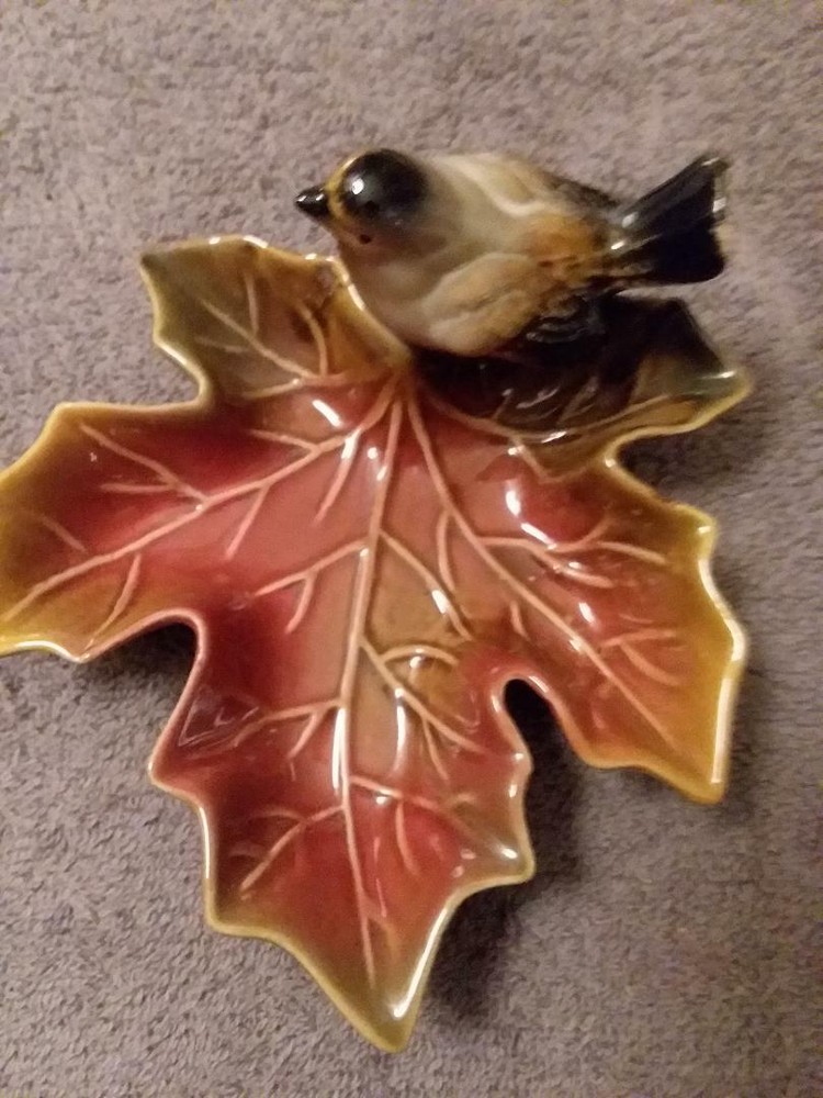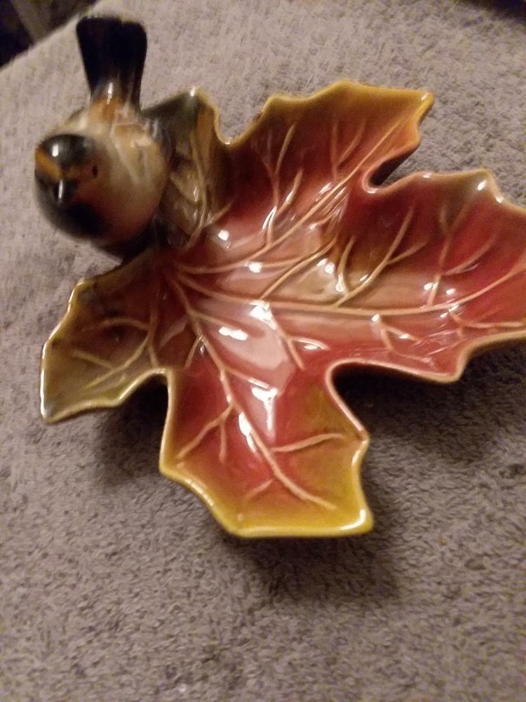 You are bidding on a 5 1/2 inch decorative ceramic ashtray in the shape of a golden/red/greenish leaf with a songbird sitting on it. This piece was made by Creative Co-op. It is a beautiful piece and can be used as an ashtray, a what not, a ring holder or change holder. There are no cracks, nicks or chips noted. Please see the photos of the item above. They are of the actual piece up for auction. This is a very pretty piece to add to your collection. It is very realistic and the colors are gorgeous. Shipping via USPS Ground Advantage to the winning bidder after the auction ends and payment has been made.. Thank you for looking and happy shopping!