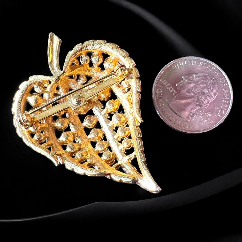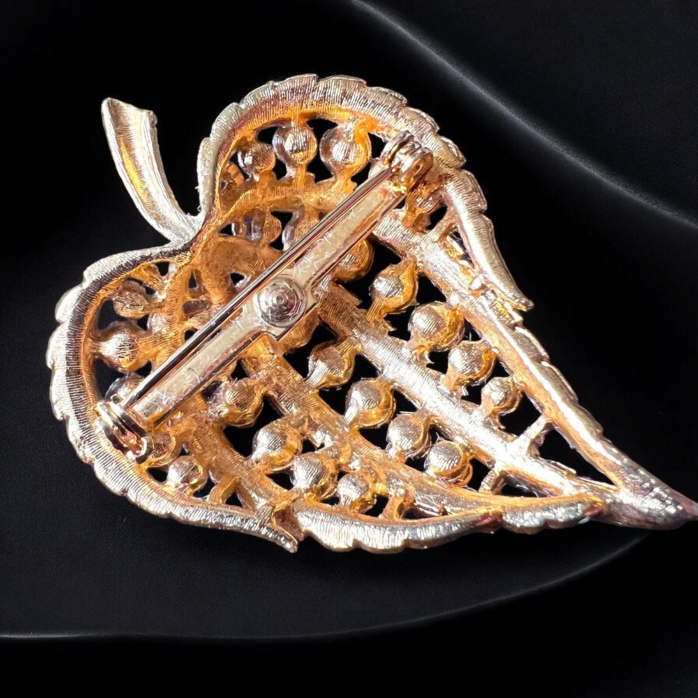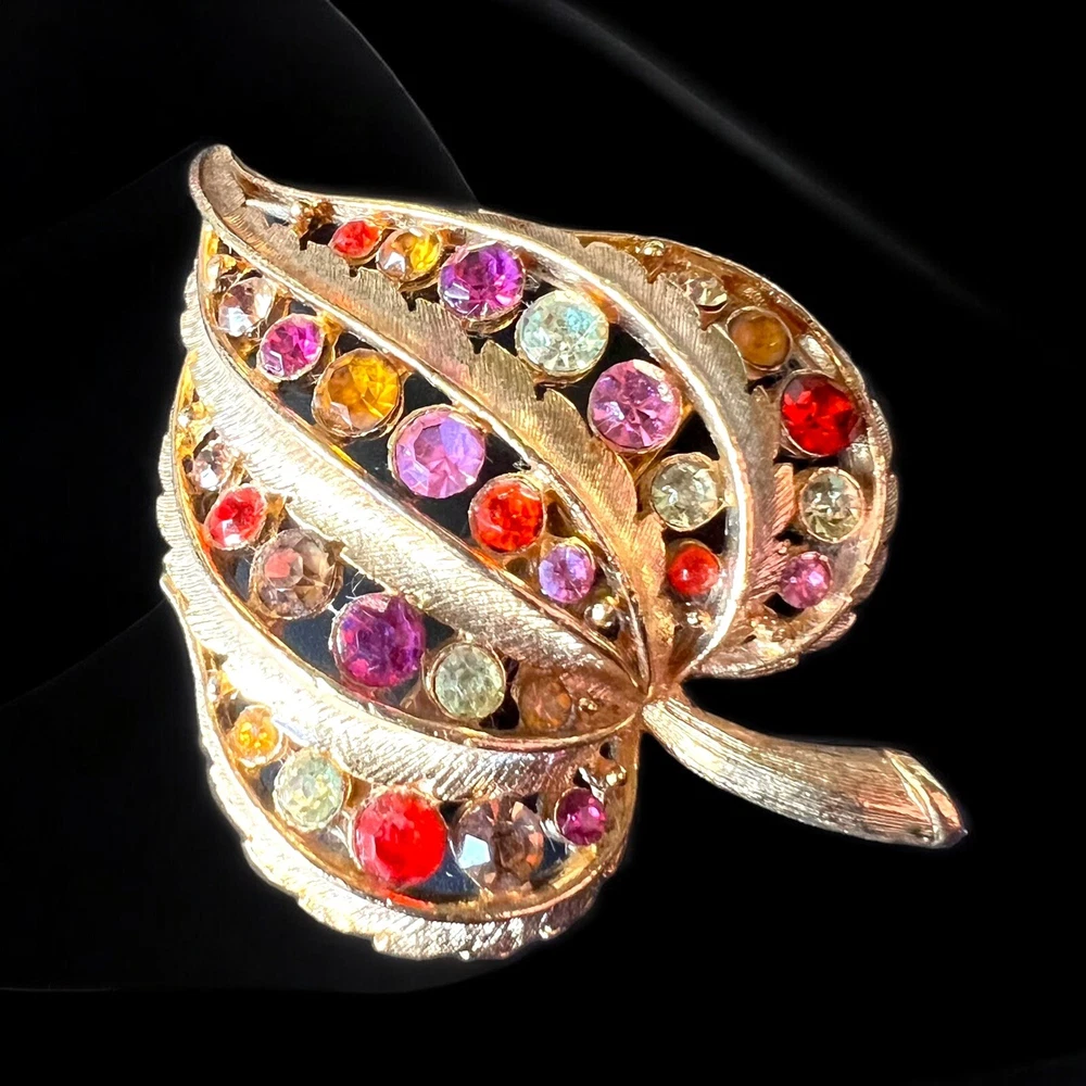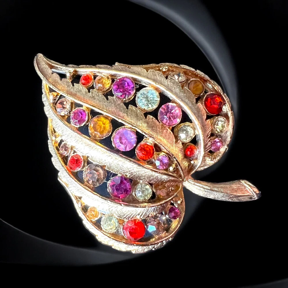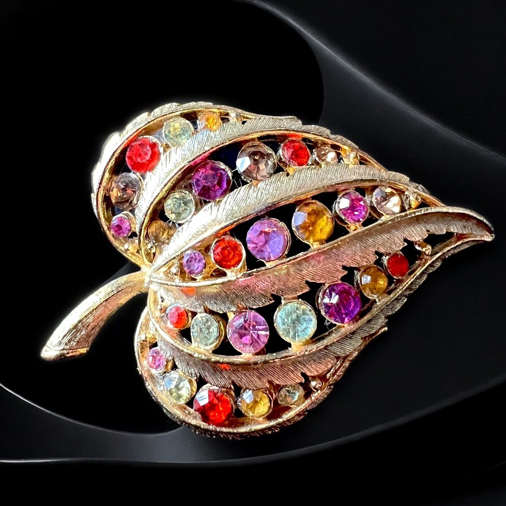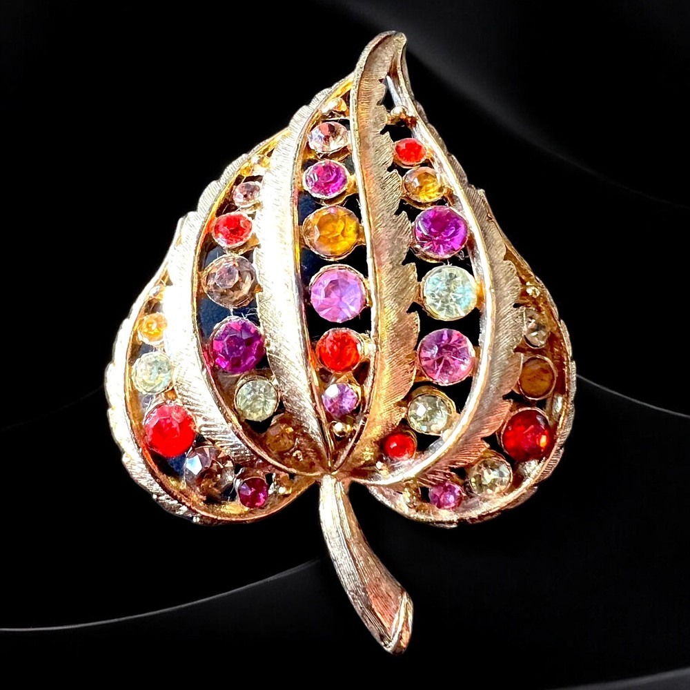 Adorn your lapel with this exquisite vintage gold-tone leaf brooch, a radiant masterpiece of mid-century modern design. The intricate leaf, textured with delicate veining, sparkles with a vibrant array of pink, orange, red, and clear rhinestones, creating a dazzling display of light and color. Envision this brooch gracing the collar of a chic woman in the 1950s or 60s, adding a touch of nature-inspired glamour to her outfit. Perhaps she was an art enthusiast, drawn to the brooch's organic form and vibrant colors, or a socialite who loved to make a statement with her accessories. While the maker remains unknown, the brooch's style, craftsmanship, and use of rhinestones align with the aesthetics of the mid-20th century, a period renowned for its bold and innovative jewelry designs. The brooch's elegant lines, textured gold finish, and colorful rhinestones embody the spirit of the era. Why You Will Be Obsessed: Vibrant Color Palette: The rich hues of pink, orange, red, and clear rhinestones create a captivating visual display. Mid-Century Modern Appeal: A timeless piece that embodies the elegance and sophistication of the era. Sparkling Rhinestones: The carefully set stones shimmer and catch the light, adding a touch of glamour. Detailed Artistry: The delicate veining and gold-tone finish showcase the meticulous craftsmanship of the era. Versatile Statement Piece: Perfect for adding a touch of vintage flair to any outfit, from casual to formal. Please follow our store with over 2000 vintage and antique pieces just like this with new items added daily!
