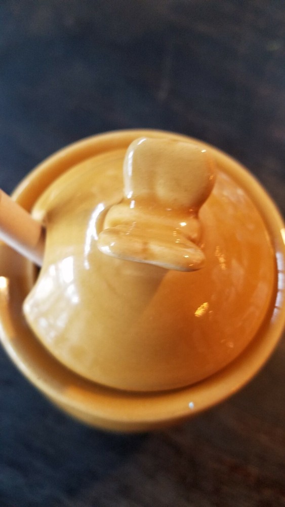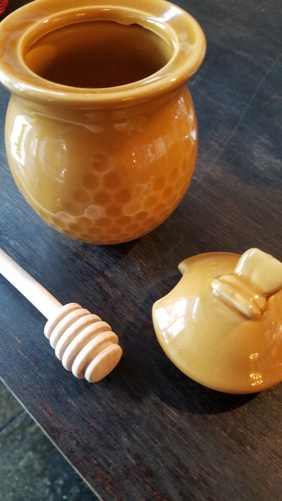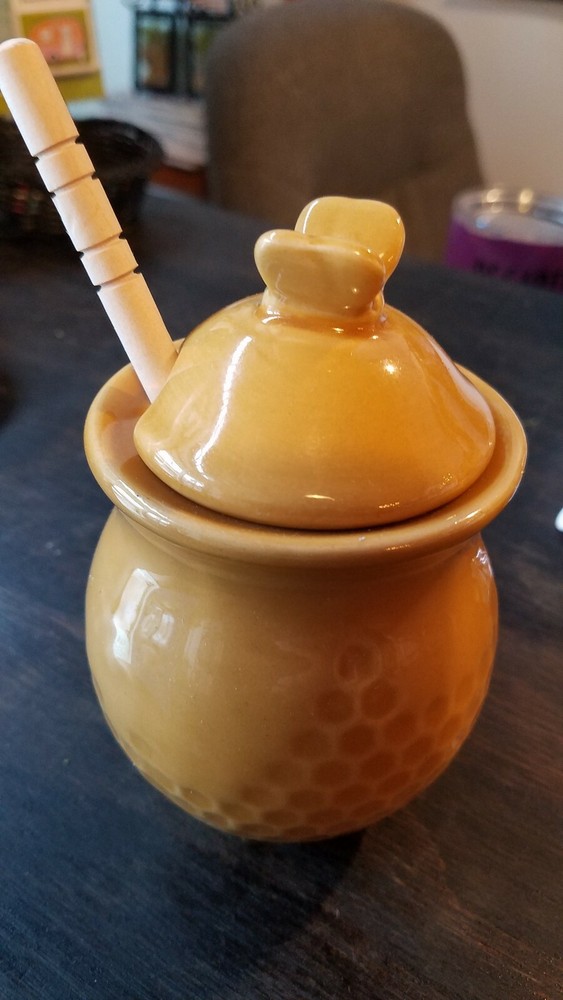 This adorable honey pot set is a must-have! The golden yellow stoneware looks so cheerful, and the little bee design adds a sweet touch. The wooden dipper is smooth and sturdy—perfect for drizzling honey. Great quality, and it arrived fast with Priority Mail. Love it!