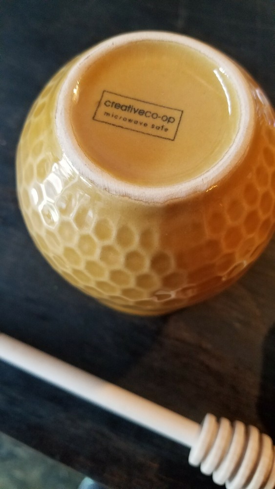 Golden Yellow Stoneware Pot Bee & Wood Honey Dipper Serving Creative Co-Op NEW . Shipped with USPS Priority Mail.