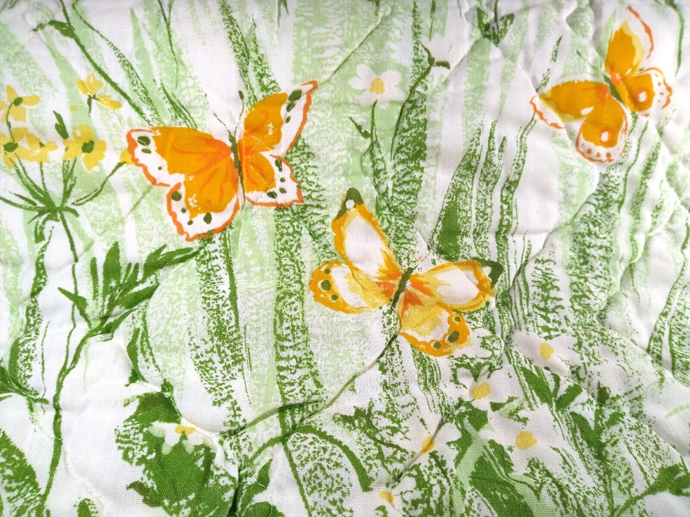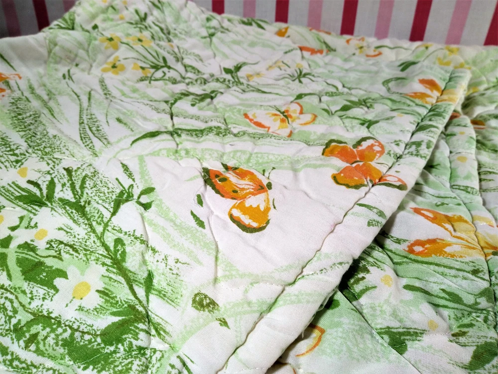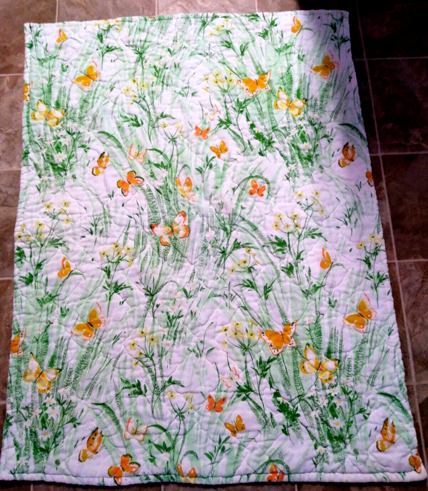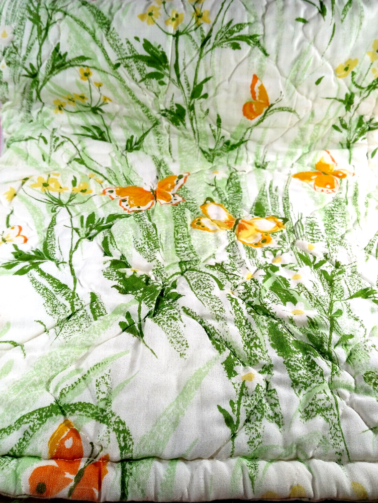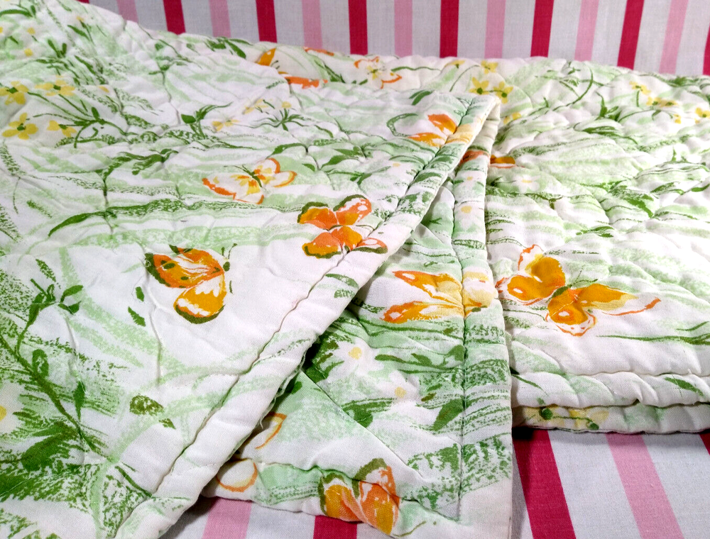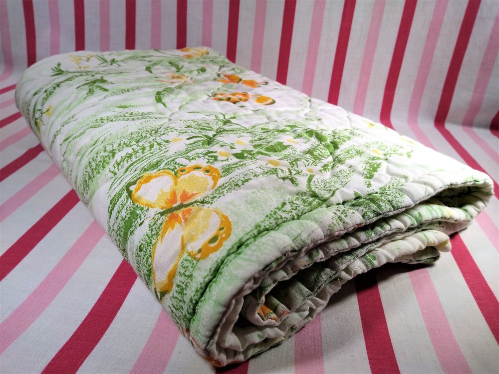 Darling estate sale find in this fun vintage 1970's butterfly & foliage pattern lap or throw quilt! Perfect for crib, toddler bed, floor blanket or decor! Fabulous soft fabric is bright and mod colorful butterflies, ferns & foliage graphics on both sides in orange, yellow & green colorway. Beautifully stored and well taken care of, this treasure has charm for days! This cozy quilt will add joy and sunshine to any vintage inspired baby or nursery decor! Fabulous for a house warming gift, would even be great framed for decor! * We have loads of vintage linens and textiles, so check out our shop for best availability before they are gone! We'll gladly combine purchases to save on shipping costs! Quilt is in excellent condition! No rips, holes or tears! Perhaps the usual surface spot or two here or there from years of adding glam to the hope chest, but nothing that distracts from this sweet gem of history! See enlarged pics for best description and details. Makers Mark: None Approximate size: 44" wide by 34" long • Weight: 1lb 2oz before packing material and shipping box. Cosmic Pop values our excellent reputation as sellers and try our very best to honestly portray the condition of our items through our descriptions and multi photographs. Please enlarge our photos for the best details, they are a huge part of the item description. Though we have come along way over the last 25+ years, we are not a professional photographers, but strive for the best clarity and detail of each item. Please note colors may slightly differ than that shown in pictures due to lighting and/or from our computer screen to your computer screen. After so may years of recycling history, we do not claim to be experts in all things mid century, but we do research every item we sell and try to accurately describe it's condition to our buyers. We welcome all of your questions and do our best to respond promptly. We are always eager to learn something new about the history of a piece, so feel free to share any additional information you might have. Please note that 99% of our items are antique, vintage or retro (from the 1920's to the 1990's) so any of the typical preloved surface wear will commensurate with age unless otherwise noted. We purchase from estate sales, individuals, flea markets and antique stores. We do our best to offer pristine inventory, in clean as a whistle condition for our buyers, however we do not wash fragile items, as not to damage any finishes which may mean that they could be dusty from years of storage. We are proud of our speedy shipping and always offer same day/next day shipping upon receipt of payment. We are also known for our pride in gorilla proof packaging (especially fragile items) and on occasion will use excellent condition recycled packing materials too. This helps keep our shipping prices lower and helps the environment for a win-win! Unfortunately with shipping it is all about location, so sometimes shipping from our east coast location to the west coast, the costs have risen significantly in recent years, so we are always open to utilizing various couriers other than standard postal service to help save money! If you purchase multiple items, we are always happy to combine orders to reduce shipping costs. Cosmic Pop does not accept returns, so please take notice of all details and ask any questions prior to purchase. Please know that buyers remorse or failure to look at our plethora of pictures & read our lengthy descriptions are not valid reasons for returning an item. We would greatly appreciate if you would let us know that you have received your item(s) safely by leaving positive feedback for us, it means the world to keep growing our business! We shop and list daily/weekly for new and unusual vintage treasures, so stop by our shop often! Again, thanks for browsing our shop, we take pride in offering an eclectic sampling from days gone by and we love sharing our finds with you to help you add to your collections and decor! We take immense pride in saving history one day at a time and keeping these beauties from the landfill! Thanks for allowing us to keep doing what we love since 1998!! ♥