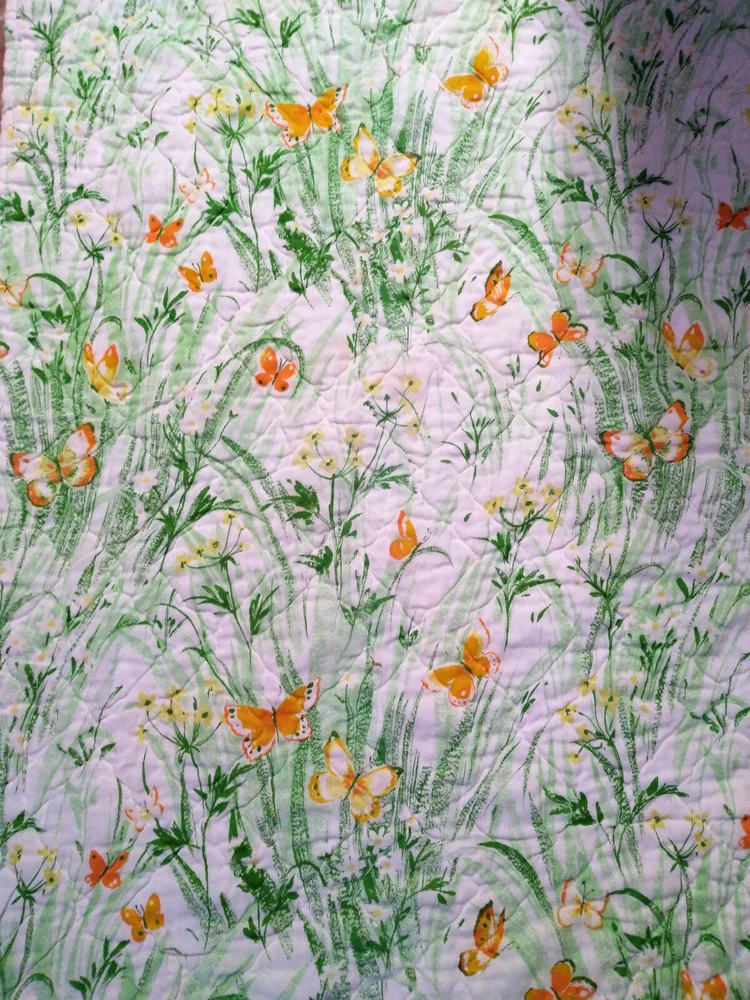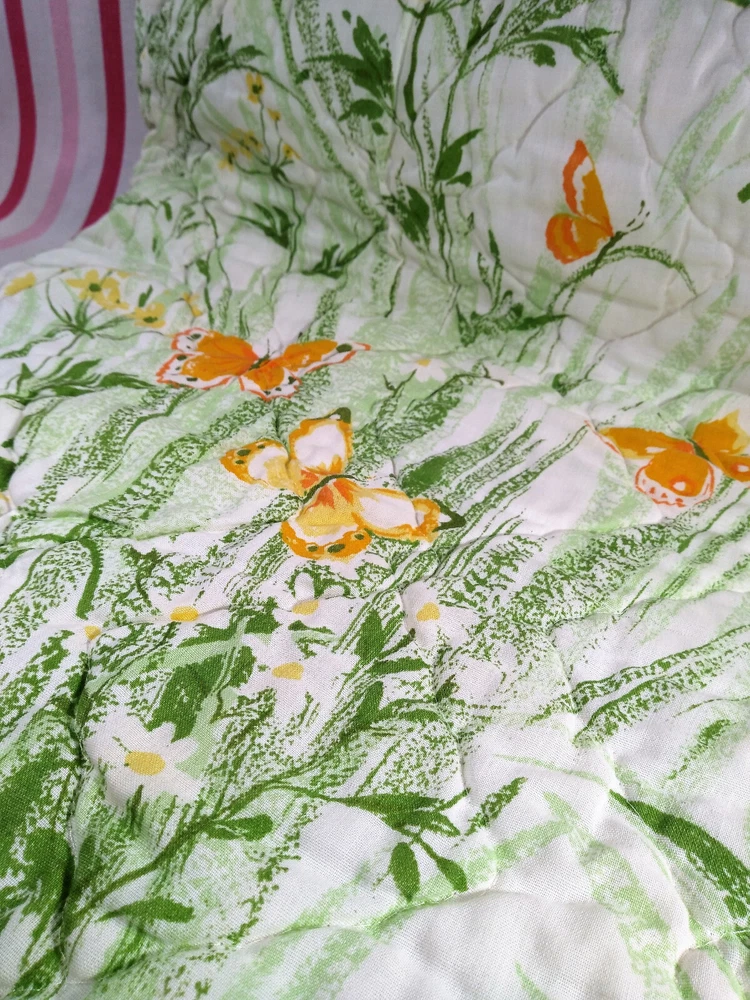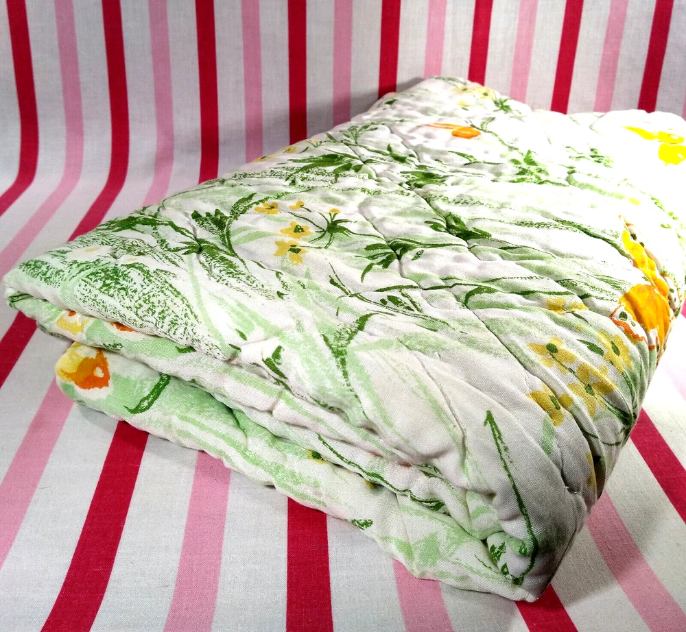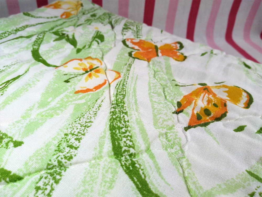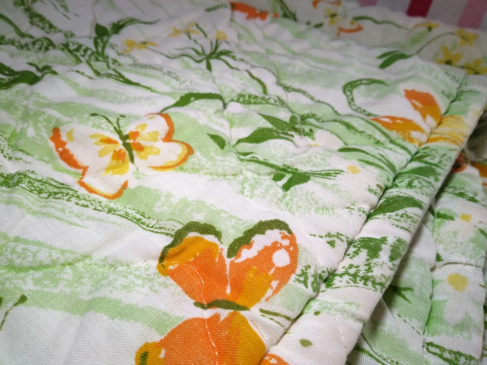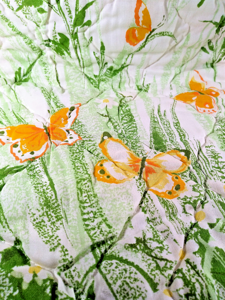Darling estate sale find in this fun vintage 1970's butterfly & foliage pattern lap or throw quilt! Perfect for crib, toddler bed, floor blanket or decor! Fabulous soft fabric is bright and mod colorful butterflies, ferns & foliage graphics on both sides in orange, yellow & green colorway. Beautifully stored and well taken care of, this treasure has charm for days! This cozy quilt will add joy and sunshine to any vintage inspired baby or nursery decor! Fabulous for a house warming gift, would even be great framed for decor! * We have loads of vintage linens and textiles, so check out our shop for best availability before they are gone! We'll gladly combine purchases to save on shipping costs! Quilt is in excellent condition! No rips, holes or tears! Perhaps the usual surface spot or two here or there from years of adding glam to the hope chest, but nothing that distracts from this sweet gem of history! See enlarged pics for best description and details. Makers Mark: None Approximate size: 44" wide by 34" long • Weight: 1lb 2oz before packing material and shipping box. Cosmic Pop values our excellent reputation as sellers and try our very best to honestly portray the condition of our items through our descriptions and multi photographs. Please enlarge our photos for the best details, they are a huge part of the item description. Though we have come along way over the last 25+ years, we are not a professional photographers, but strive for the best clarity and detail of each item. Please note colors may slightly differ than that shown in pictures due to lighting and/or from our computer screen to your computer screen. After so may years of recycling history, we do not claim to be experts in all things mid century, but we do research every item we sell and try to accurately describe it's condition to our buyers. We welcome all of your questions and do our best to respond promptly. We are always eager to learn something new about the history of a piece, so feel free to share any additional information you might have. Please note that 99% of our items are antique, vintage or retro (from the 1920's to the 1990's) so any of the typical preloved surface wear will commensurate with age unless otherwise noted. We purchase from estate sales, individuals, flea markets and antique stores. We do our best to offer pristine inventory, in clean as a whistle condition for our buyers, however we do not wash fragile items, as not to damage any finishes which may mean that they could be dusty from years of storage. We are proud of our speedy shipping and always offer same day/next day shipping upon receipt of payment. We are also known for our pride in gorilla proof packaging (especially fragile items) and on occasion will use excellent condition recycled packing materials too. This helps keep our shipping prices lower and helps the environment for a win-win! Unfortunately with shipping it is all about location, so sometimes shipping from our east coast location to the west coast, the costs have risen significantly in recent years, so we are always open to utilizing various couriers other than standard postal service to help save money! If you purchase multiple items, we are always happy to combine orders to reduce shipping costs. Cosmic Pop does not accept returns, so please take notice of all details and ask any questions prior to purchase. Please know that buyers remorse or failure to look at our plethora of pictures & read our lengthy descriptions are not valid reasons for returning an item. We would greatly appreciate if you would let us know that you have received your item(s) safely by leaving positive feedback for us, it means the world to keep growing our business! We shop and list daily/weekly for new and unusual vintage treasures, so stop by our shop often! Again, thanks for browsing our shop, we take pride in offering an eclectic sampling from days gone by and we love sharing our finds with you to help you add to your collections and decor! We take immense pride in saving history one day at a time and keeping these beauties from the landfill! Thanks for allowing us to keep doing what we love since 1998!! ♥