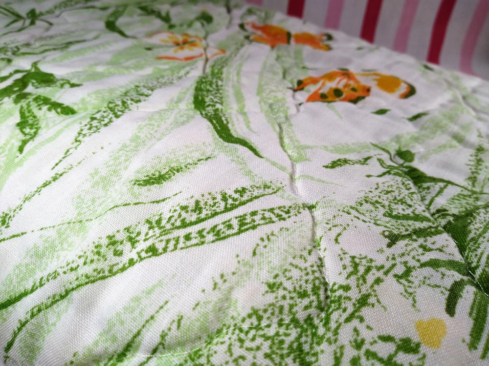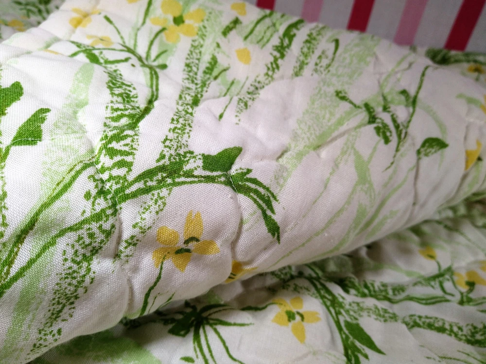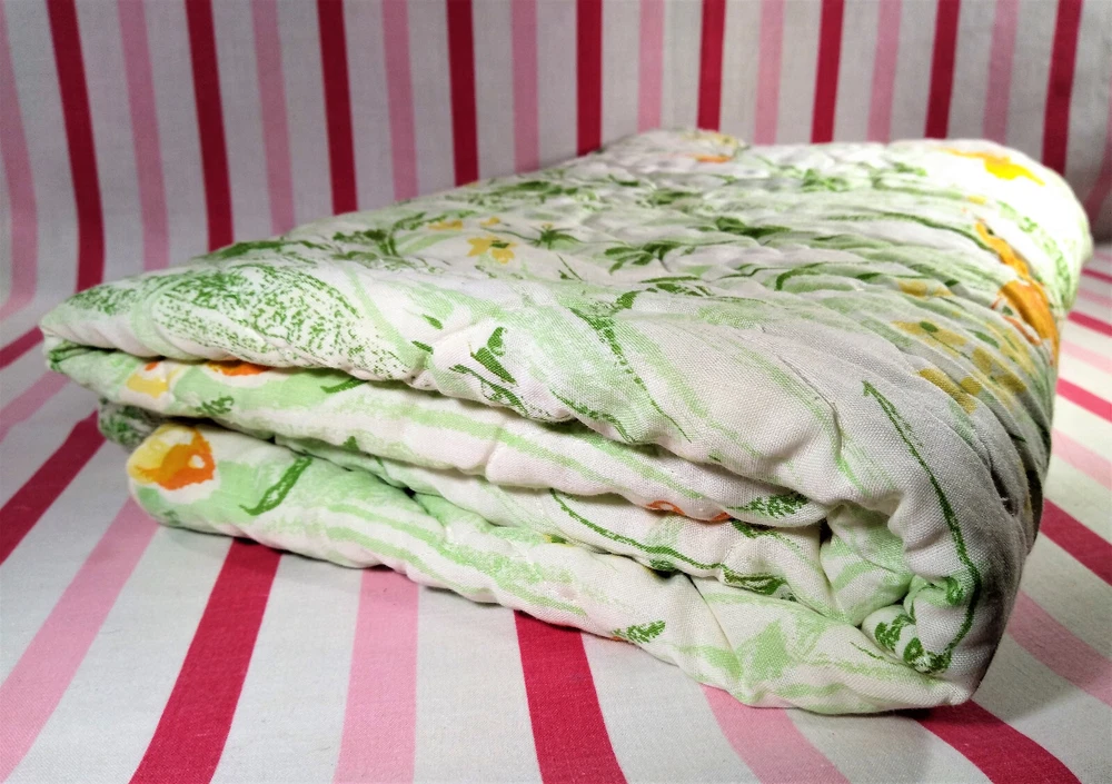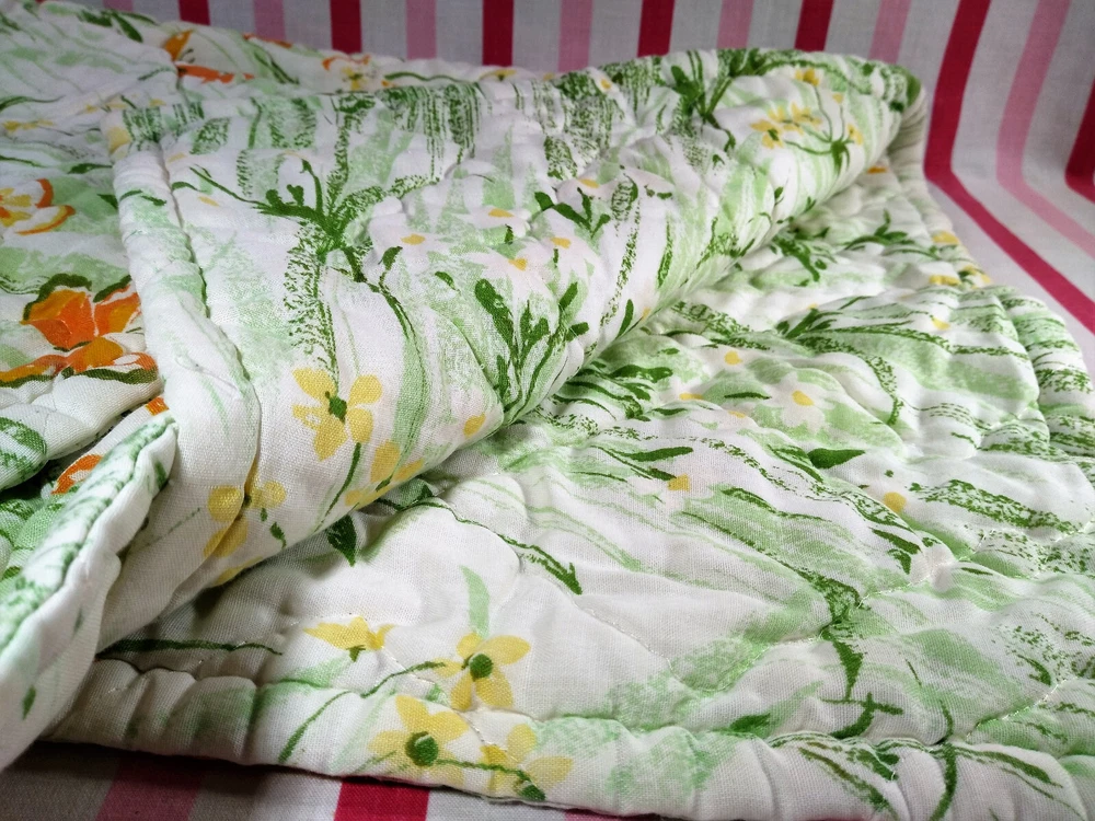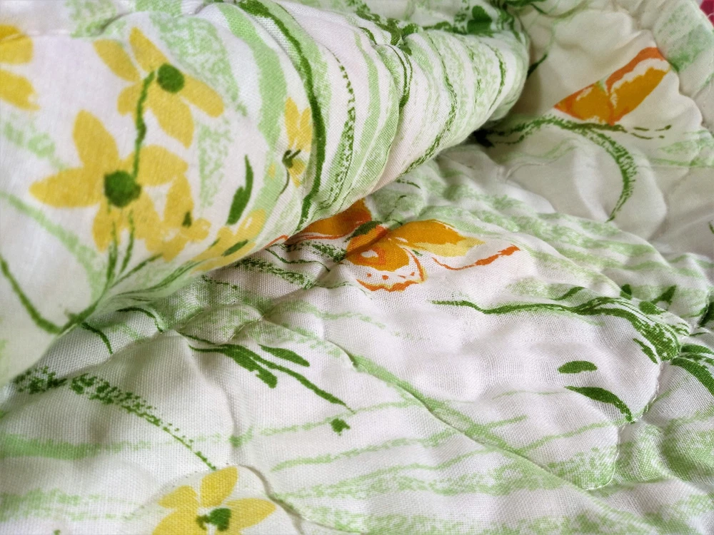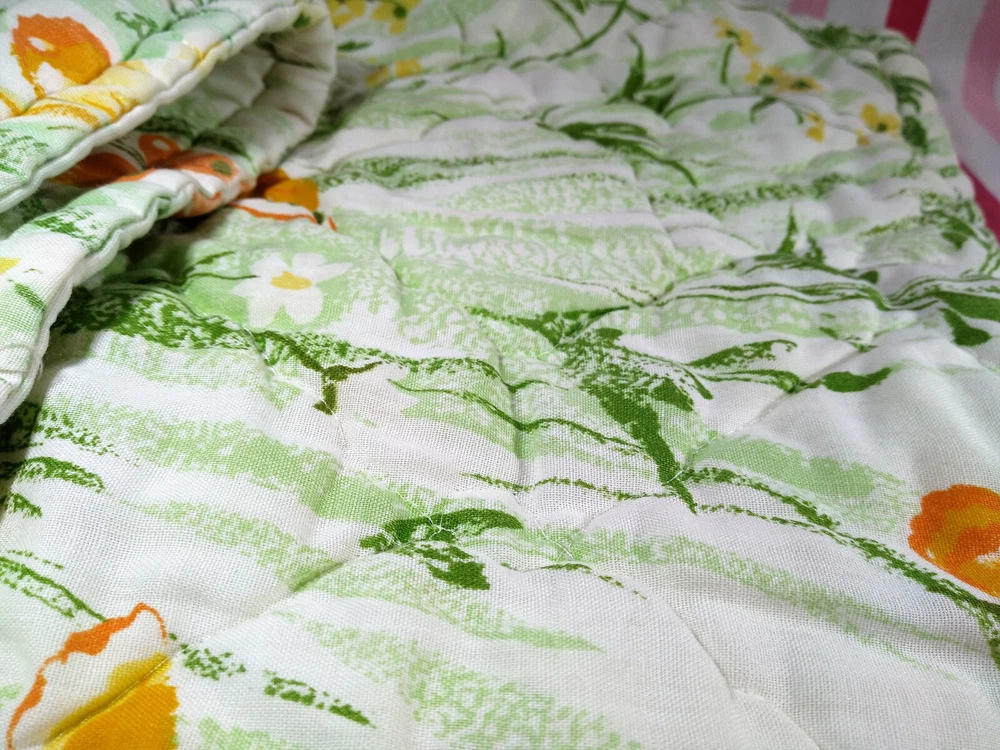 Darling estate sale find in this fun vintage 1970's butterfly & foliage pattern lap or throw quilt! Perfect for crib, toddler bed, floor blanket or decor! Fabulous soft fabric is bright and mod colorful butterflies, ferns & foliage graphics on both sides in orange, yellow & green colorway. Beautifully stored and well taken care of, this treasure has charm for days! This cozy quilt will add joy and sunshine to any vintage inspired baby or nursery decor! Fabulous for a house warming gift, would even be great framed for decor! * We have loads of vintage linens and textiles, so check out our shop for best availability before they are gone! We'll gladly combine purchases to save on shipping costs! Quilt is in excellent condition! No rips, holes or tears! Perhaps the usual surface spot or two here or there from years of adding glam to the hope chest, but nothing that distracts from this sweet gem of history! See enlarged pics for best description and details. Makers Mark: None Approximate size: 44" wide by 34" long • Weight: 1lb 2oz before packing material and shipping box. Cosmic Pop values our excellent reputation as sellers and try our very best to honestly portray the condition of our items through our descriptions and multi photographs. Please enlarge our photos for the best details, they are a huge part of the item description. Though we have come along way over the last 25+ years, we are not a professional photographers, but strive for the best clarity and detail of each item. Please note colors may slightly differ than that shown in pictures due to lighting and/or from our computer screen to your computer screen. After so may years of recycling history, we do not claim to be experts in all things mid century, but we do research every item we sell and try to accurately describe it's condition to our buyers. We welcome all of your questions and do our best to respond promptly. We are always eager to learn something new about the history of a piece, so feel free to share any additional information you might have. Please note that 99% of our items are antique, vintage or retro (from the 1920's to the 1990's) so any of the typical preloved surface wear will commensurate with age unless otherwise noted. We purchase from estate sales, individuals, flea markets and antique stores. We do our best to offer pristine inventory, in clean as a whistle condition for our buyers, however we do not wash fragile items, as not to damage any finishes which may mean that they could be dusty from years of storage. We are proud of our speedy shipping and always offer same day/next day shipping upon receipt of payment. We are also known for our pride in gorilla proof packaging (especially fragile items) and on occasion will use excellent condition recycled packing materials too. This helps keep our shipping prices lower and helps the environment for a win-win! Unfortunately with shipping it is all about location, so sometimes shipping from our east coast location to the west coast, the costs have risen significantly in recent years, so we are always open to utilizing various couriers other than standard postal service to help save money! If you purchase multiple items, we are always happy to combine orders to reduce shipping costs. Cosmic Pop does not accept returns, so please take notice of all details and ask any questions prior to purchase. Please know that buyers remorse or failure to look at our plethora of pictures & read our lengthy descriptions are not valid reasons for returning an item. We would greatly appreciate if you would let us know that you have received your item(s) safely by leaving positive feedback for us, it means the world to keep growing our business! We shop and list daily/weekly for new and unusual vintage treasures, so stop by our shop often! Again, thanks for browsing our shop, we take pride in offering an eclectic sampling from days gone by and we love sharing our finds with you to help you add to your collections and decor! We take immense pride in saving history one day at a time and keeping these beauties from the landfill! Thanks for allowing us to keep doing what we love since 1998!! ♥