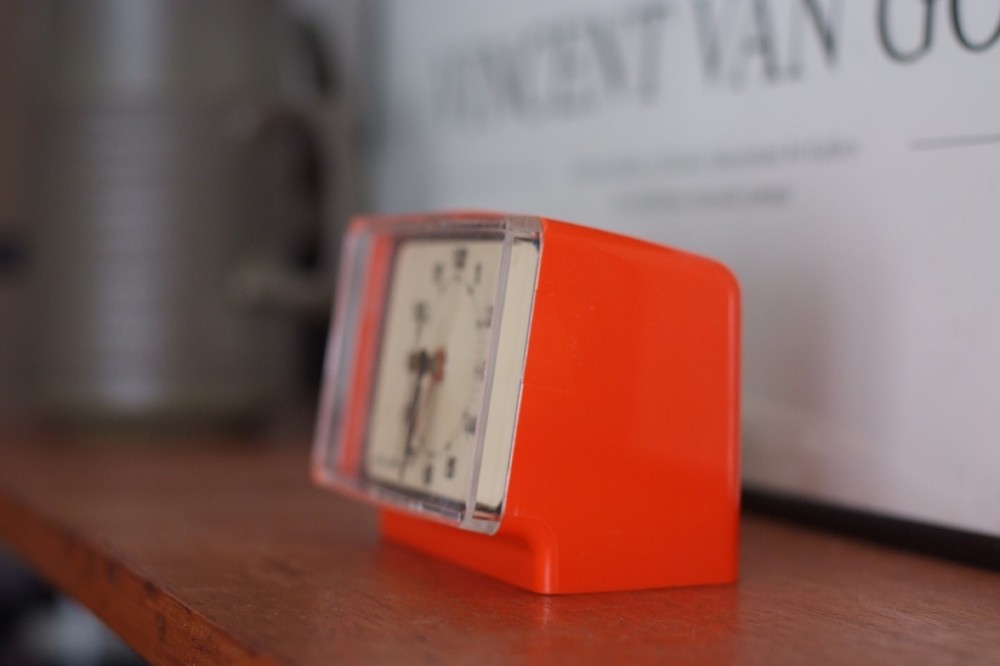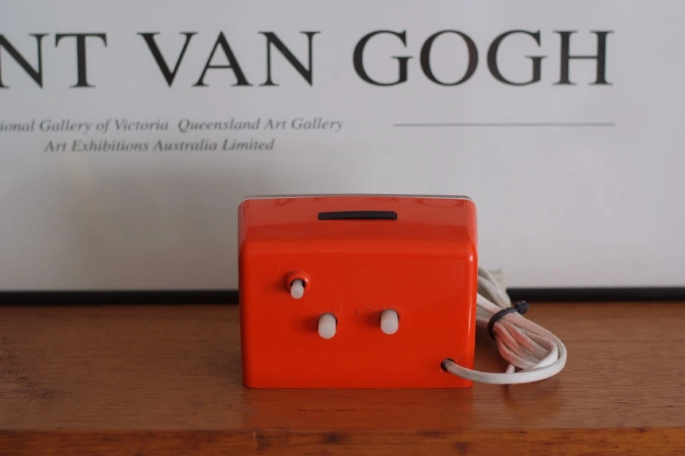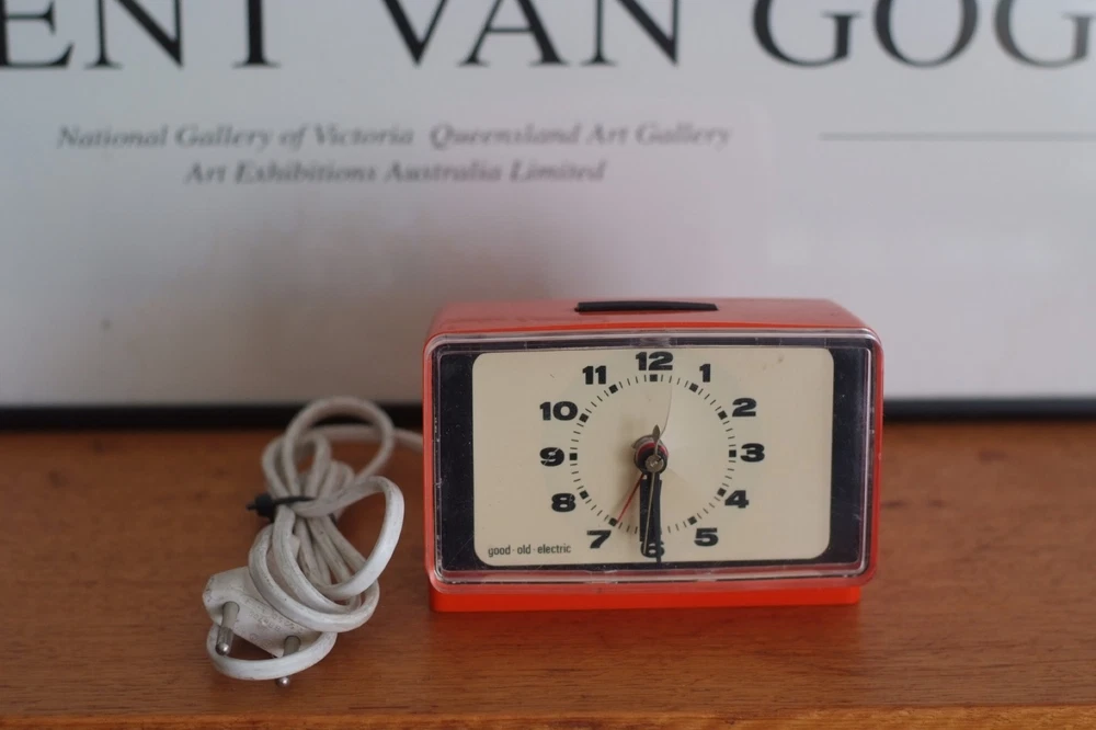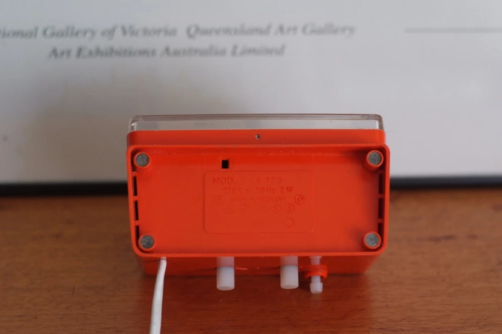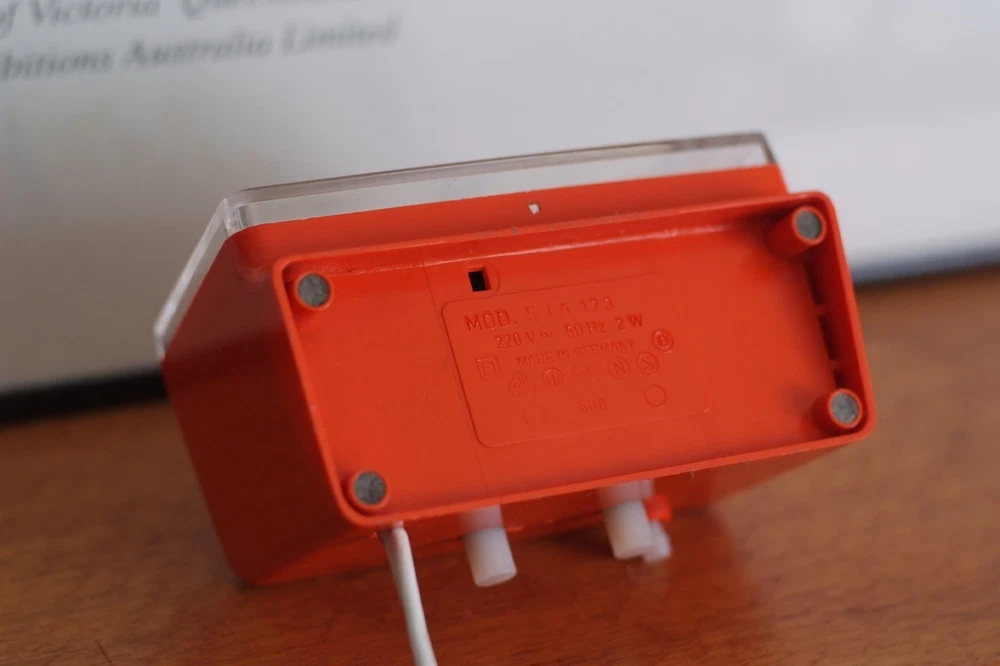 Hi, Up for grab is a nice desk clock made in Germany. manufacture stamped at the bottom. Beautiful mid century design, with a space age touch. nice orange colour. Minimalist design with very legible face. small crack to the dial but does not detract the cool charm of the clock. Wrap around perspex glass thats very cool. the dial says good - old - electric, which is very cool Will suit a retro or modernist interior deco. Gets a lot of compliment as part of my collection for its simple design and colour scheme. tested, and in perfect working order. This is part of my private collection over many years, and will surely be a proud addition to your stable. Please refer to photos for more detail. If you have any question please feel free to get in touch. Thanks,