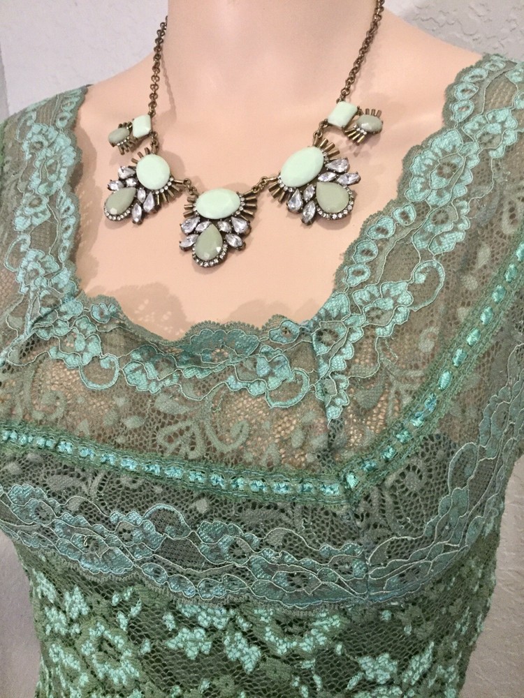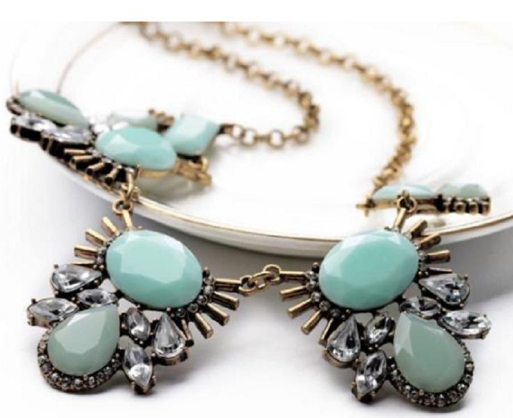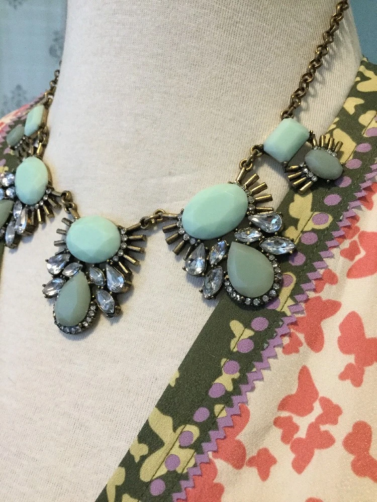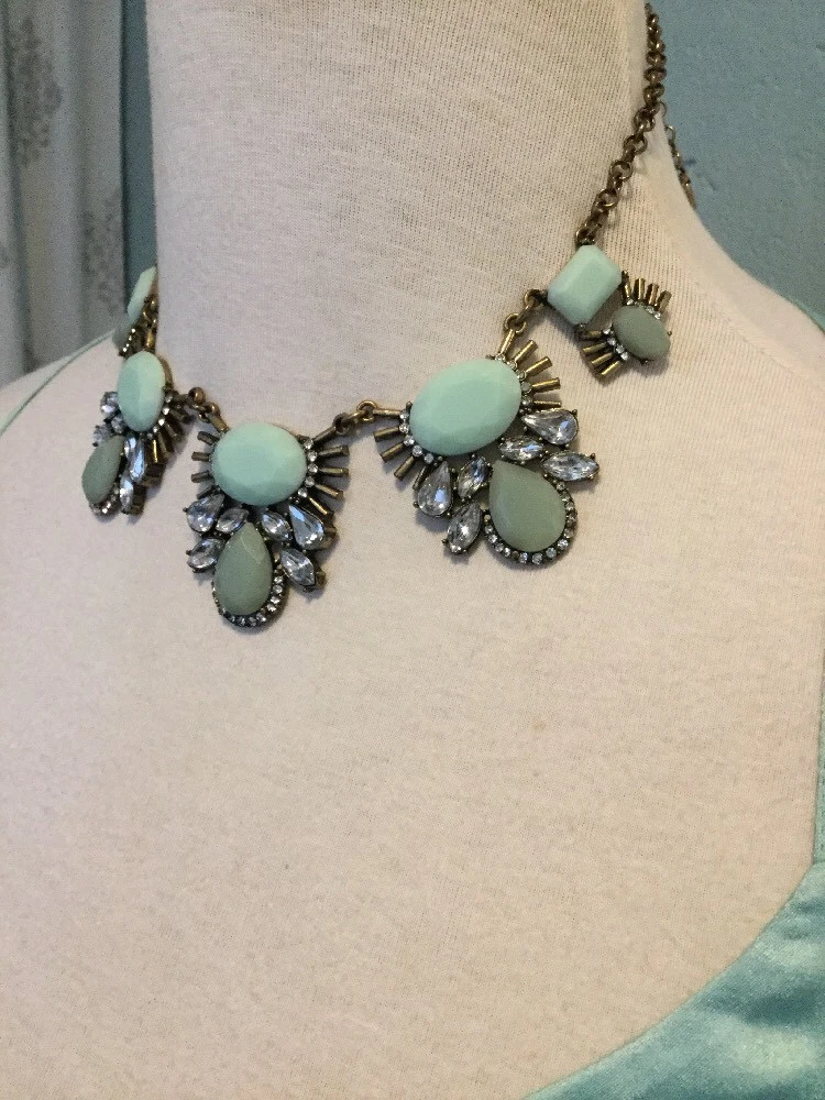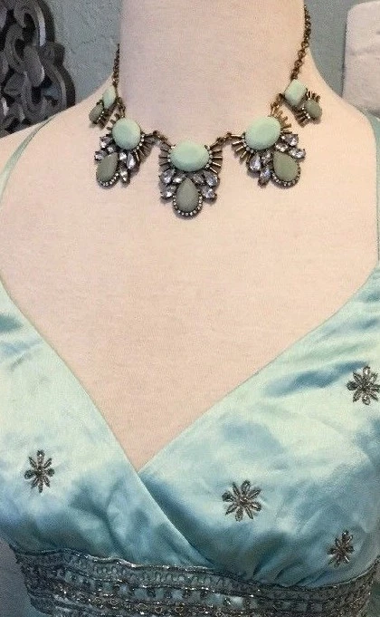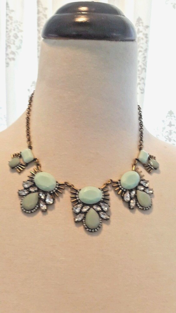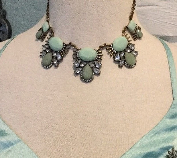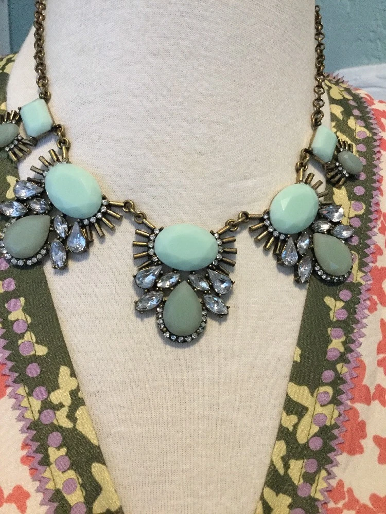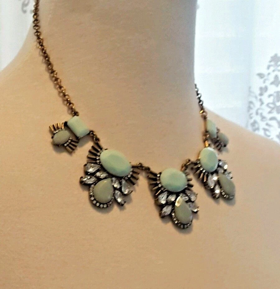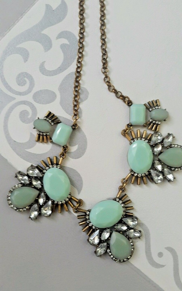 Very Pretty Necklace with Greenish Blue Resin Stones with crystal stones. Shown in many of my photos of Anthropologie items - it has that Anthropologie flair - but not purchased there. It was a purchase made at Joss and Main. Please take a look at my other unique items - I combine shipping!