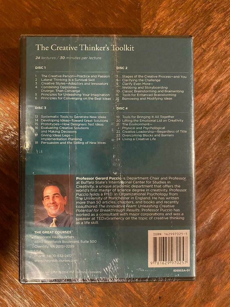Item specifics Condition: Brand New: An item that has never been opened or removed from the manufacturer’s sealing (if ... Read more about the condition Sub-Genre: Creative Thinking Studio: The Teaching Company, Great Courses Case Type: Tall/DVD Case Format: DVD Modified Item: No Music Artist: Gerard Puccio Type: DVD Video Lectures Country/Region of Manufacture: United States Region Code: DVD: 1 (US, Canada...) Special Attributes: Book and DVD Publisher: The Teaching Company Director: Gerard Puccio