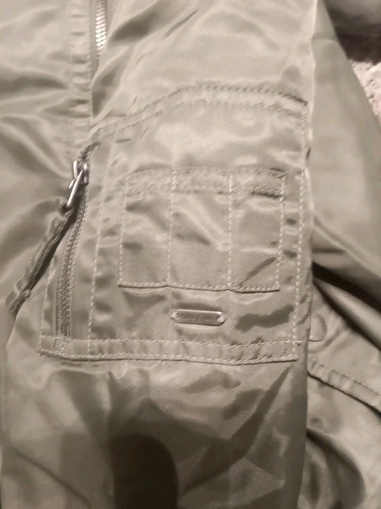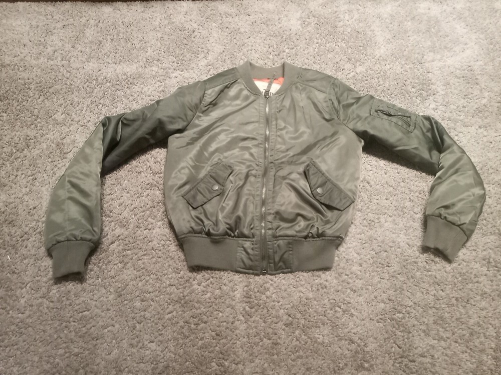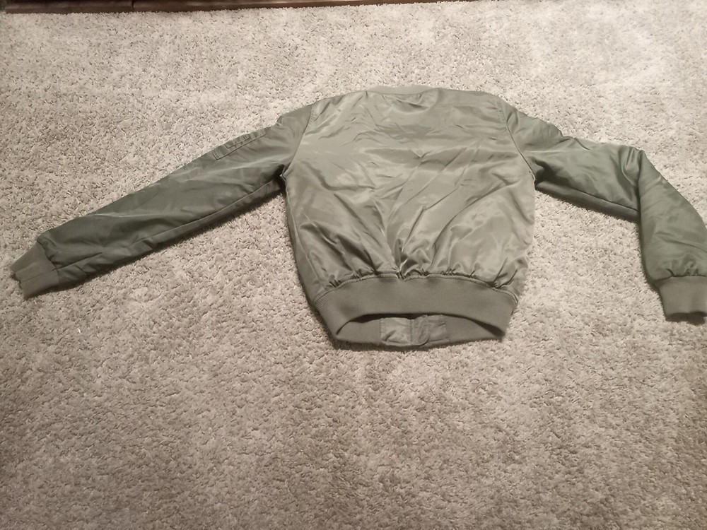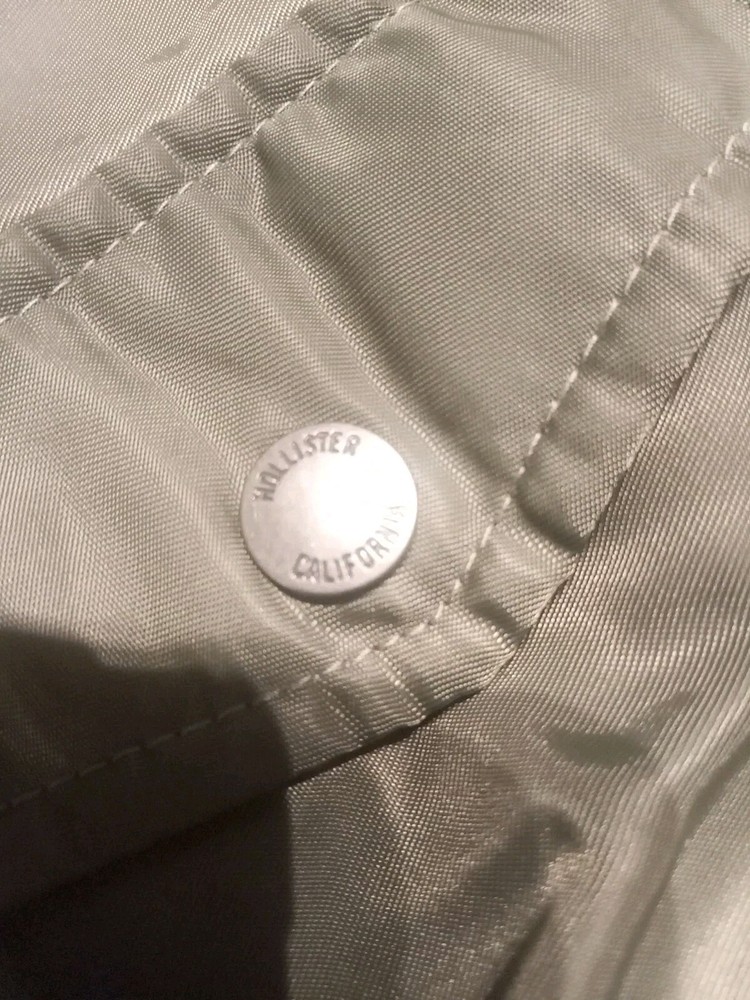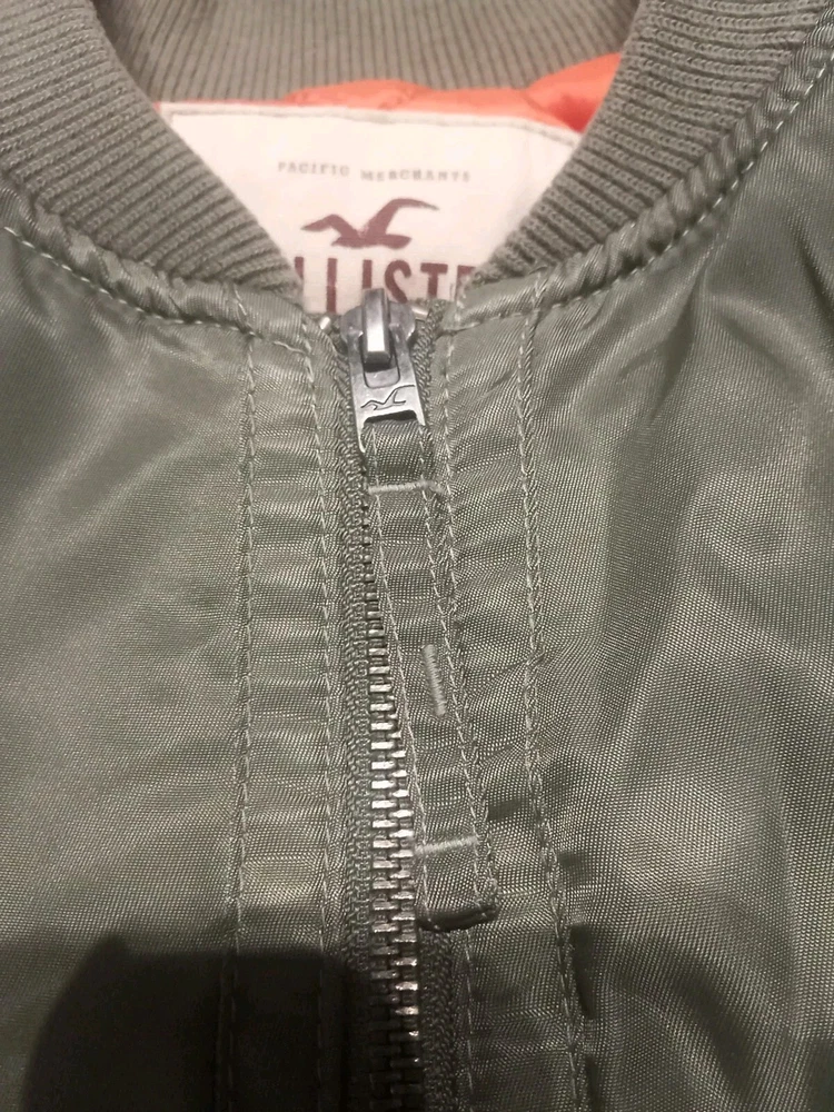This green Hollister bomber jacket is the perfect addition to your wardrobe. Made with polyester material, it is mid-length and has a regular size fit. The jacket features a zip closure and is styled with a bomber jacket design, making it great for casual wear during the fall or spring season. The jacket is in great shape and has been well taken care of.