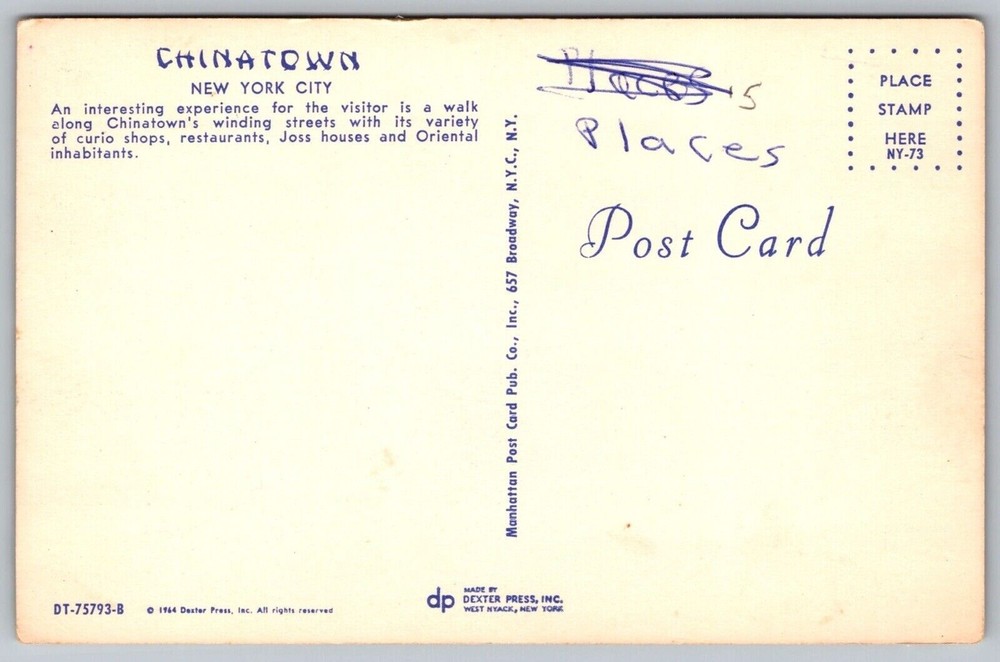 Greetings Chinatown New York Street View Old Cars Restaurant Joss House Postcard You will receive the exact postcard in the picture. We use a high quality scanner to capture pictures of the front and back for every postcard we have listed. Postcards will be in the condition as shown in the pictures. We ship Mon-Fri. We also offer combined shipping discounts or free shipping. If we have shipping on your listing you can buy as many additional postcards as you want and they will ship for free after the fist postage is paid. If you select first class shipping and pay the extra your postcard will be shipping as a package with extra protection. If you choose free shipping or $1.50 shipping your postcard will be shipped in a standard envelope with soft plastic sleeve and do not bend written on the envelope. Orders of 15 or more cards or with single cards over $20 in them will automatically be upgraded to first class and at least a photo mailer. If you have any questions feel free to ask. We are willing to consider reasonable offers and we offer discounts on orders of more than one card. Thank You _gsrx_vers_1436 (GS 9.0.5 (1436)) _gsrx_vers_1706 (GS 9.9 (1706))