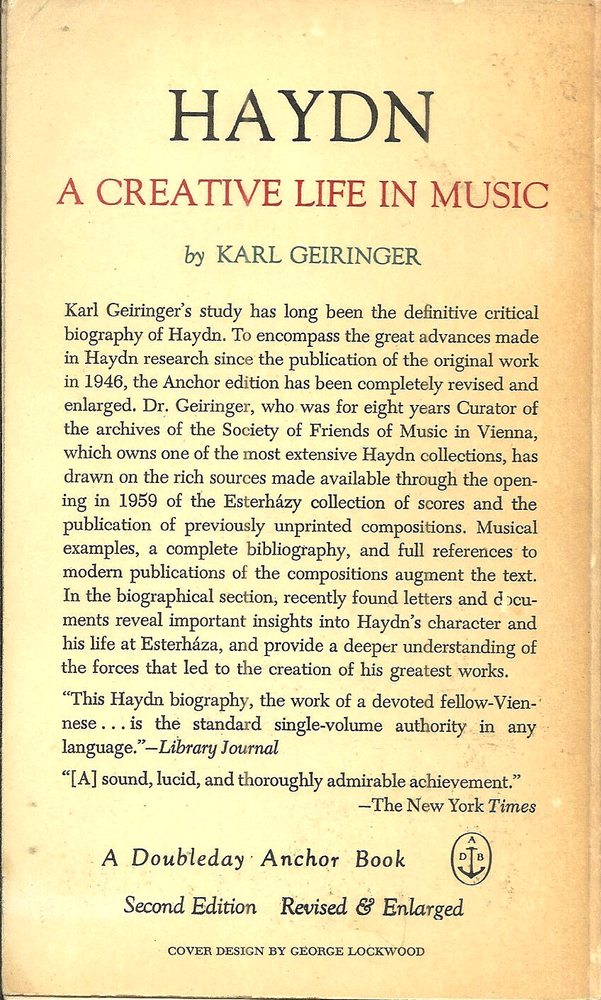 Measures 4-7/32" X 7-1/8", 430+ pp, written by Karl Geiringer, published by Doubleday & Co. (NY), Anchor paperback #A 361. Shipping charges include postage (including USPS Tracking on domestic shipments), packaging materials, labor & fuel (the nearest post office is 14 MILES away!); but I do combine shipping charges on multiple items -- so fill up that cart NOW an' save some $$$!
