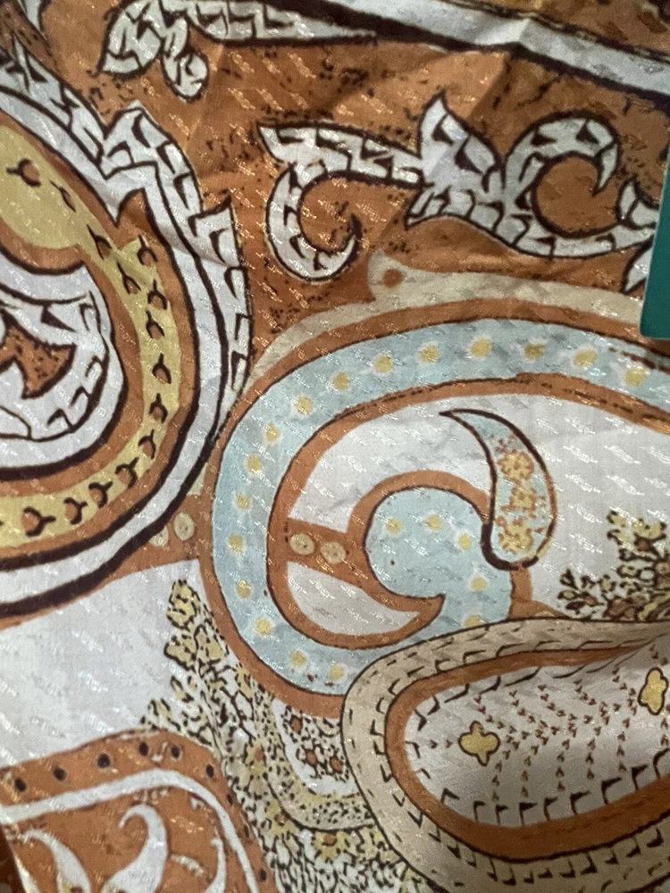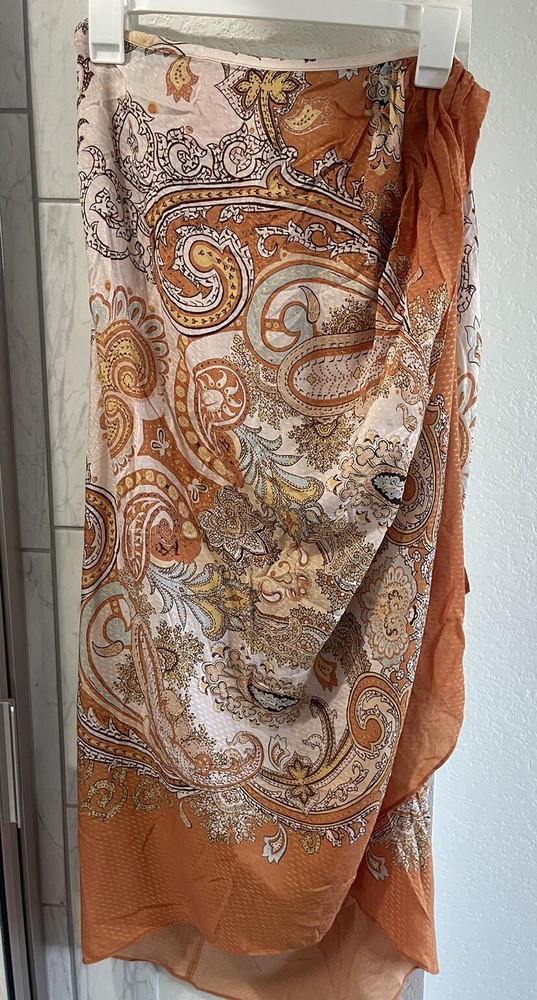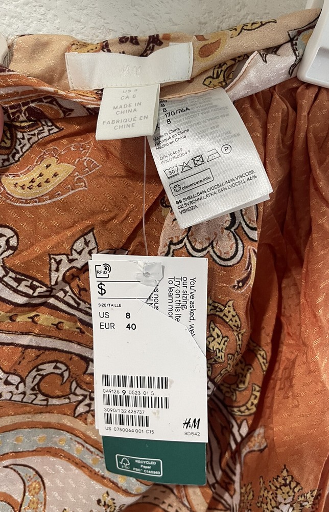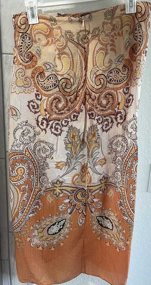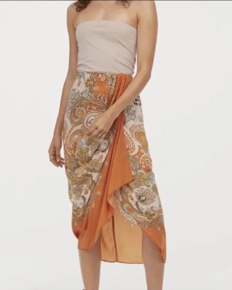 This gorgeous H&M skirt is perfect for any occasion. With a beautiful paisley pattern and a sarong style drape front, it's a must-have addition to any bohemian-inspired wardrobe. The skirt has a faux wrap design with a zip closure and a mid-rise fit, making it both comfortable and stylish. Size: Waist: Circumference: 77.0 cm (Size 8), Back: Length: 87.0 cm (Size 8)