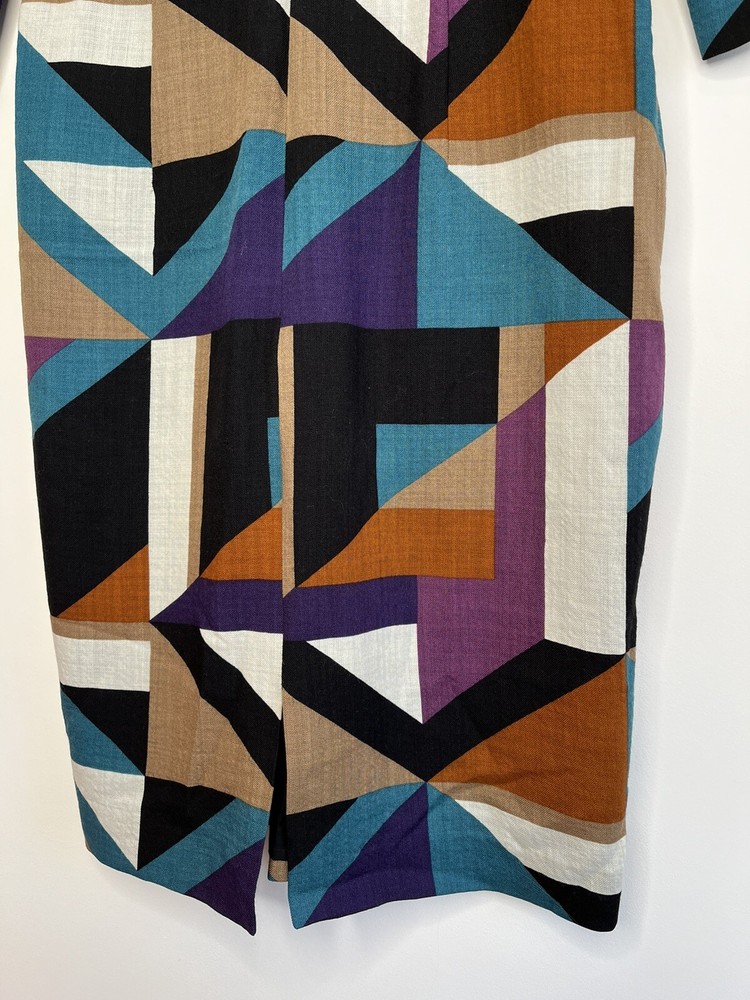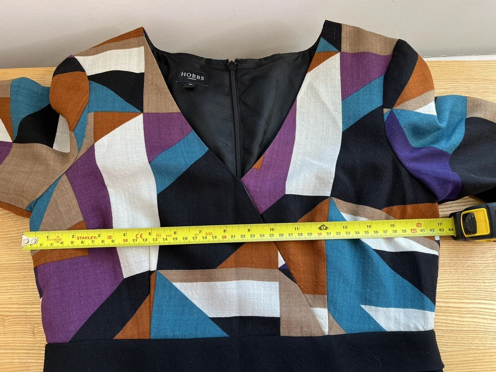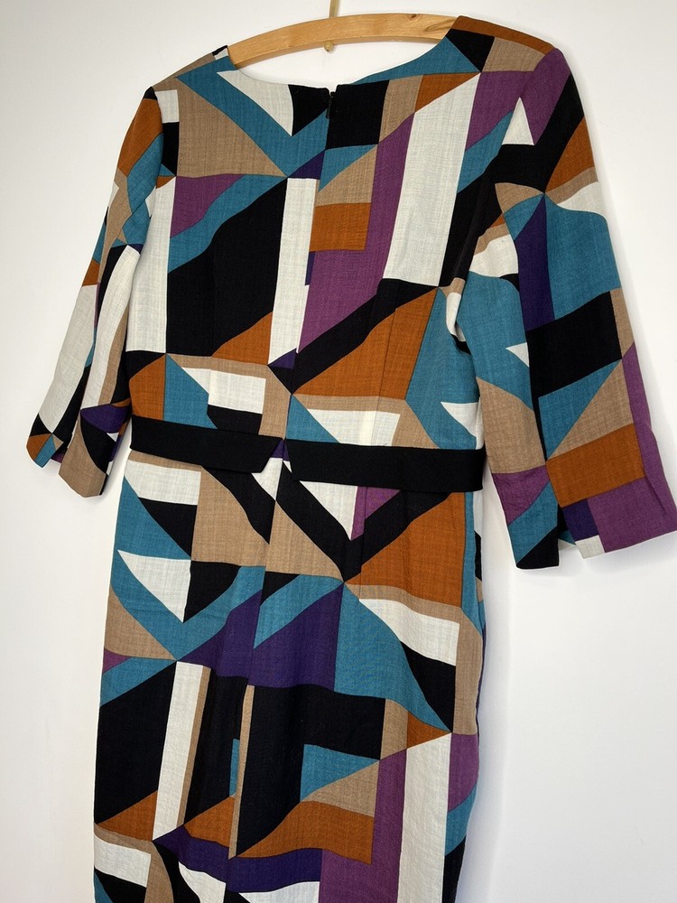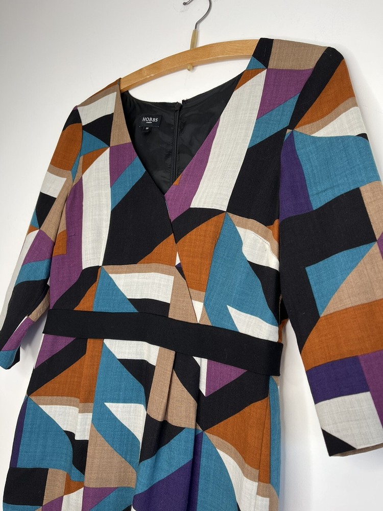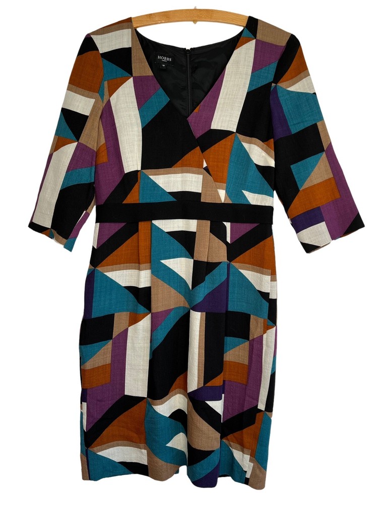 HOBBS Lightweight Wool Dress in Geometric Print Lined; Zip to neck Size 10 Please see photos for measurements Good condition (small pull/line on shoulder, please see photos carefully)...