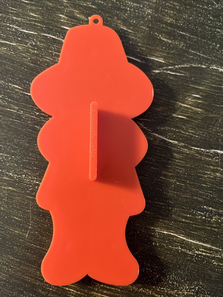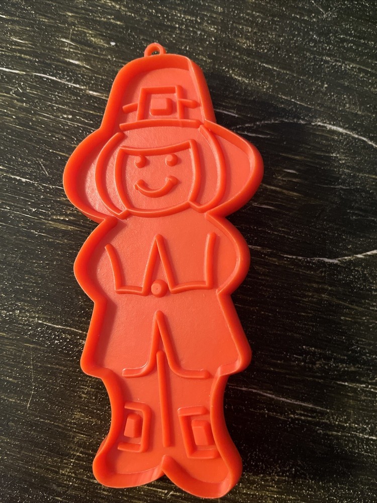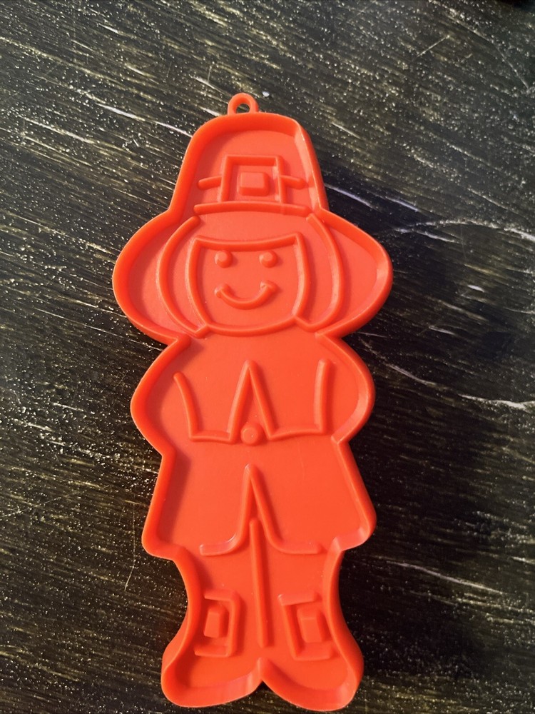 Add some Thanksgiving flair to your baking with this vintage Hallmark cookie cutter. Featuring an ambassador pilgrim man in a bright orange color, this medium-sized plastic cutter measures 5 1/4 inches in length and 2 1/2 inches in width. With a novelty pattern and reusable features, this cookie cutter is perfect for your Thanksgiving occasion. The handle makes it easy to use, and it's a great addition to any baking collection. Don't miss out on this unique and charming item! Used as a decorative piece only. Looks new.