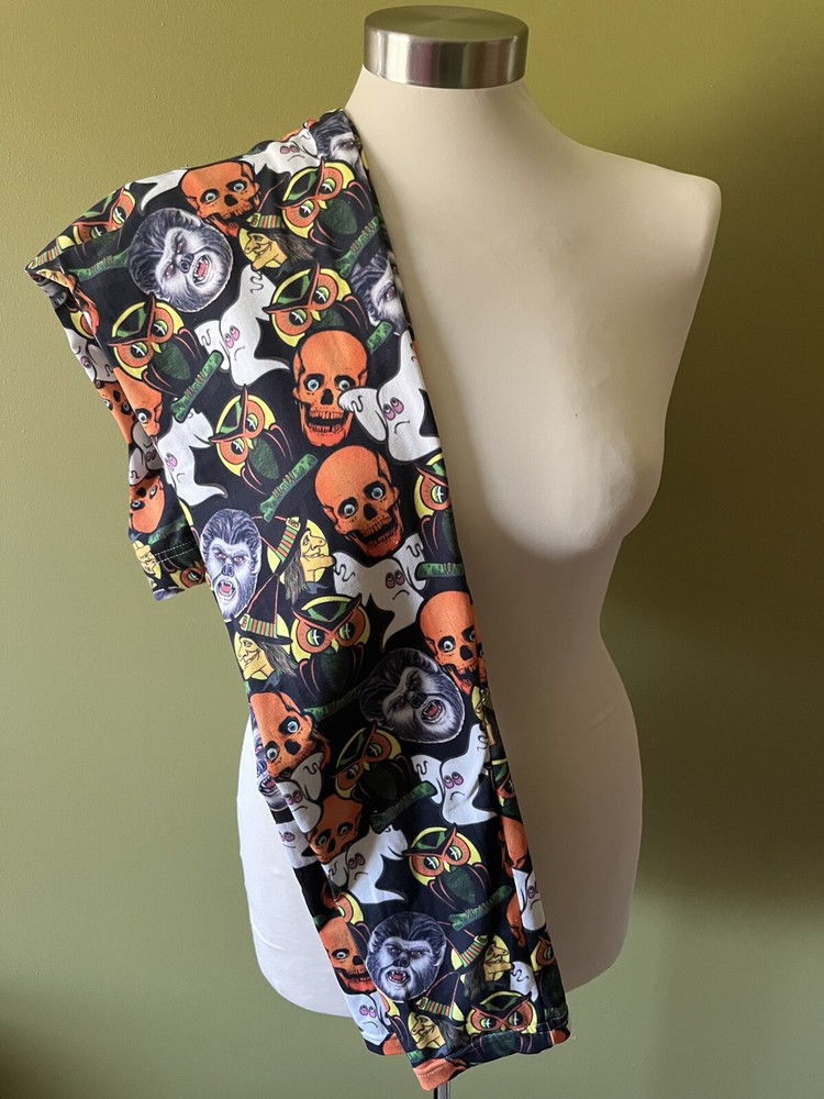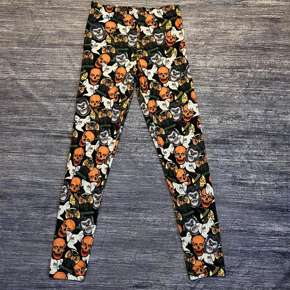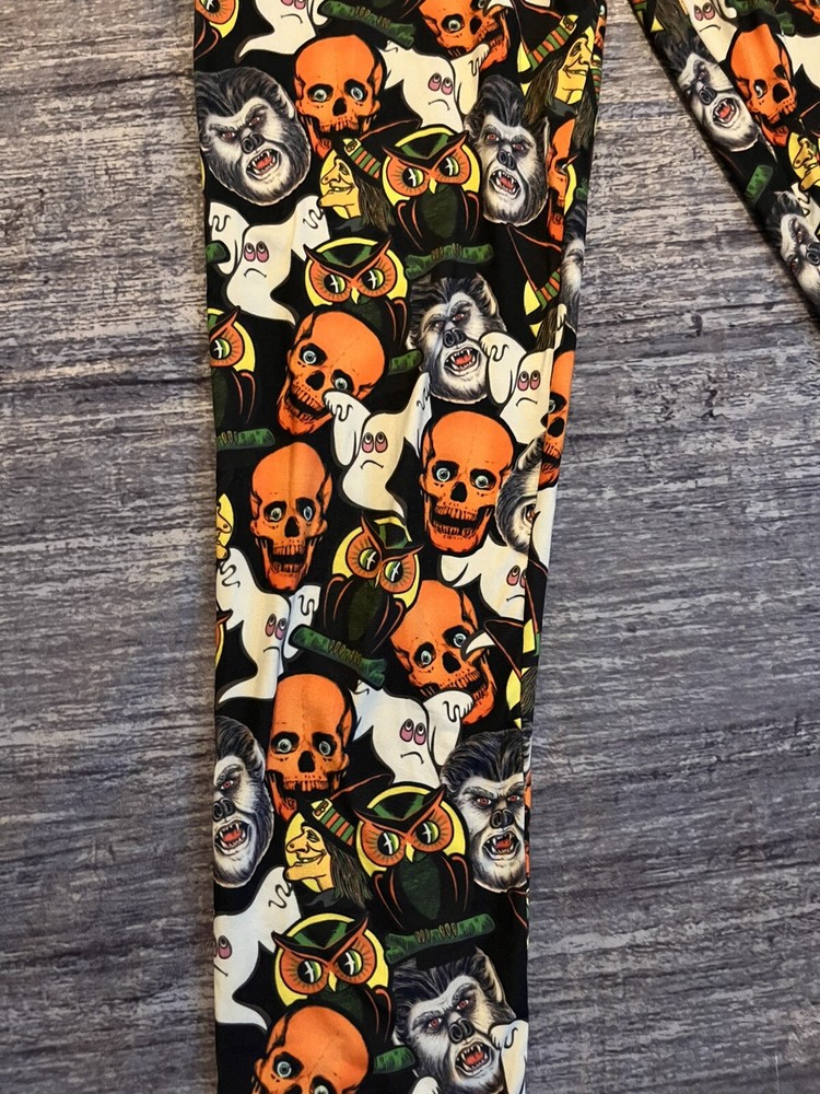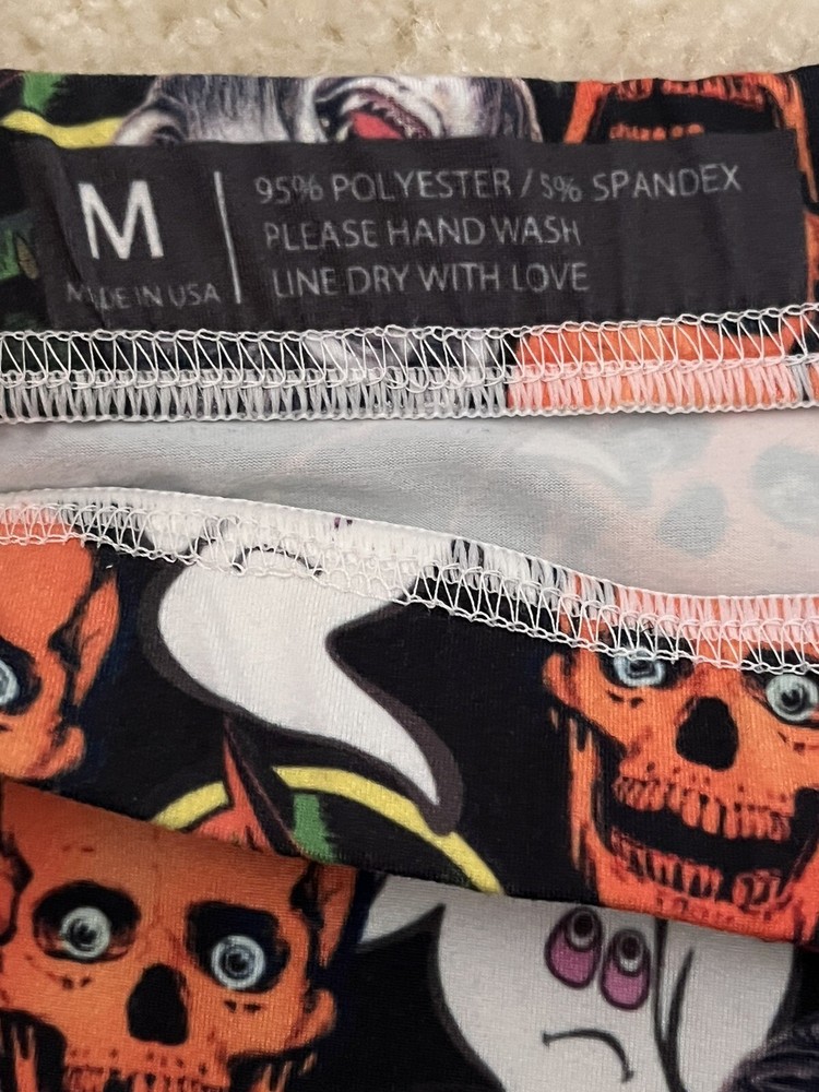 Women’s black and orange vintage Halloween images leggings made with 95% brushed polyester 5% spandex Waist measurement unstretched is 27” Inseam is 29” Tags says medium but fits more like an extra small. Check your own waist measurement before buying. Never worn, excellent condition Buttery soft feel.