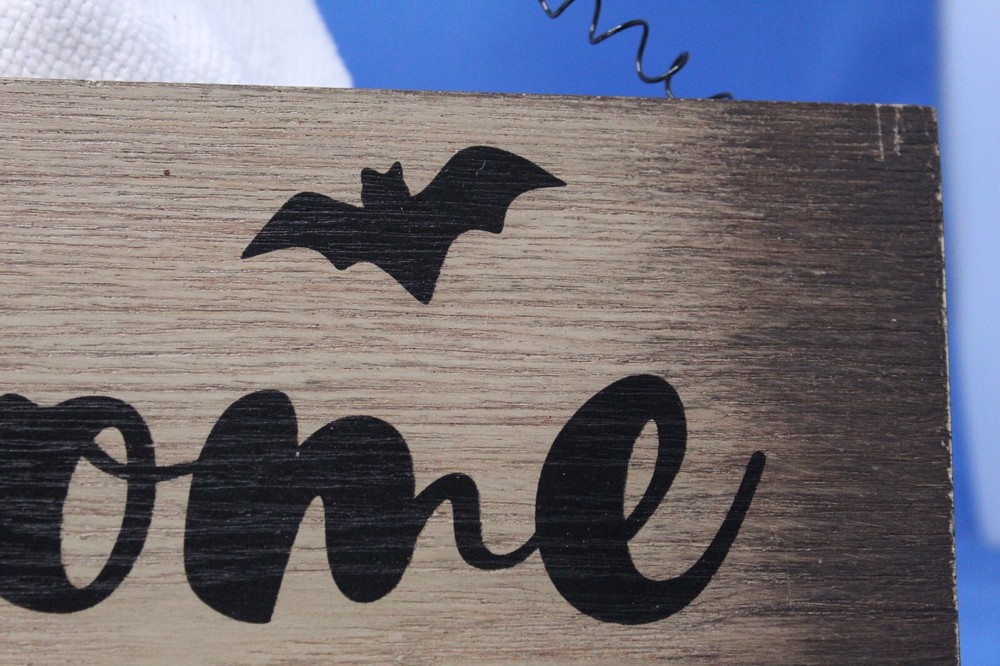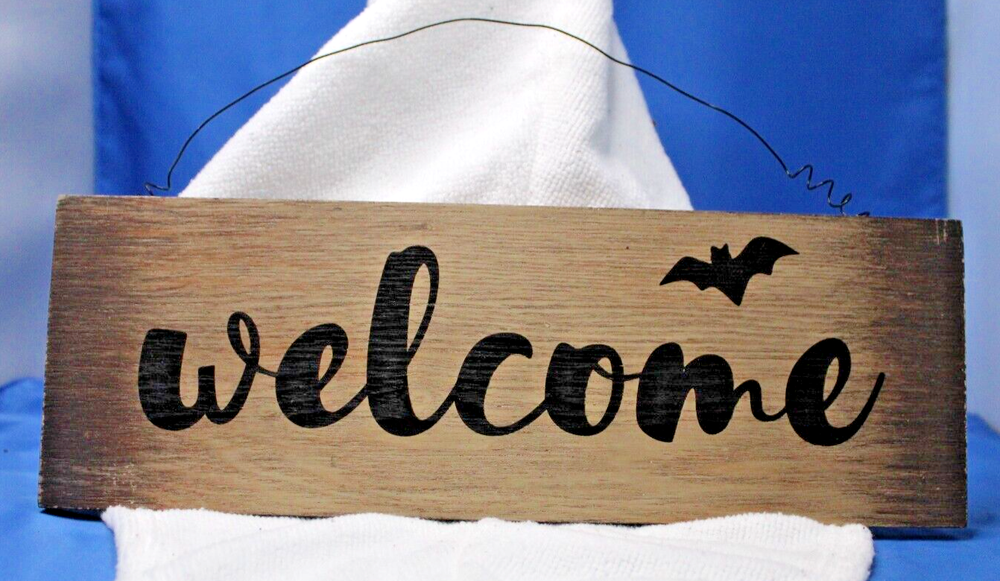 Halloween Welcome Sign Creative Co op Wooden with Wire Hanger Bat 12.5" x 4"...