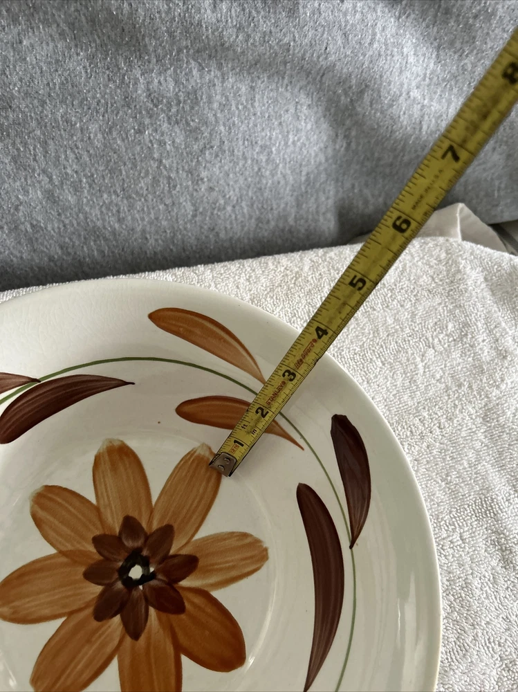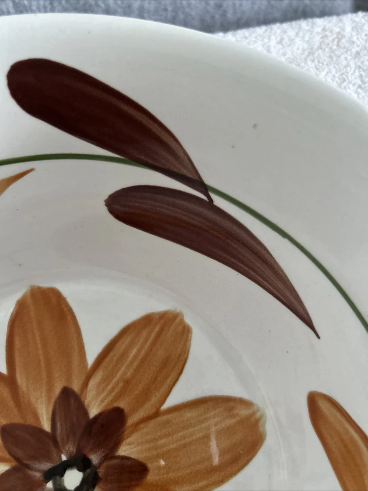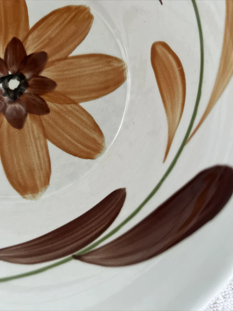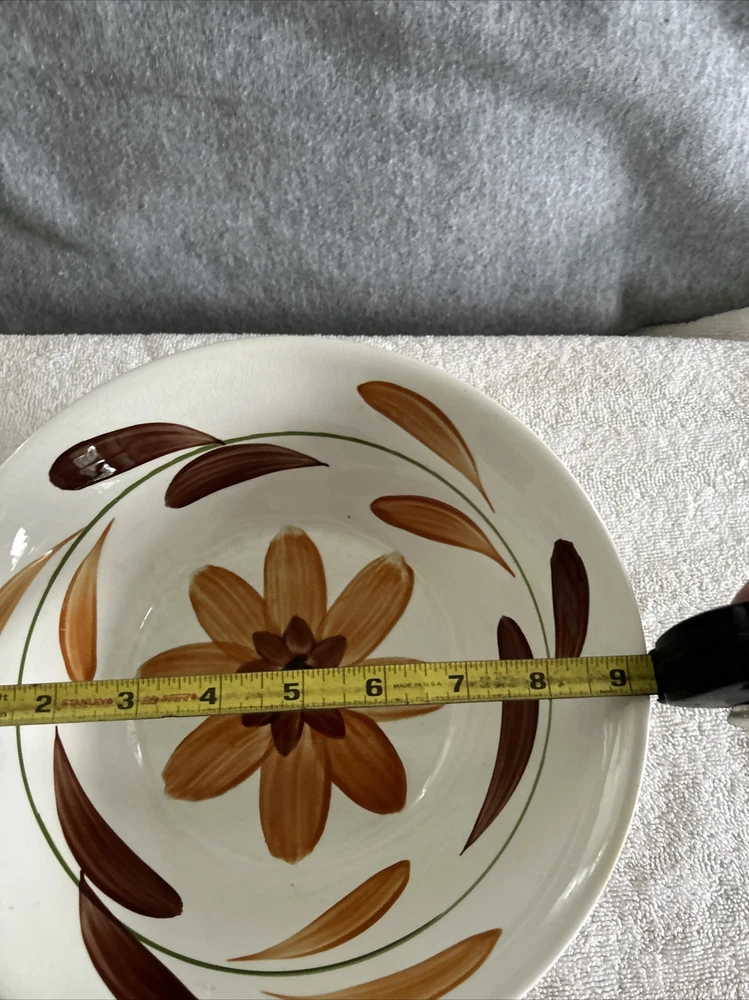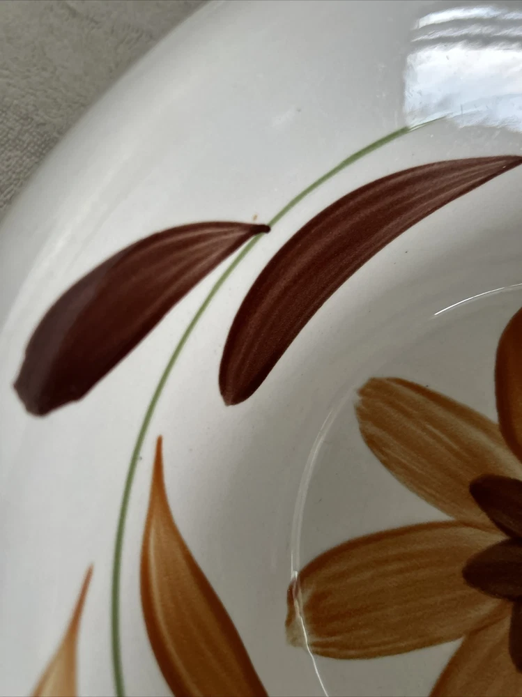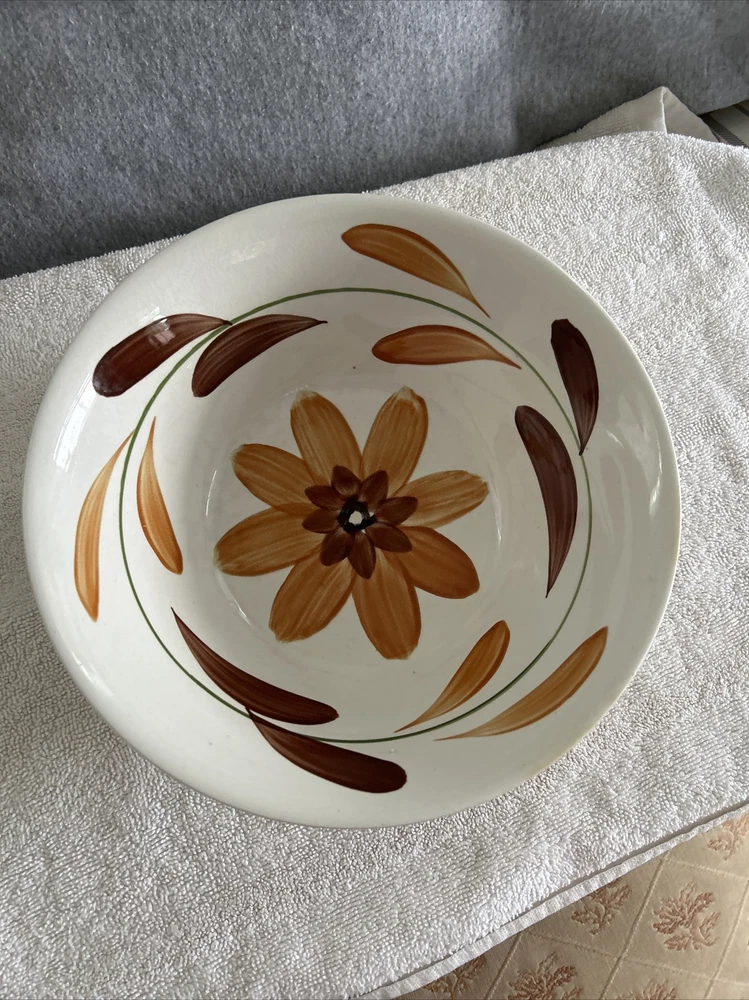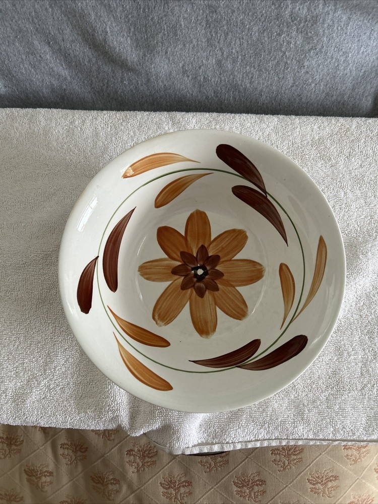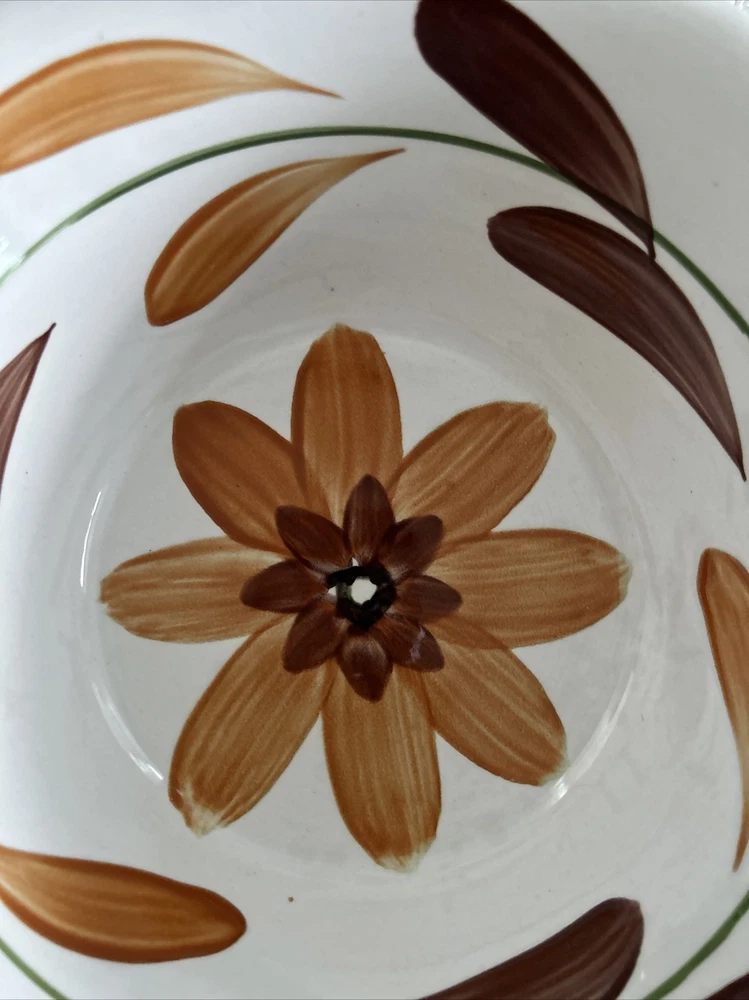 This vintage ceramic bowl features hand-painted floral designs in yellow, brown, and orange. The round shape and 7-inch diameter make it a perfect addition to any kitchen or dining room. The bowl is an original piece from the mid-20th century, manufactured in Japan by the Ironstone brand. The backstamp is painted and the finish is glossy. The bowl is not antique and is not a licensed reproduction. It is a single item in the set and is not handmade. This Mid-Century Modern style bowl is perfect for serving fruits or salads and will add a touch of vintage charm to your collection.