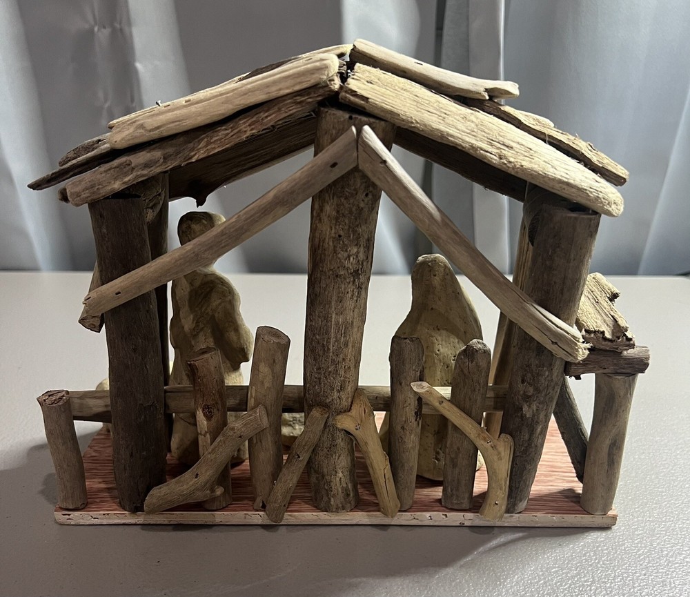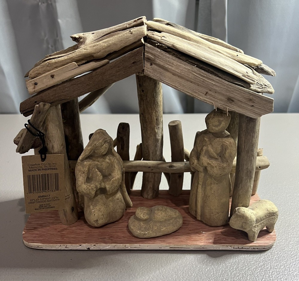 New with tag. Outer packaging has slight damage as pictured. Handmade Driftwood and Paper Mache Nativity with Wood Base Description Materials: 80% Driftwood, 10% Wood Base, 10% Paper Pulp 10"L x 3-1/2"W x 7-1/2"H Handmade Driftwood & Paper Mache Nativity w/ Wood Base (Each One Will Vary) Overall Width 10.00" Overall Depth 3.50" Overall Height 7.50"