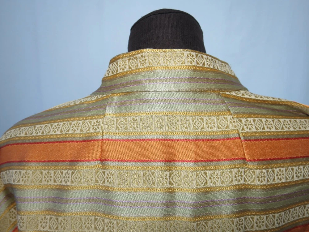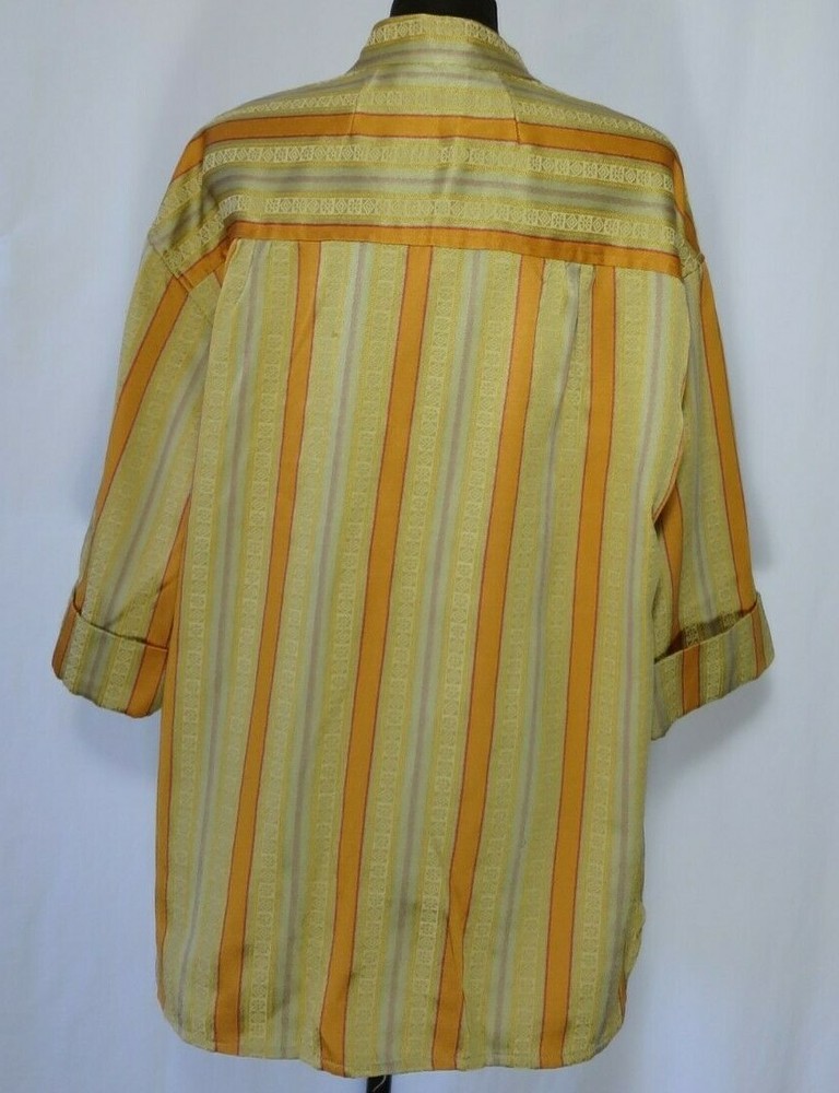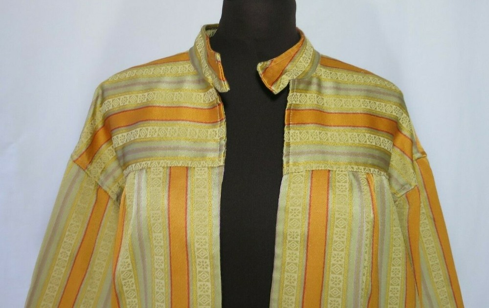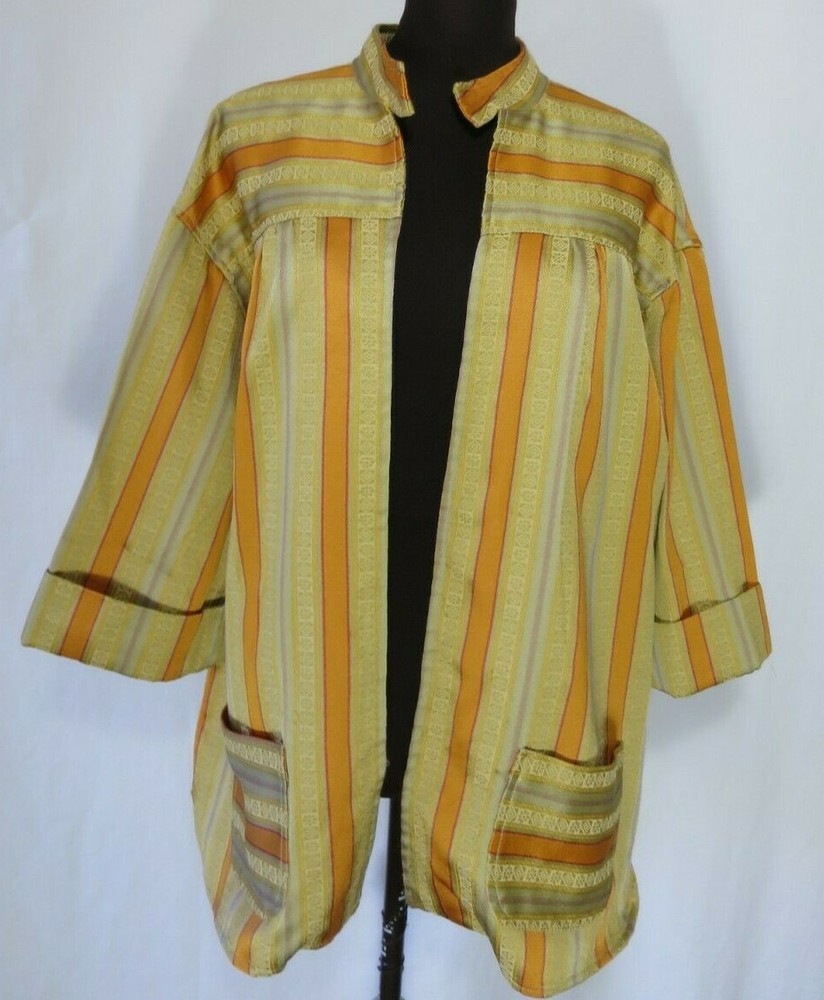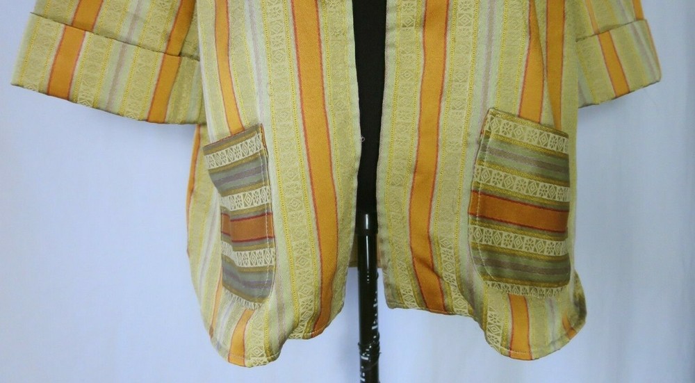 Description Custom Made Jacquard Open Front Jacket Size: Measures Large (Please see measurements below) Color: Gold, Orange, Beige Stripes Sumptuous Midweight Jacquard Fabric Extended Stand Up Collar Front and Back Yokes with Softly Gathered Bodice Below Back Neck Darts for Shaping (See Photo #7) 3/4 Length Sleeves with 2 1/2" Cuffs Rounded Patch Pockets Curved Hem Open Front - No Closures Fabric: No Tag, Appears to Be Cotton/Rayon Blend Garment Care: Dry Clean Only Condition: Very good condition. Handmade, so no tags, size or fabric information. Please check measurements above. No stains, holes or damage. Please use the zoom tool and take a close look at all photos as they are an important part of the description. (Bayside Marketplace Item No. TJS-769) Measurements: (Taken with garment lying flat. Compare measurements below to something that already fits you the way you like!) Bust across front from under arm to under arm: 22" (x2= 44") Under arm to bottom of hem: 17.5" Under arm to end of sleeve: 10.5" Shoulder seam to end of sleeve: 14" Shoulder seam to shoulder seam across back: 22" Back of neck line to bottom of hem at back: 30" Bottom hem (from side seam to side seam): 23" Selling for Original Owner Email me if you have any questions See more fun things in our store: Bayside Marketplace Thanks for looking and happy eBaying!!!