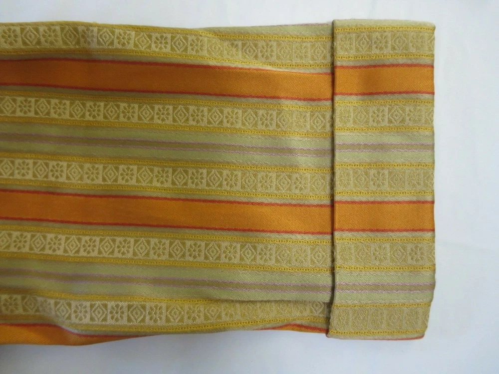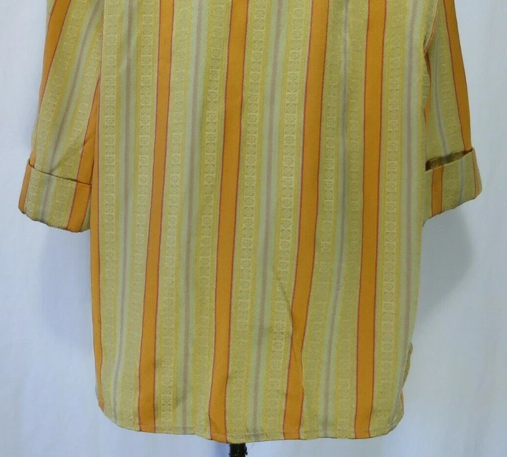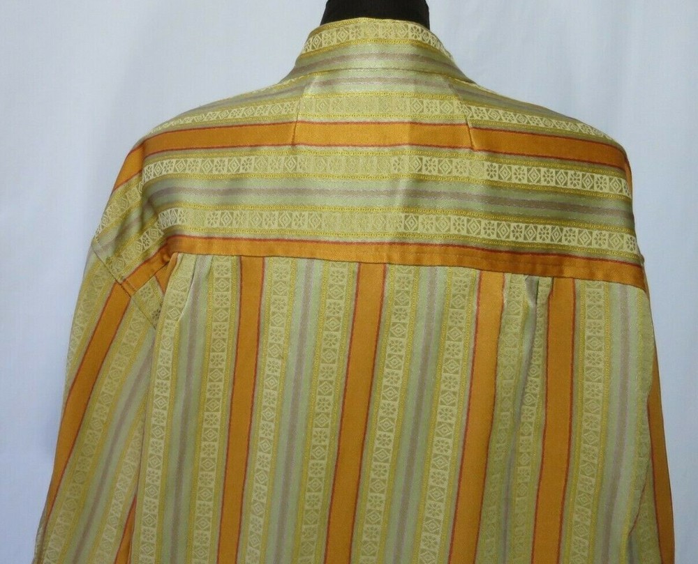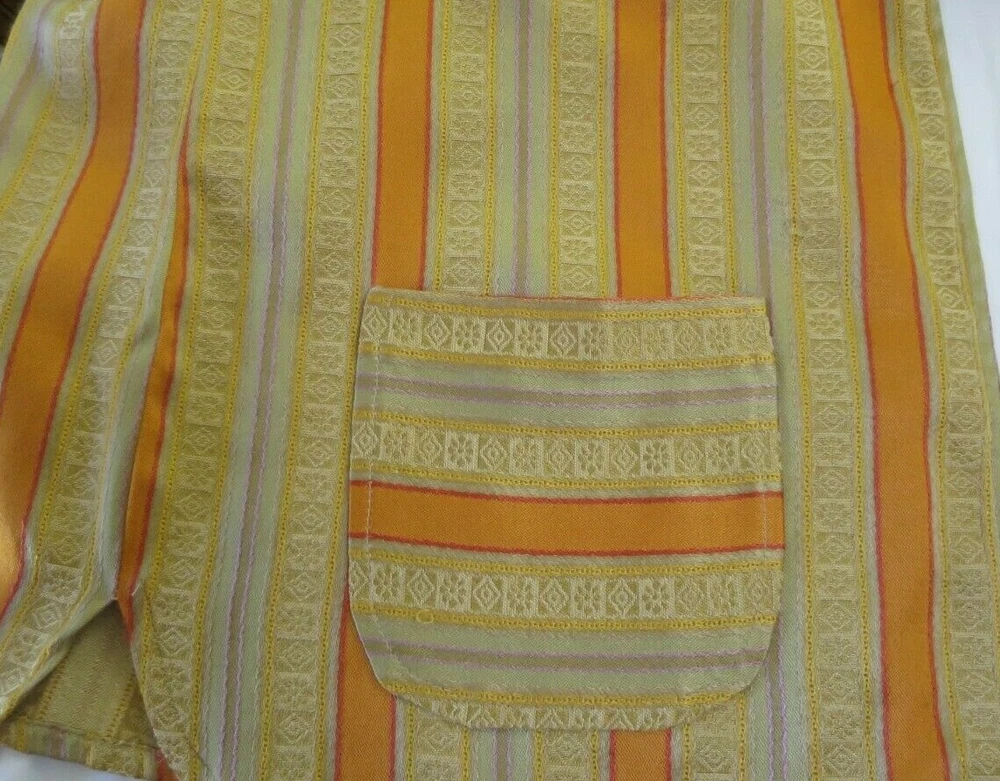 Description Custom Made Jacquard Open Front Jacket Size: Measures Large (Please see measurements below) Color: Gold, Orange, Beige Stripes Sumptuous Midweight Jacquard Fabric Extended Stand Up Collar Front and Back Yokes with Softly Gathered Bodice Below Back Neck Darts for Shaping (See Photo #7) 3/4 Length Sleeves with 2 1/2" Cuffs Rounded Patch Pockets Curved Hem Open Front - No Closures Fabric: No Tag, Appears to Be Cotton/Rayon Blend Garment Care: Dry Clean Only Condition: Very good condition. Handmade, so no tags, size or fabric information. Please check measurements above. No stains, holes or damage. Please use the zoom tool and take a close look at all photos as they are an important part of the description. (Bayside Marketplace Item No. TJS-769) Measurements: (Taken with garment lying flat. Compare measurements below to something that already fits you the way you like!) Bust across front from under arm to under arm: 22" (x2= 44") Under arm to bottom of hem: 17.5" Under arm to end of sleeve: 10.5" Shoulder seam to end of sleeve: 14" Shoulder seam to shoulder seam across back: 22" Back of neck line to bottom of hem at back: 30" Bottom hem (from side seam to side seam): 23" Selling for Original Owner Email me if you have any questions See more fun things in our store: Bayside Marketplace Thanks for looking and happy eBaying!!!
