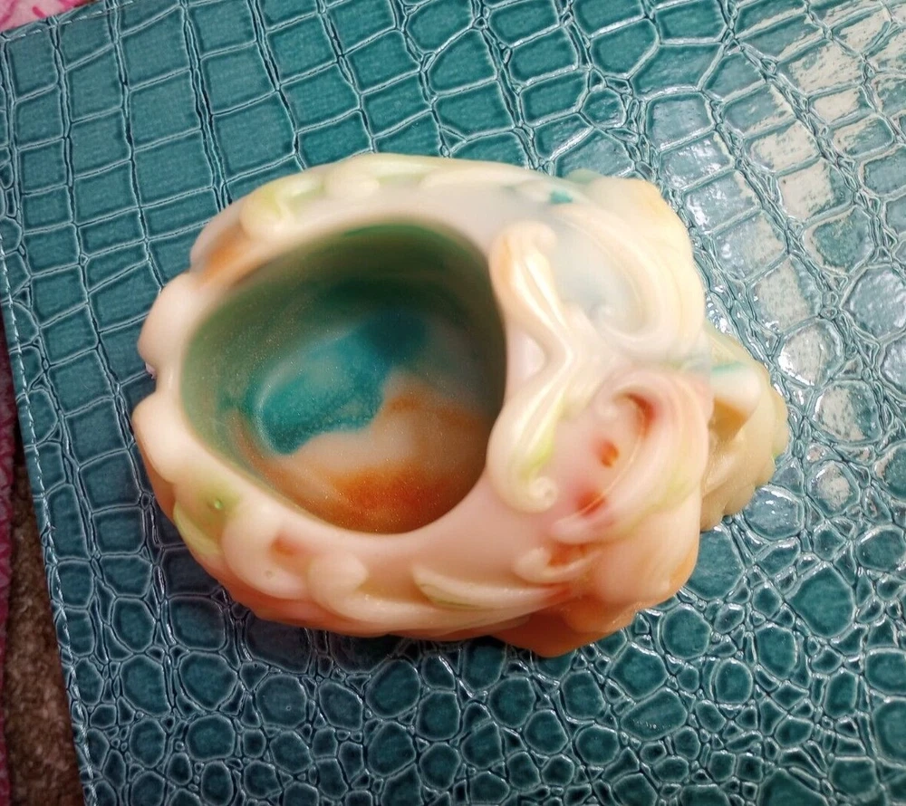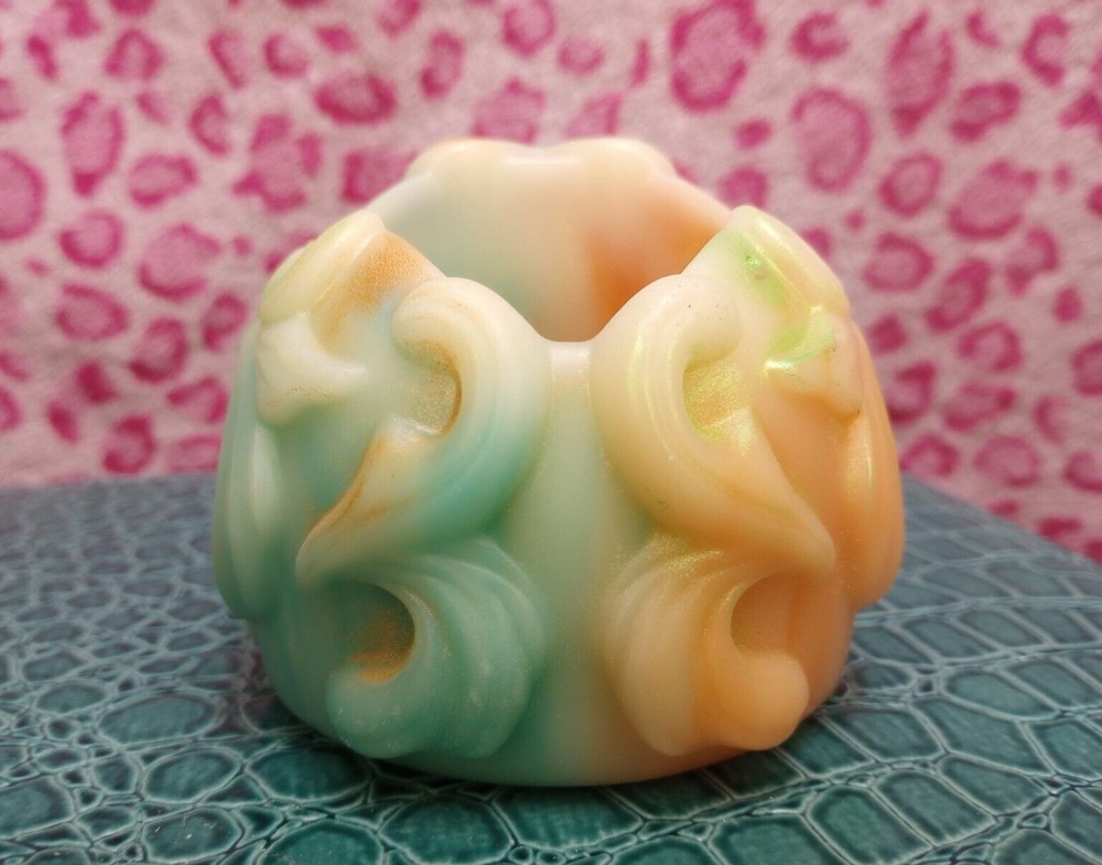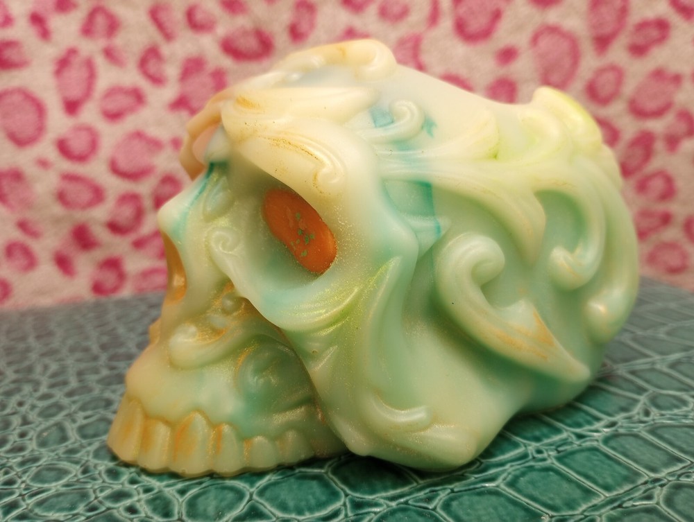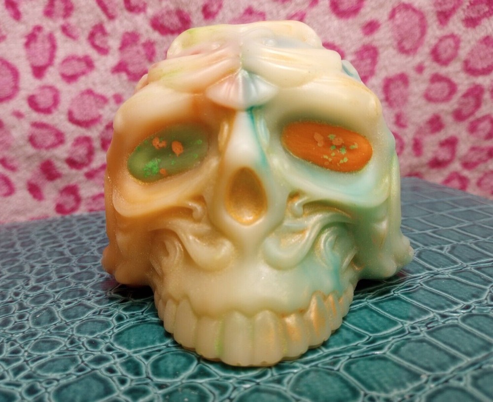 This unique candle holder features a skull shape, making it a perfect addition to your collection of decorative art pieces. The candle holder is handmade and crafted with soy wax, ensuring a high-quality product. The holder is medium-sized, with dimensions of 3 inches in length, width, and height. The candle holder comes in green and orange colors, adding a pop of color to any room. It can be used for all occasions and is perfect for those who appreciate original and unique art pieces. The holder is made in the United States with high-quality materials.