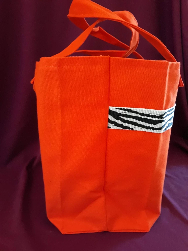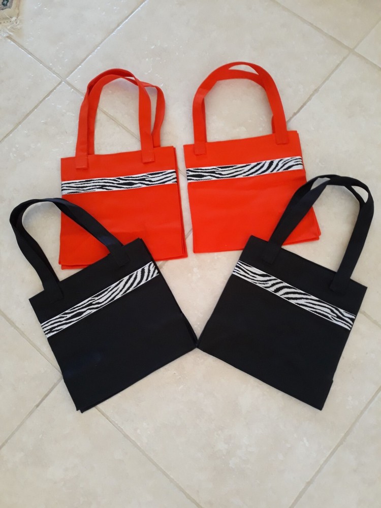 Handmade Tote Bags - 2 Orange and 2 Black Totes, Mid size, Zebra Trim - Unique!. Approximate size: 11 1/2" high, 10" wide, 8" deep. Personally designed and sewn with heavy duty duck cloth and a zebra trim. Seams double sewn. Great for shopping, using as a purse, or even for Halloween Trick or Treating. The bags can be washed and ironed. Do not iron the trim. No lining. Very durable! Domestic shipping only. All proceeds go to charity.