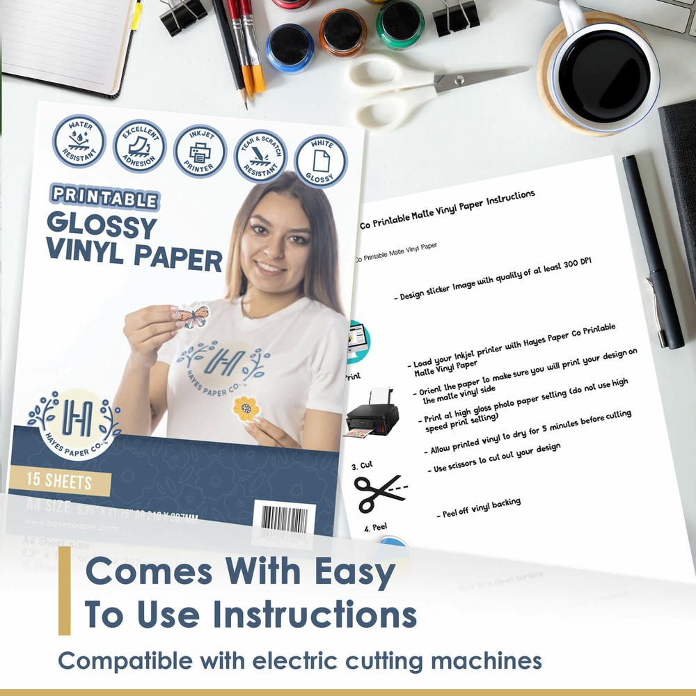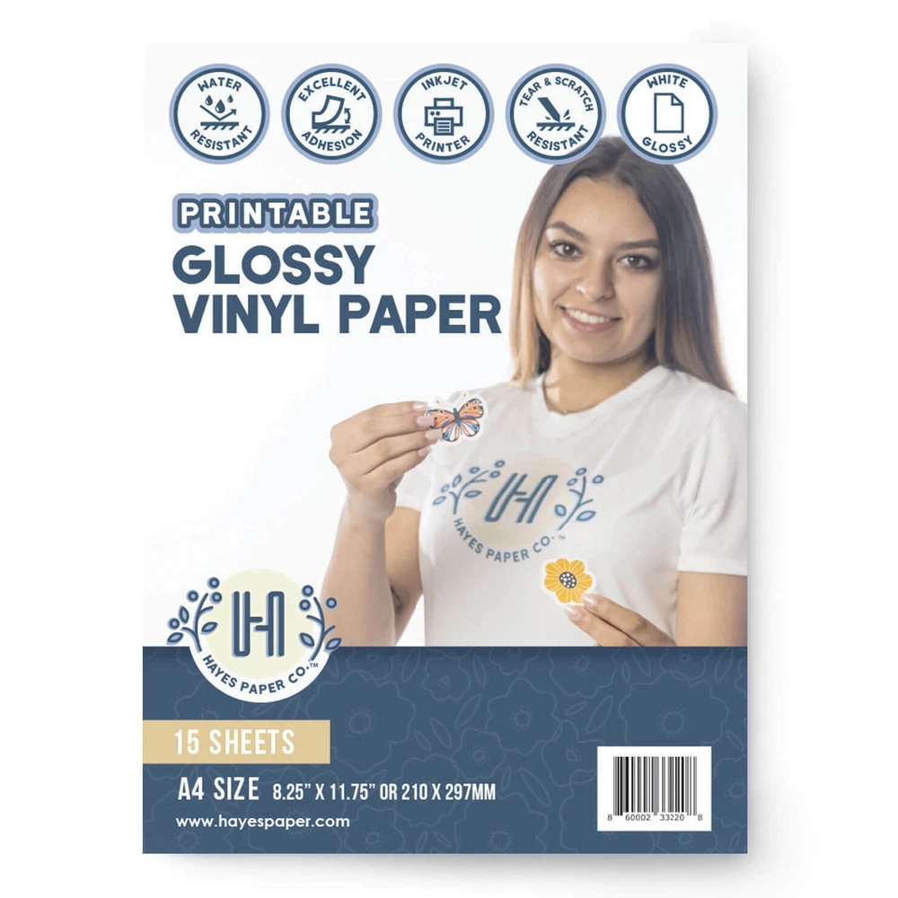 Unleash your creativity with Hayes Paper Co.® Glossy White Vinyl Paper. This vinyl paper is perfect for any project, personal or commercial. You can create customized stickers for laptops, water-bottles, glass, metal and plastics. Grab a pack and get printing. Features: 15 sheets per pack A4 Size: 8.25 x 11.75" Color White - Glossy Finish Water Proof Durable and long lasting Print using an a home or commercial inkjet printer Instructions included in the package