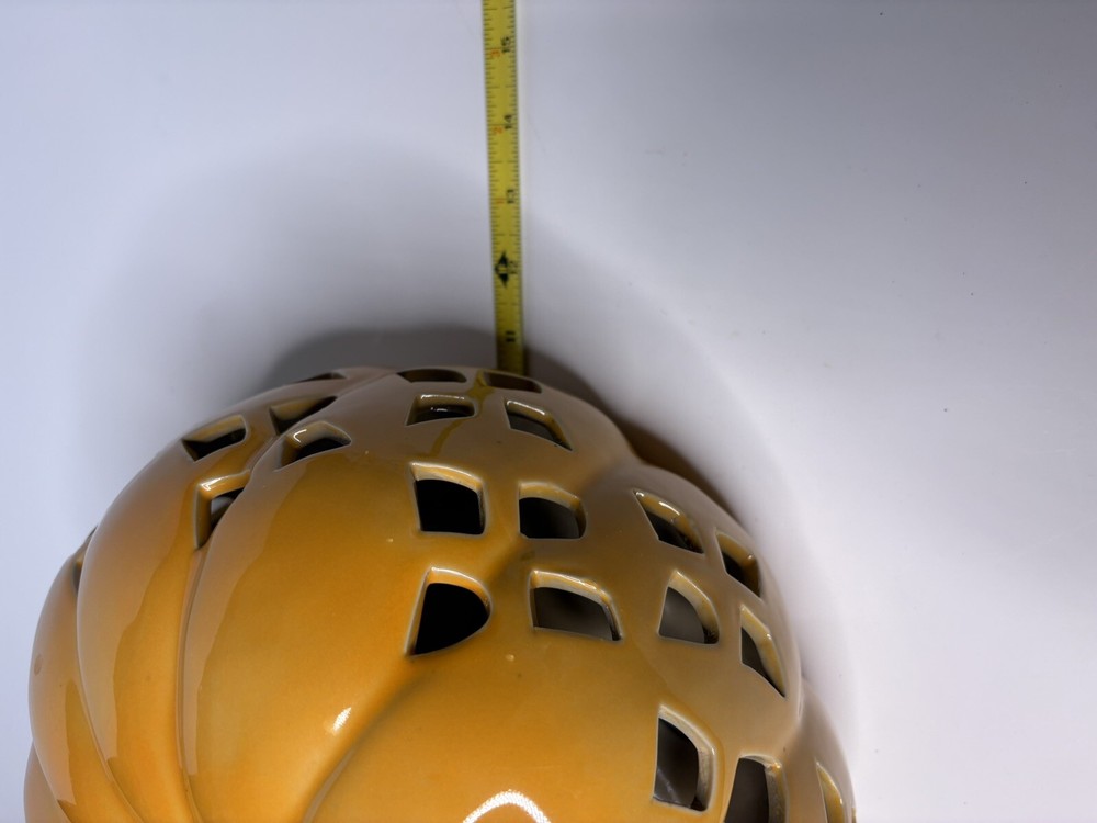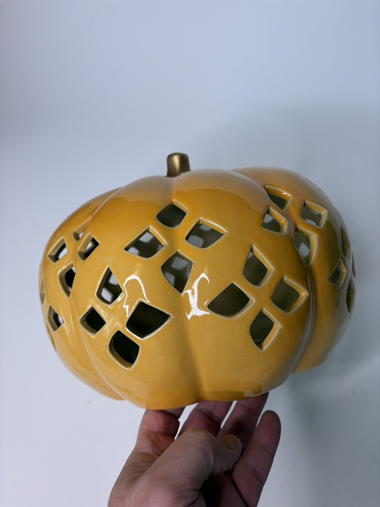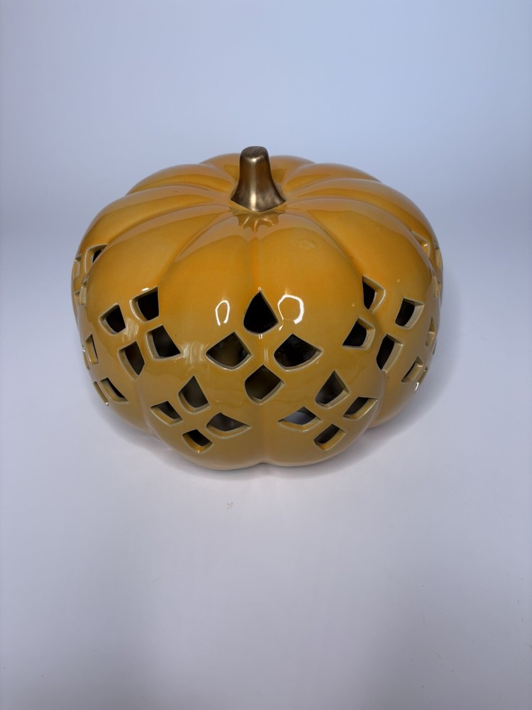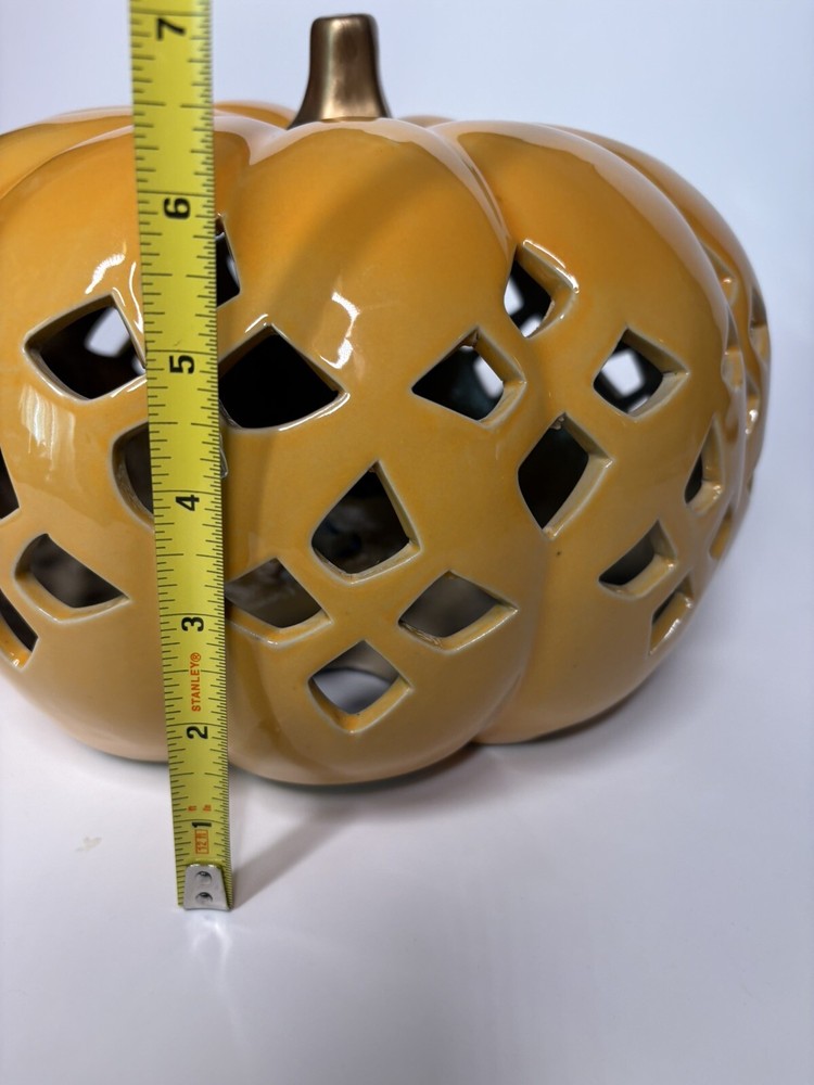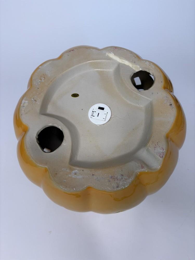 Add a touch of Halloween spirit to your home with this Haymarket Style Orange Lit Pumpkin. Crafted from ceramic, this medium-sized figurine features a classic pumpkin pattern in a vibrant orange color. Perfect for Thanksgiving-themed decor, this piece is sure to pierce the air with its intricate details and create a warm, cozy atmosphere in any room. Measuring 11"W x 7"H, this figurine is ideal for tabletop displays or as a centerpiece on your mantel. Bring the joy of Halloween into your home with this charming ceramic figurine.