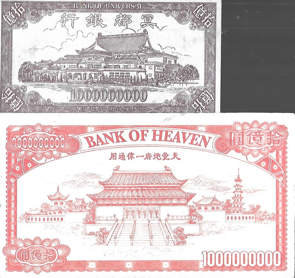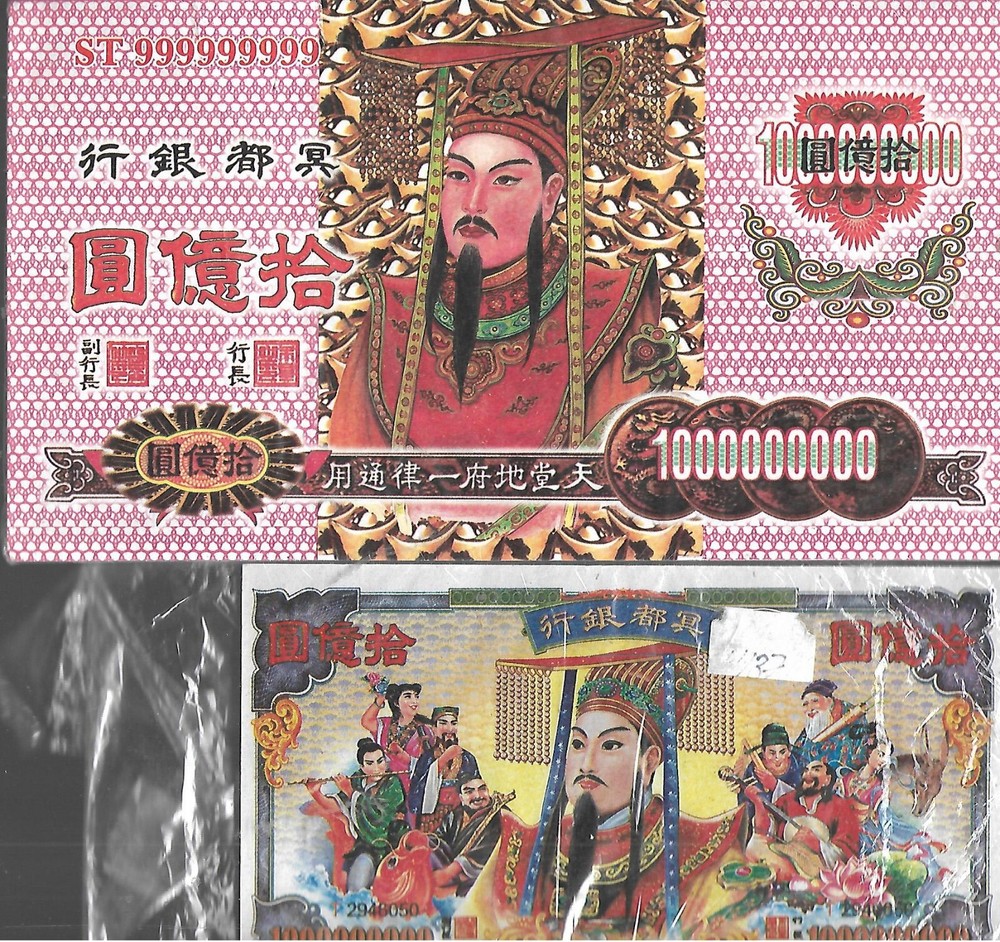 WORLDWIDE CURRENCY Chinese " Heaven Banknotes" (2 Packs of ~22** Banknote). Proof That You CAN Take it With You. Featuring the Daoist Deity, Yuk Won (Jade Emperor). All Hell Banknote in This Lot are in NEW Condition - In Package **Quantity may vary by a Banknote or Two, as They are Packaged by Weight, Rather Than an Actual Count. A Description of the 2 Varieties in this Lot Follows Below: # 1) Package of 9" X 5" Bank of Heaven Banknotes H$1,000,000,000 # 2) Package of 7" X 3.75" Bank of Universe Banknotes H$1,000,000,000 SORRY, WE CAN NOT GUARANTEE THE EXCHANGE RATE IN HELL at ANY GIVEN TIME SHIPPING FEES ARE COMBINED IN THE CASE OF MULTIPLE ITEM PURCHASES.
