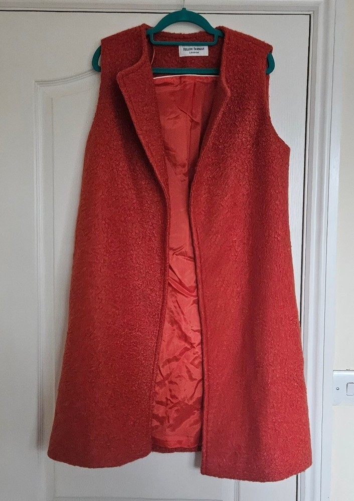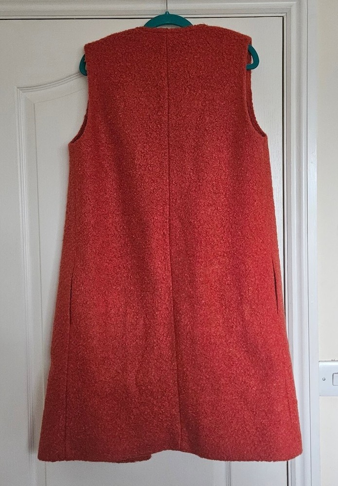 This waistcoat is a stylish and practical addition to any wardrobe! The sunset orange color is vibrant and eye-catching, while the boucle texture adds a luxurious touch. The open front and sleeveless design make it easy to layer, and the pockets are a handy feature. The mid-length cut and full lining give it a polished, put-together look. Perfect for dressing up or down—love it!