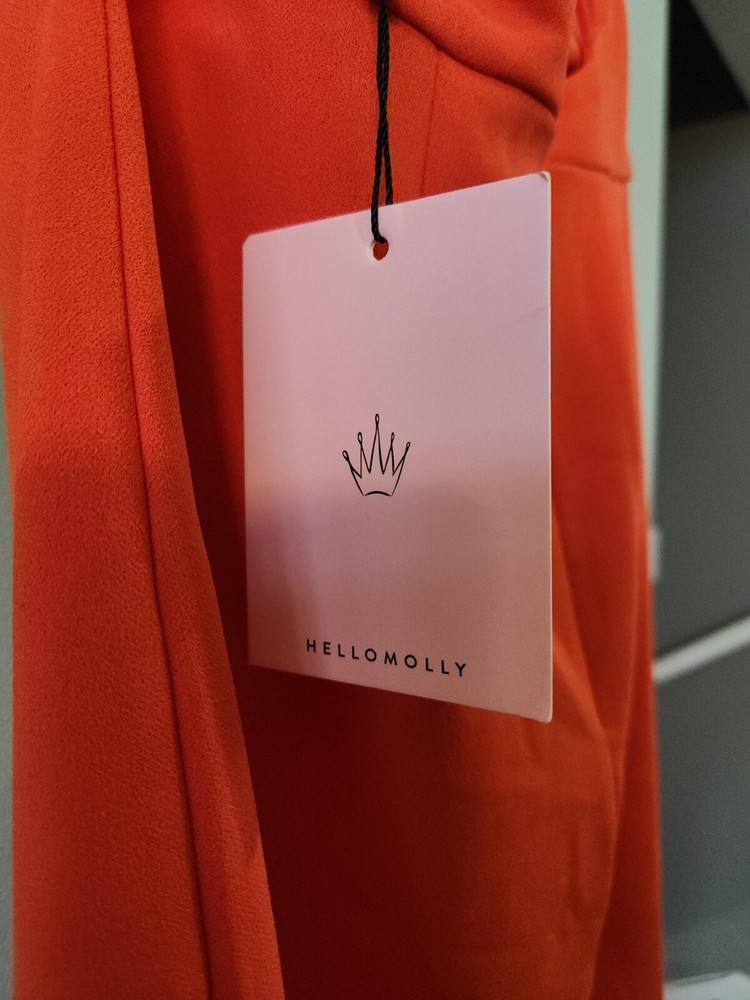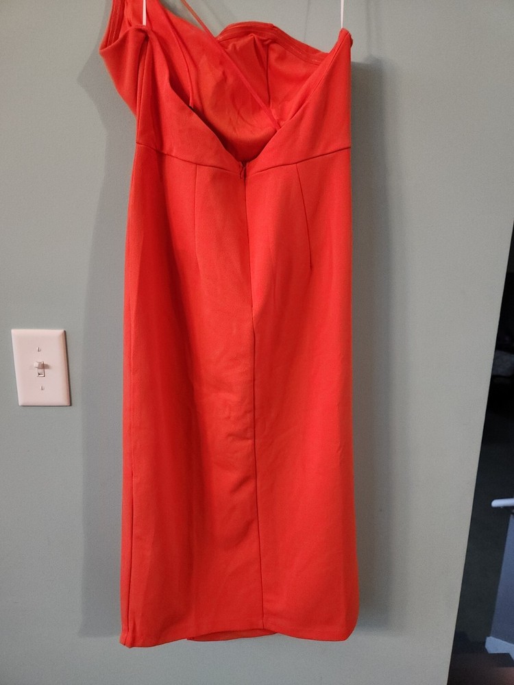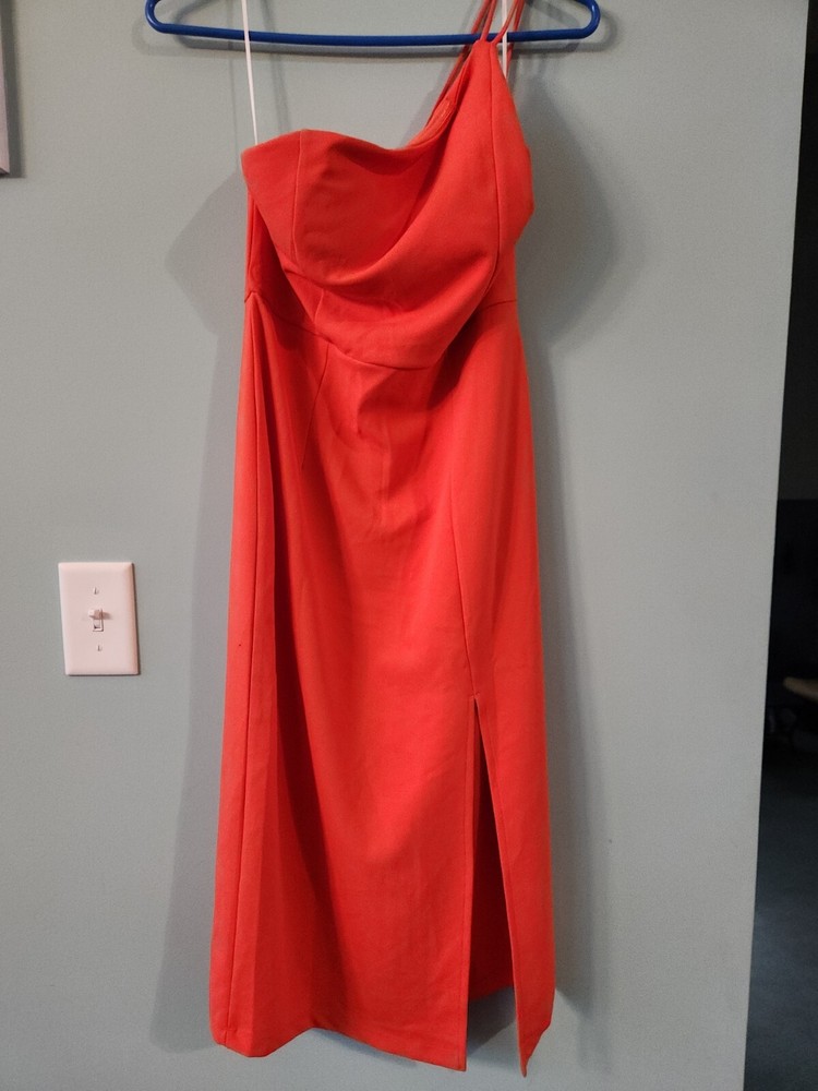 Slit up left leg. Left shoulder double spaghetti strap. Beautiful bright orange. Sells for $65 on Hello Molly's website. Zips up back. No slip grip at bust....