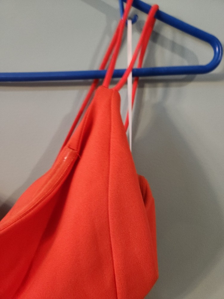 Slit up left leg. Left shoulder double spaghetti strap. Beautiful bright orange. Sells for $65 on Hello Molly's website. Zips up back. No slip grip at bust.