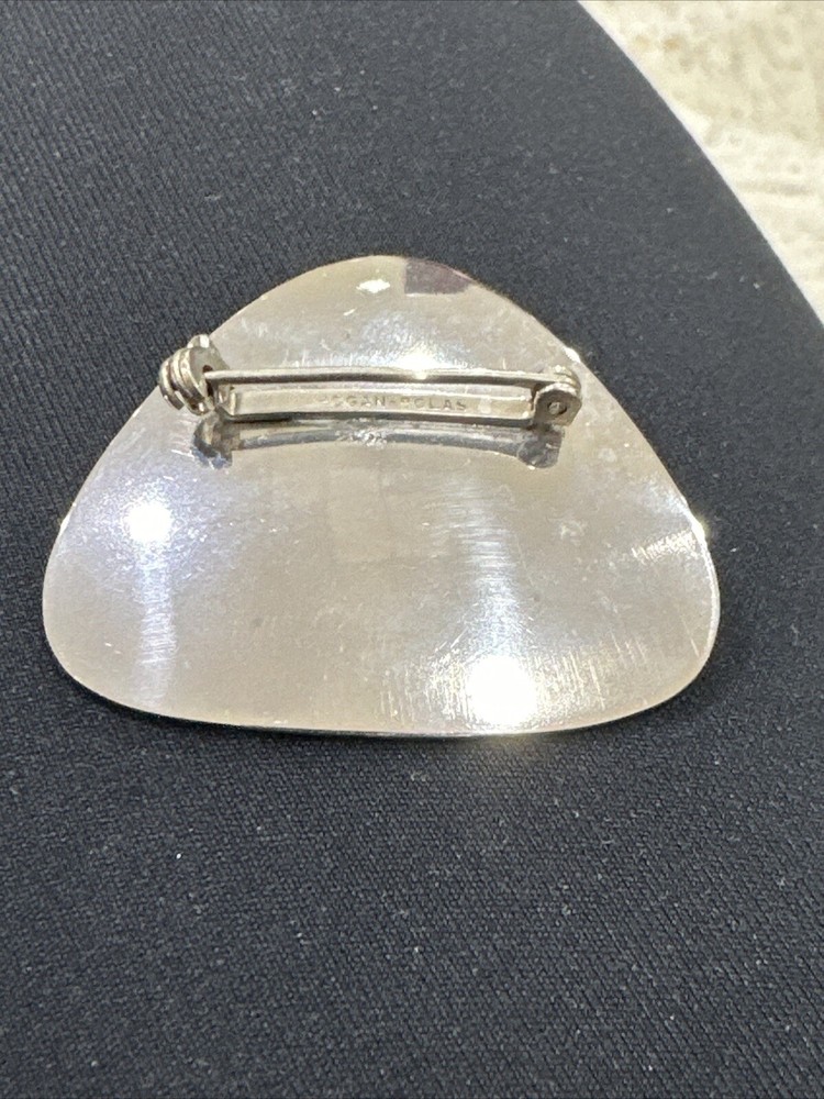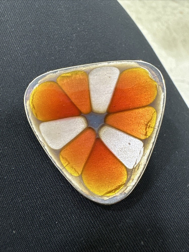 Add a touch of vintage beauty to your outfit with this stunning Hogan Bolas Brooch. The bright orange and white enamel flower design is perfect for a summer day out. The brooch is signed and features a flush setting style. Measuring at 1.5 inches in length, this piece is a great gift for Mother's Day, graduation, friendship, or birthday. The brooch is made of silver tone metal and has no stone. This original piece from the 1950s is a great addition to any collection and is sure to make a statement.