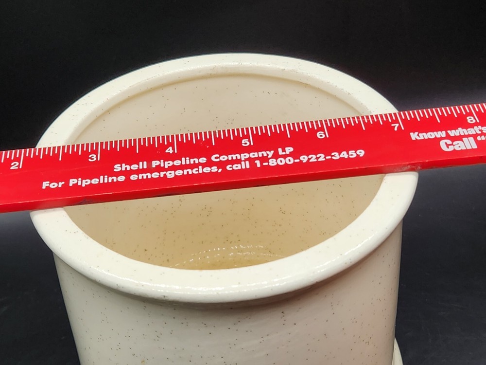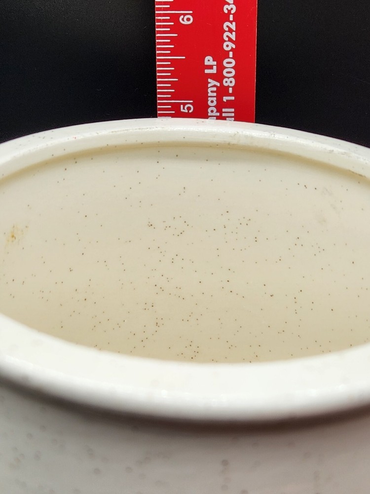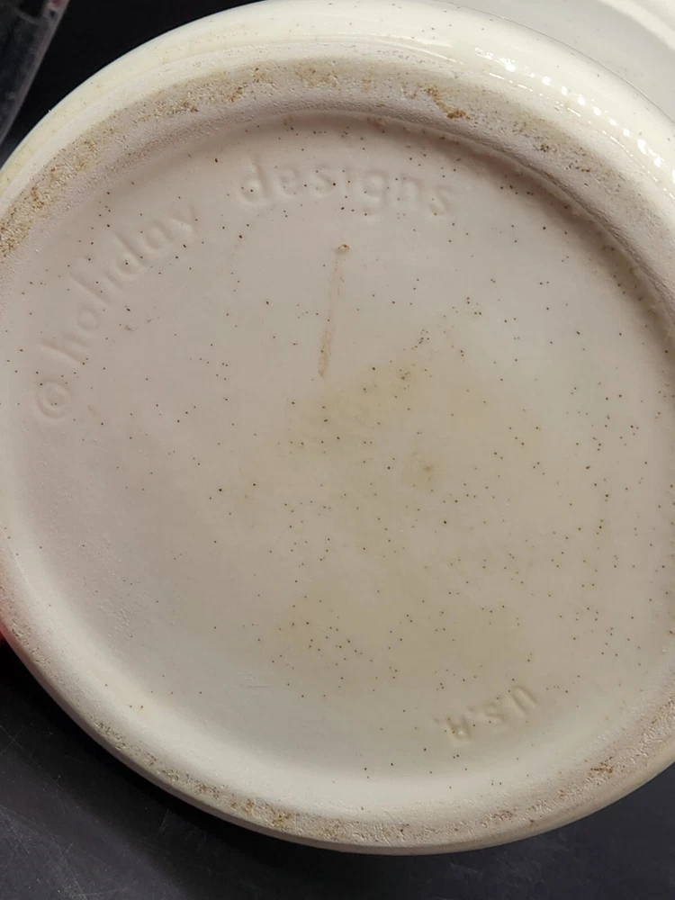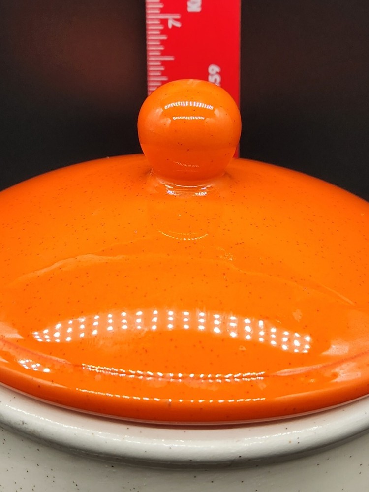 This vintage ceramic canister from Holiday Designs is a charming addition to any kitchen. Featuring a bright orange color and round shape, this medium-sized canister comes with a lid and has a height of 6.5 inches. The canister is a great piece for collectors, with a vintage/retro style and original design from the 1970s. Made with ceramic and porcelain materials, this canister is durable and perfect for storing kitchen items like sugar, flour or coffee. It is an original piece from the United States and comes from the kitchen storage and organization category. The canister is perfect for the holiday season, with a fun holiday theme and a touch of nostalgia.
