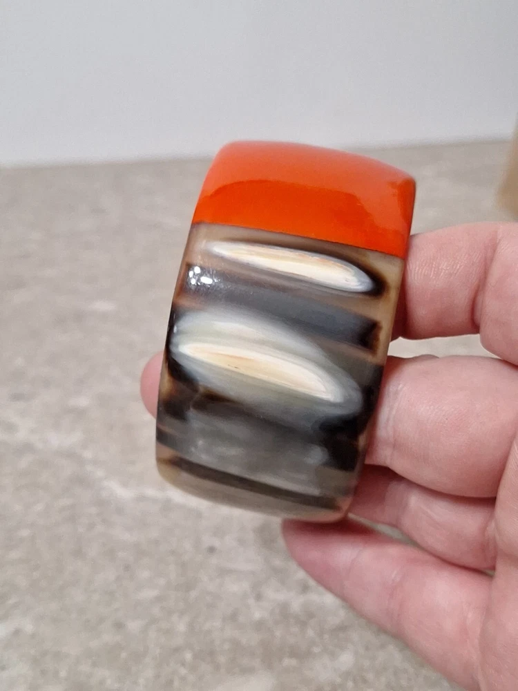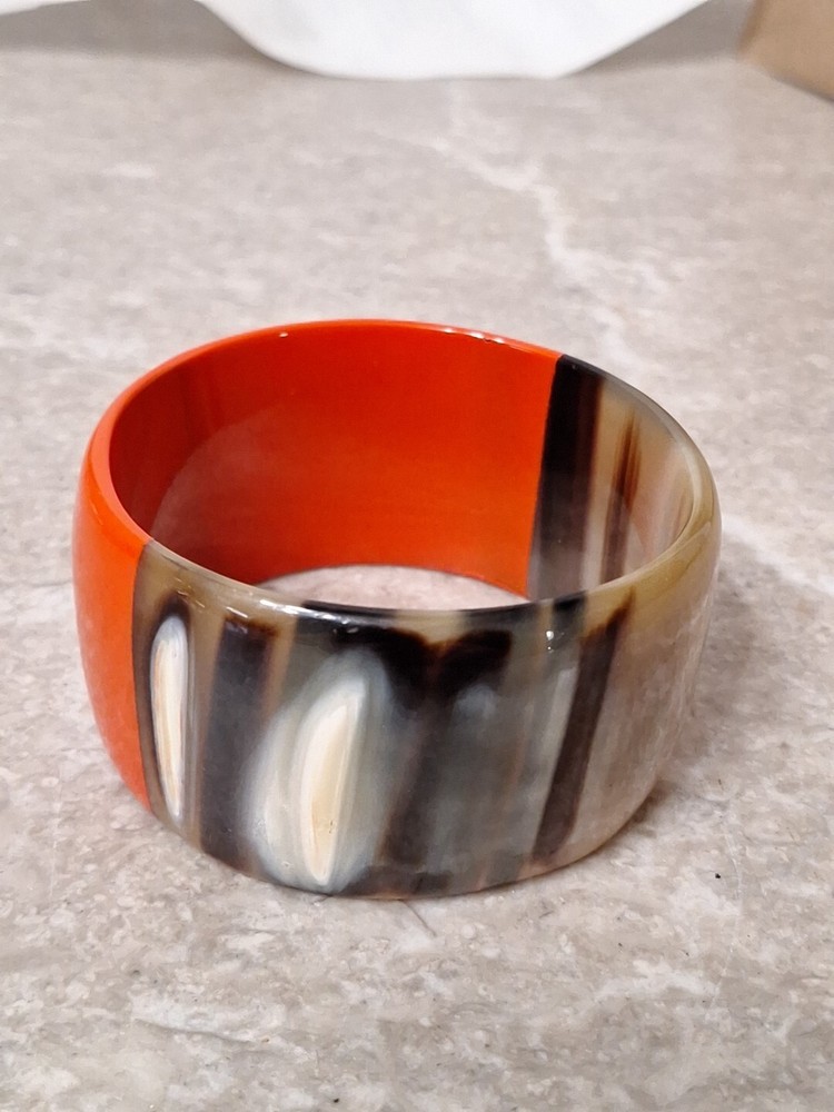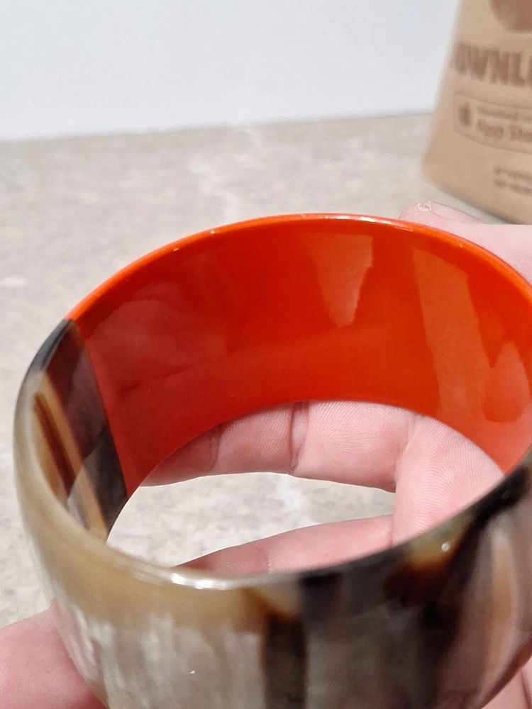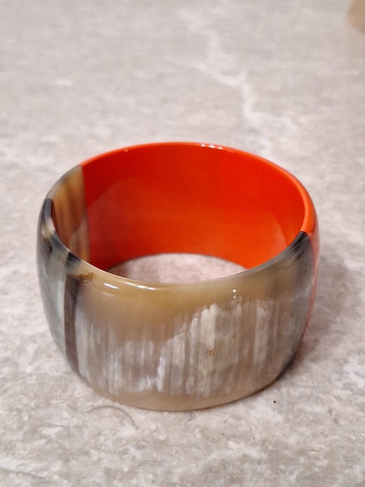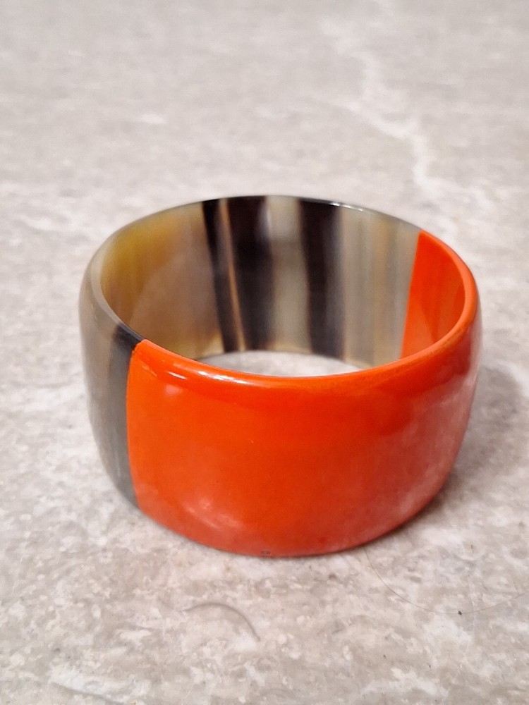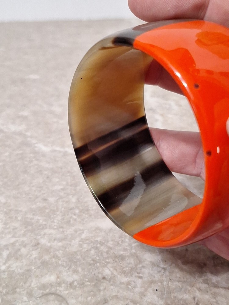 Bracelet is in very good condition. There are 2 small chips in the orange paint. It is 40mm wide. The opening is 64mm wide, just over 2.5 inches. It is a really nice example of an old horn bracelet....